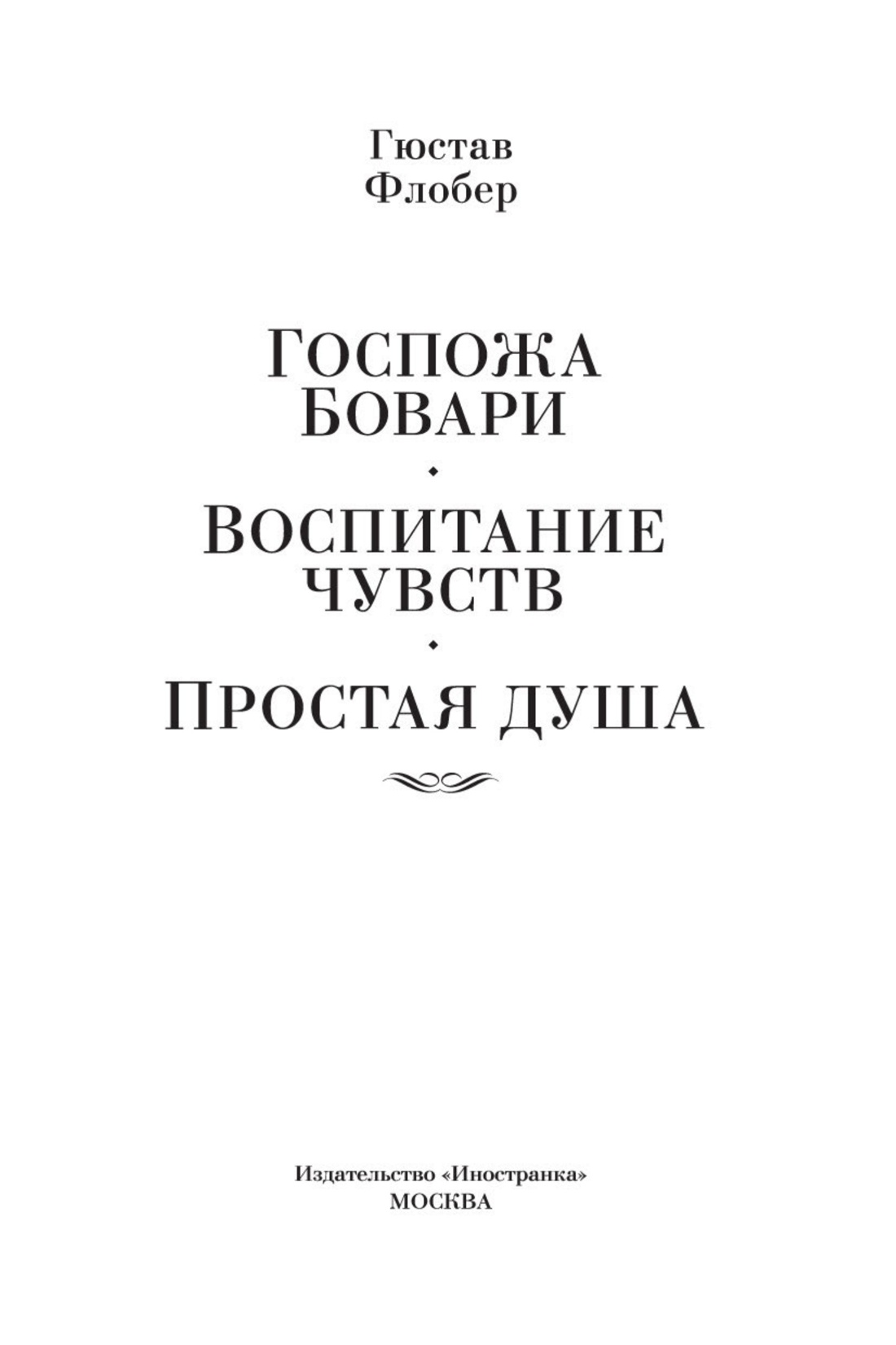 В настоящий сборник вошли два главных романа Флобера — «Госпожа Бовари» и «Воспитание чувств», а также очаровательная повесть «Простая душа». Эти произведения объединяет не только совершенный стиль автора, но и особая атмосфера, незаметно превращающая непритязательные на первый взгляд сюжеты в романтические сказки, где, по словам Набокова, «проза берет на себя обязанности поэзии».