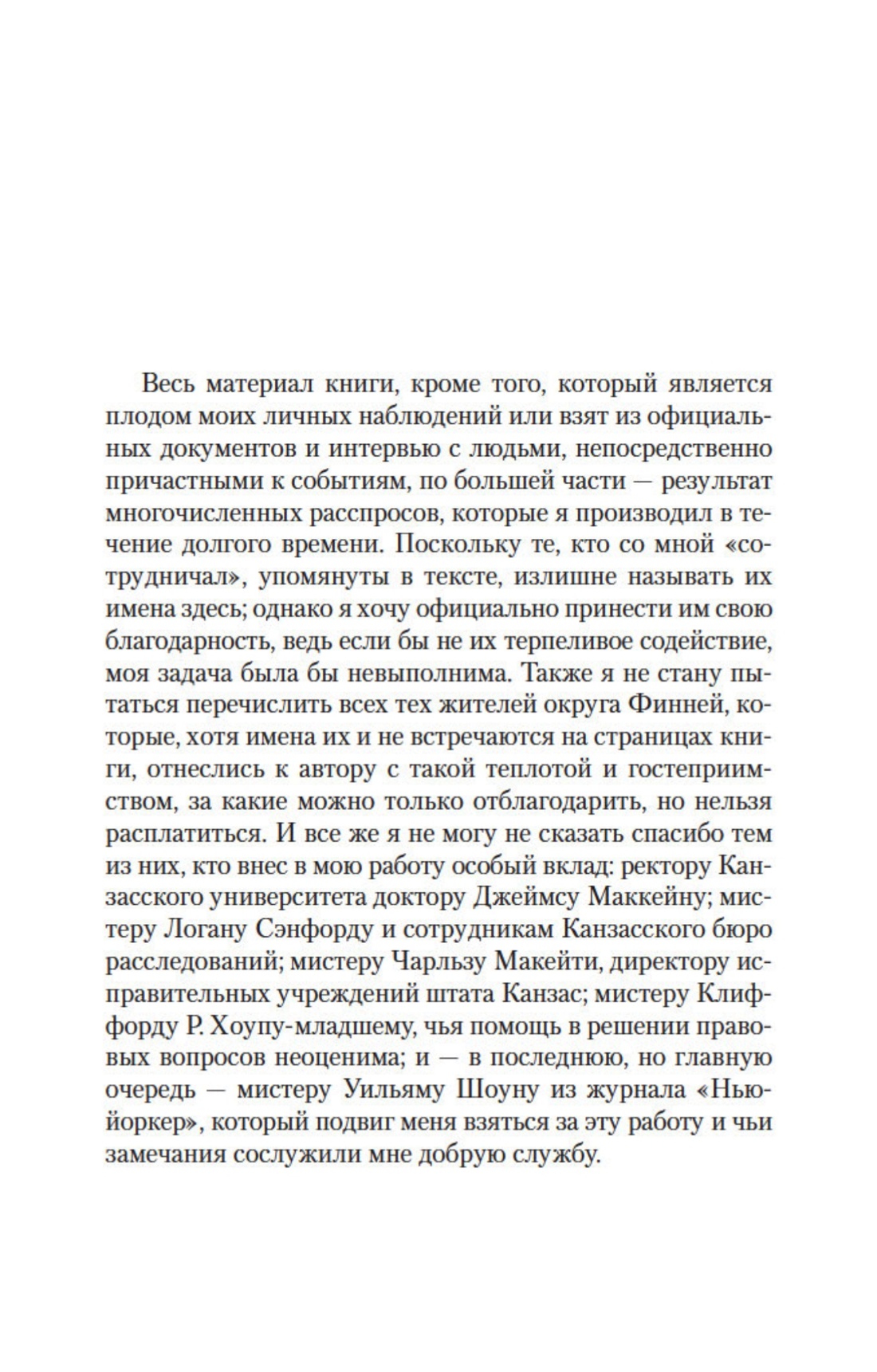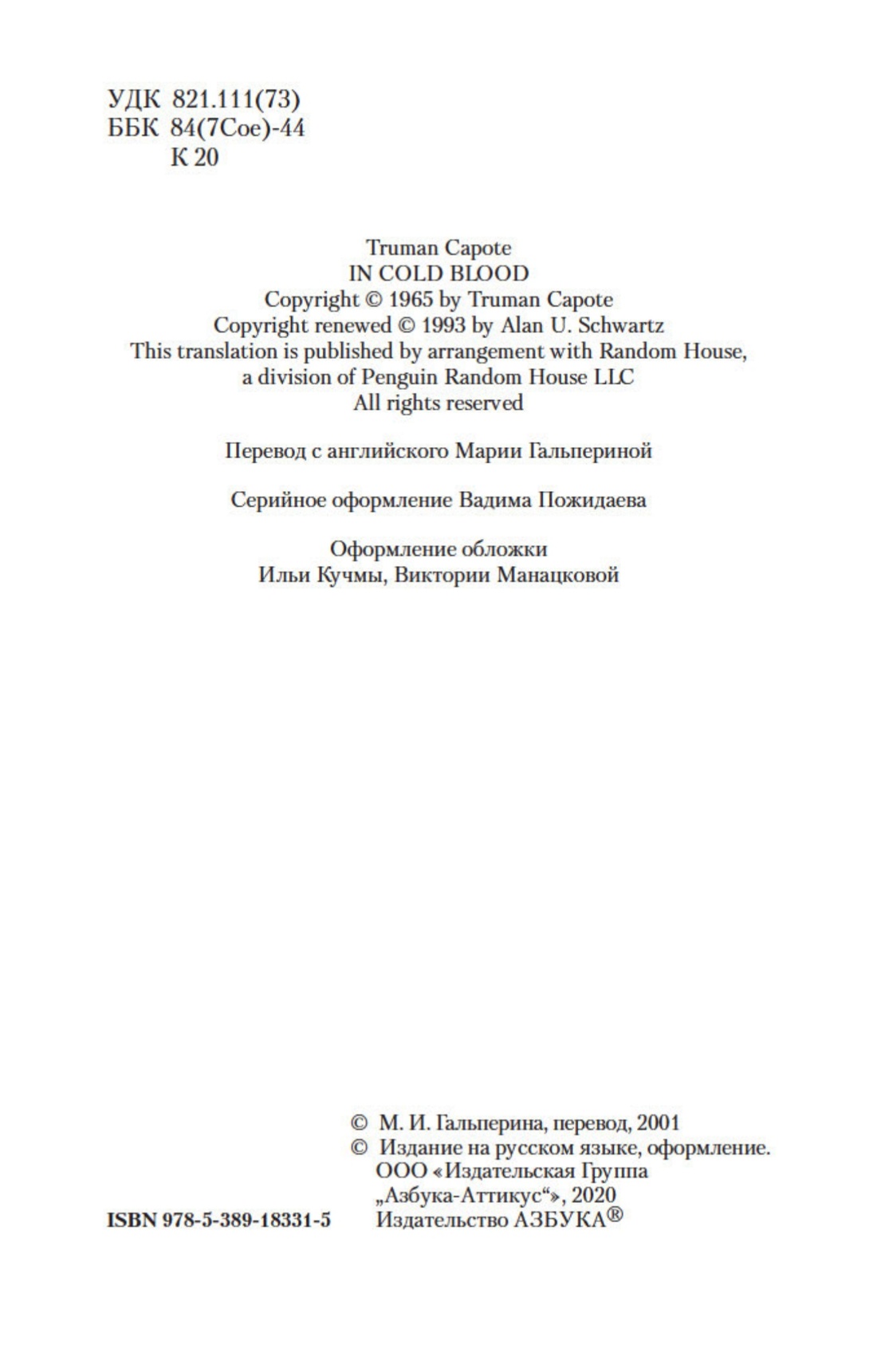 Трумен Капоте, автор таких бестселлеров, как «Завтрак у Тиффани» (повесть, прославленная в 1961 году экранизацией с Одри Хепберн в главной роли), «Голоса травы», «Другие голоса, другие комнаты», «Призраки в солнечном свете» и другие, входит в число крупнейших американских прозаиков XX века. Самым значительным произведением Капоте многие считают роман «Хладнокровное убийство», основанный на истории реального преступления и раскрывающий природу насилия как сложного социального и психологического феномена. Кни га Капоте, мгновенно ставшая бестселлером, породила особый жанр «романа-репортажа» и открыла путь прозе Нормана Мейлера и Тома Вулфа. Взвешенность и непредубежденность авторской позиции, блестящая выверенность стиля, полифоничность изображения сделали роман Капоте образцом документально-художественной литературы; в списке 100 лучших книг XX века по версии газеты The Guardian «Хладнокровное убийство» заняло 84-ю позицию. Одноименная экранизация Ричарда Брукса, выпущенная сразу после публикации романа Капоте, была номинирована на четыре «Оскара».