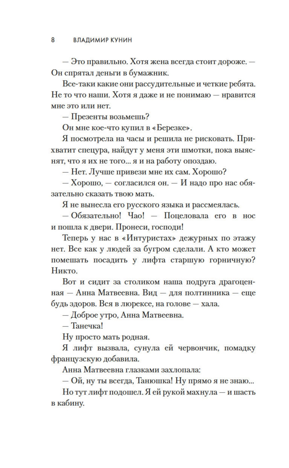 Слово «интердевочка» вошло в наш язык с легкой руки Владимира Кунина, который рассказал историю валютной проститутки Тани Зайцевой, которая очень любила свою маму, учительницу литературы, и город Ленинград, где жила, но очень хотела уехать из СССР, где все построено на лжи и унижении. Повесть была опубликована в журнале «Аврора» в 1988 году и стала сенсацией. Сегодня, спустя, почти сорок лет, она отлично читается, герои по-прежнему интересны и вызывают сочувствие, а неповторимый кунинский стиль, интонации, словечки все так же привлекают очаровывают.