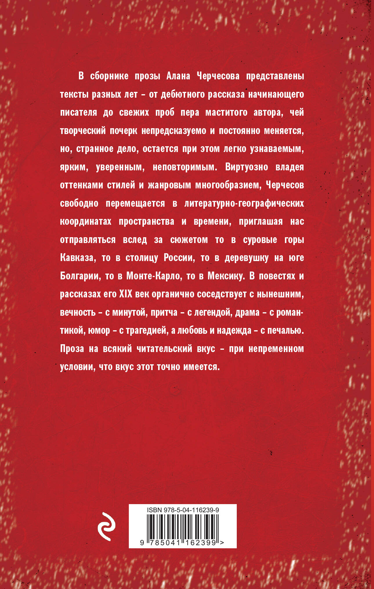В сборнике прозы Алана Черчесова представлены тексты разных лет — от дебютного рассказа начинающего писателя до свежих проб пера маститого автора, чей творческий почерк непредсказуемо и постоянно меняется, но, странное дело, остается при этом легко узнаваемым, ярким, уверенным, неповторимым. Виртуозно владея оттенками стилей и жанровым многообразием, Черчесов свободно перемещается в литературно-географических координатах пространства и времени, приглашая нас отправляться вслед за сюжетом то в суровые горы Кавказа, то в столицу России, то в деревушку на юге Болгарии, то в Монте-Карло, то в Мексику. В повестях и рассказах его XIX век органично соседствует с нынешним, вечность — с минутой, притча — с легендой, драма — с романтикой, юмор — с трагедией, а любовь и надежда — с печалью. Проза на всякий читательский вкус — при непременном условии, что вкус этот точно имеется.