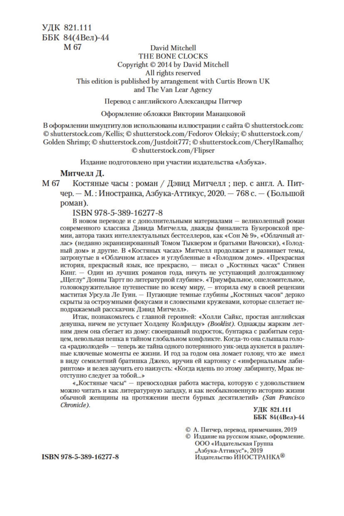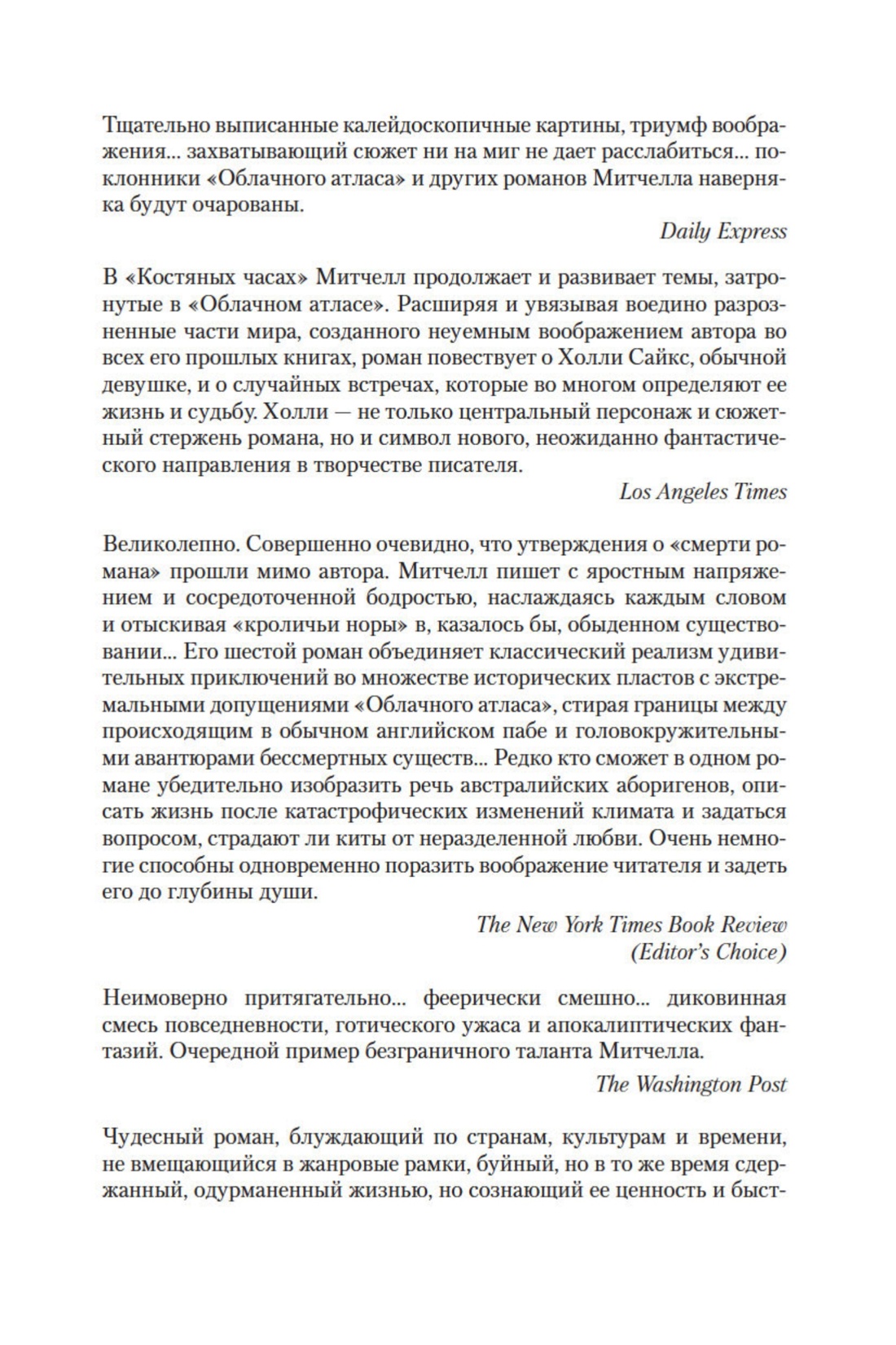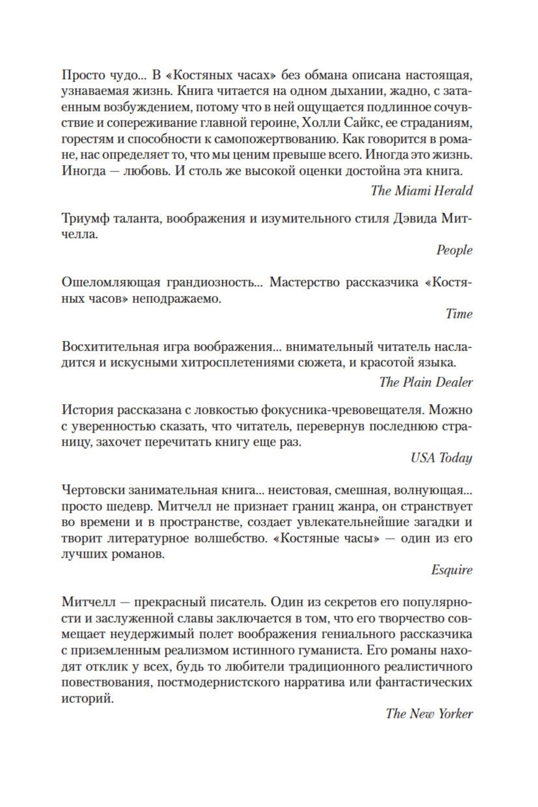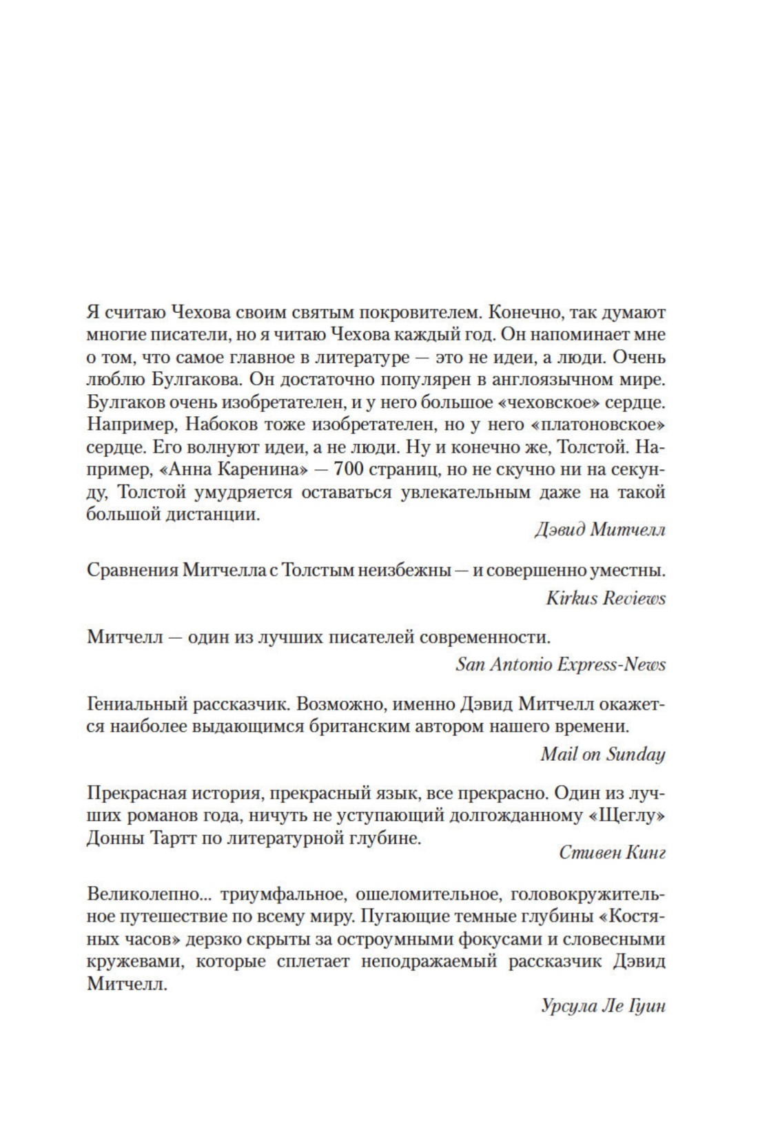 В новом переводе — великолепный роман современного классика Дэвида Митчелла, дважды финалиста Букеровской премии, автора таких интеллектуальных бестселлеров, как «Сон №9», «Облачный атлас» (недавно экранизированный Томом Тыквером и братьями Вачовски), «Голодный дом» и другие. В «Костяных часах» Митчелл продолжает и развивает темы, затронутые в «Облачном атласе» и углубленные в «Голодном доме». «Прекрасная история, прекрасный язык, все прекрасно, — писал о “Костяных часах” Стивен Кинг. — Один из лучших романов года, ничуть не уступающий долгожданному “Щеглу” Донны Тартт по литературной глубине». «Триумфальное, ошеломительное, головокружительное путешествие по всему миру, — вторила ему в своей рецензии маститая Урсула Ле Гуин. — Пугающие темные глубины “Костяных часов” дерзко скрыты за остроумными фокусами и словесными кружевами, которые сплетает неподражаемый рассказчик Дэвид Митчелл».