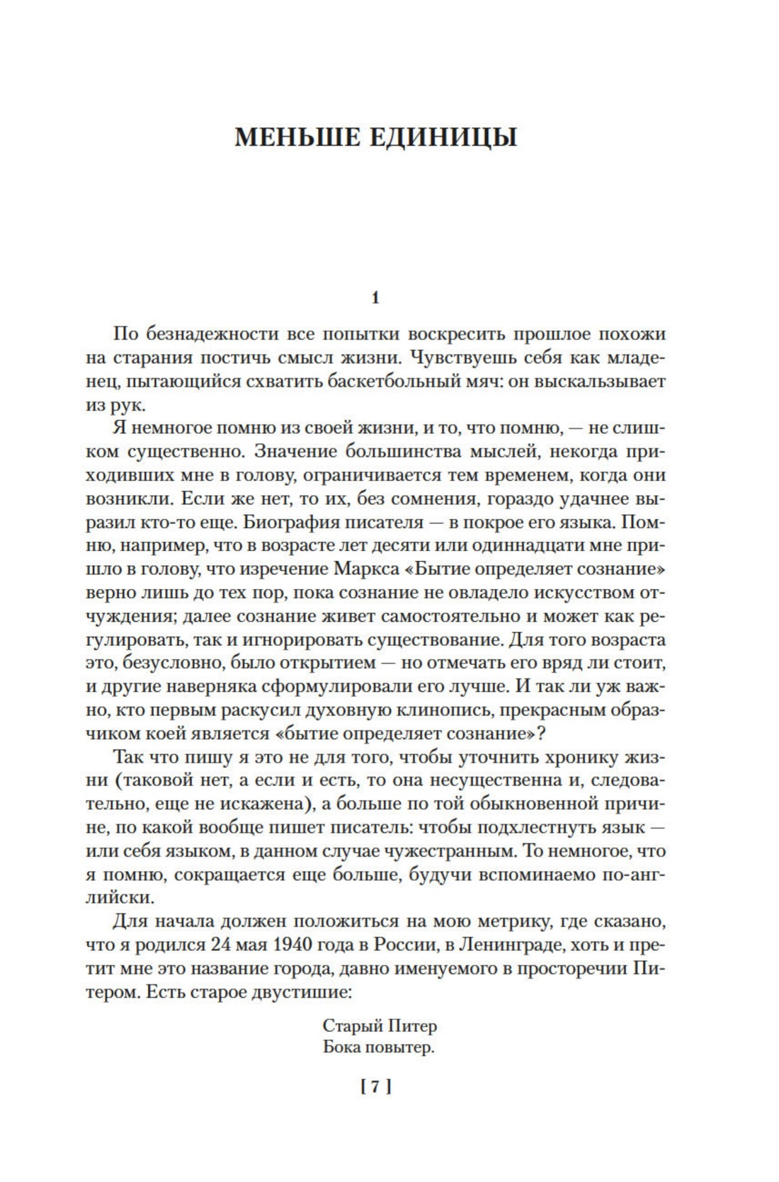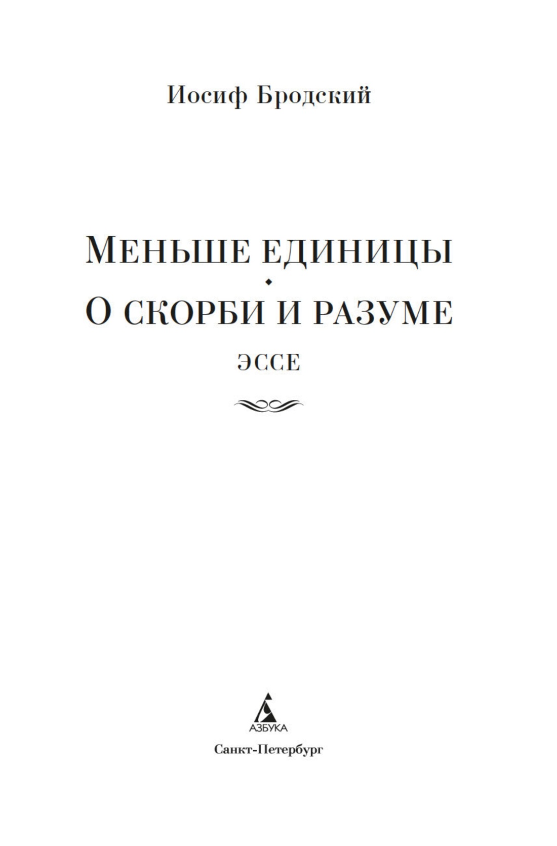 В настоящее издание вошли сборники эссе Иосифа Бродского «Меньше единицы» («Less Than One») и «О скорби и разуме» («On Grief and Reason»), составленные самим автором. Большинство эссе были написаны по-английски и лишь несколько из них — на русском. В интервью по случаю присуждения ему Нобелевской премии Бродский назвал себя «русским поэтом и английским эссеистом». Сборник «Меньше единицы» был издан в 1986 году в Нью-Йорке и тогда же удостоен премии Национального совета критиков США; сборник «О скорби и разуме» вышел свет в 1995 году и стал последней книгой Бродского, напечатанной при его жизни. В приложении публикуются несколько эссе разных лет, не входивших в авторские сборники, в том числе «Набережная Неисцелимых».