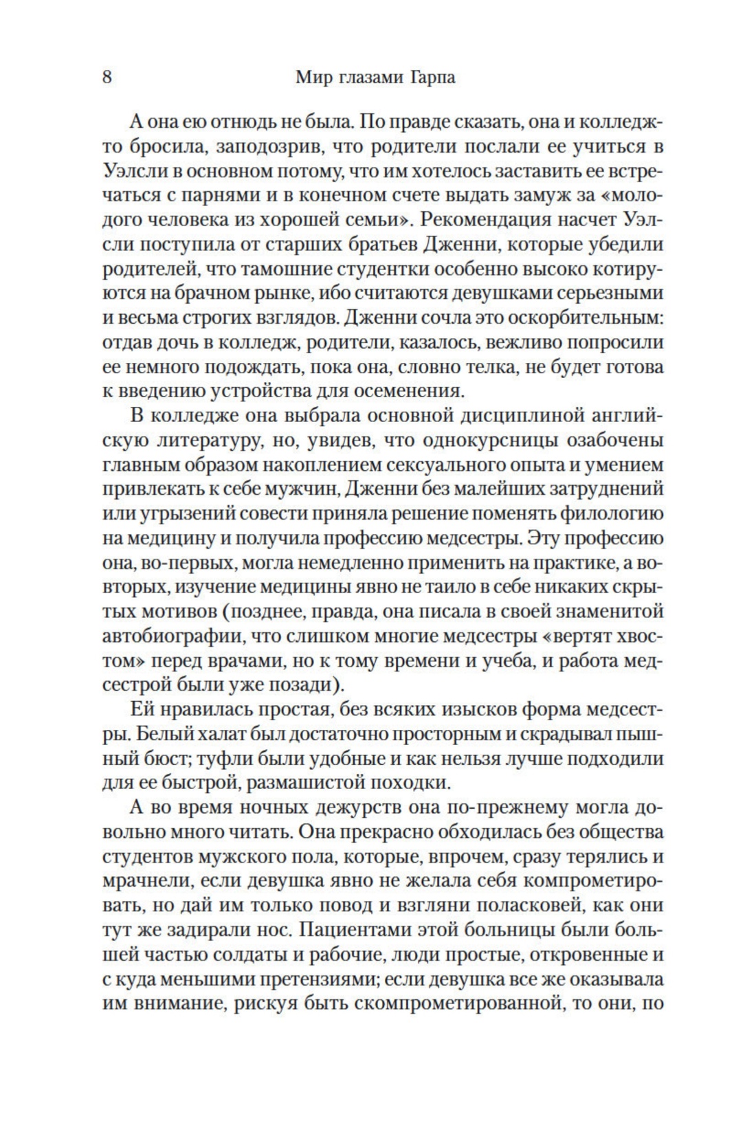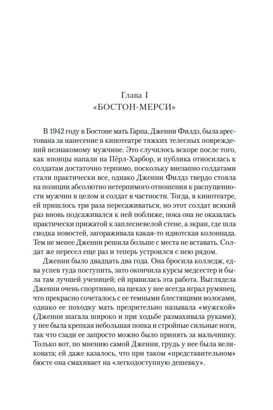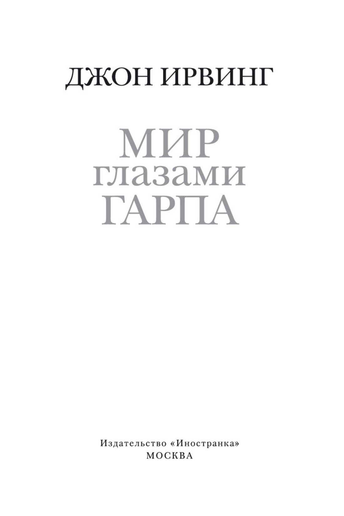 Трагикомическая сага от знаменитого автора «Отеля Нью-Гэмпшир» и «Правил виноделов», «Мужчин не ее жизни» и «Последней ночи у Извилистой реки», «Сына цирка» и «Молитвы об Оуэне Мини», панорамный бурлеск, сходный по размаху с «Бойней номер пять» Курта Воннегута или «Уловкой-22» Джозефа Хеллера. Именно «Мир глазами Гарпа» сделал Ирвинга современным классиком; роман был удостоен премии Национального книжного фонда, входил в шортлист Национальной книжной премии США, а также, по упорным слухам, и в шортлист Пулицеровской премии (оглашать Пулицеровские шортлисты начали ровно со следующего премиального года). «Мир глазами Гарпа» — это современная сага о семье, живущей в нашем беспощадном мире, члены которой пытаются, каждый по-своему и с переменным успехом, обрести гармонию. Главный герой романа — писатель, скандально знаменитый как своими книгами, так и обстоятельствами своего появления на свет; его произведения, реалистичные и абсурдные, вплетены в ткань романа. Сам автор точнее всего определил отношение будущих читателей к книге: «Она, возможно, вызовет порой улыбку даже у самого мрачного типа, однако разобьет немало чересчур нежных сердец».
