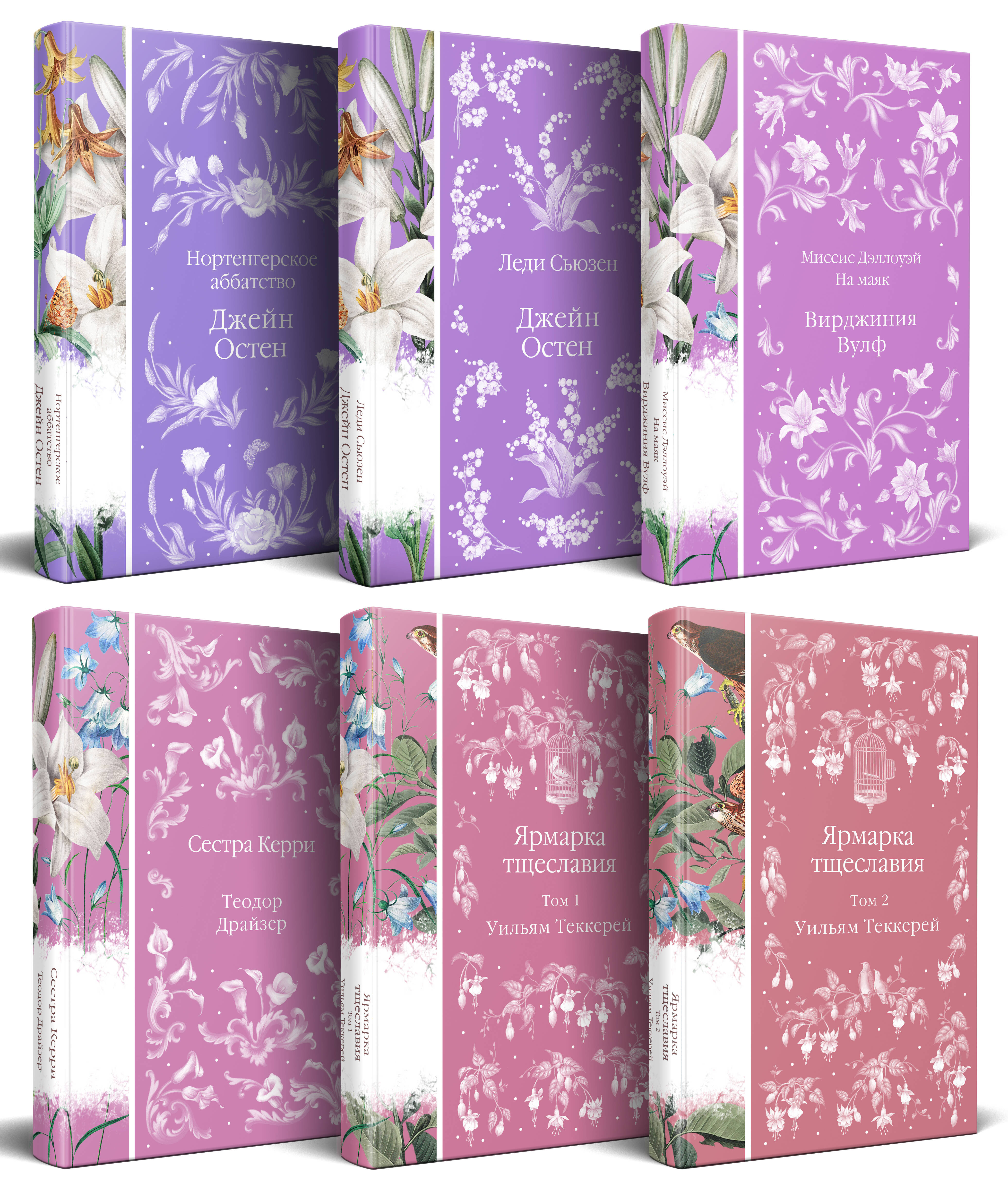 В комплект вошли «Нортенгерское аббатство», «Леди Сьюзен», «Миссис Дэллоуэй. На маяк», «Сестра Керри» и «Ярмарка тщеславия» в двух томах — шесть классических романов, которые приятно читать и приятно дарить.