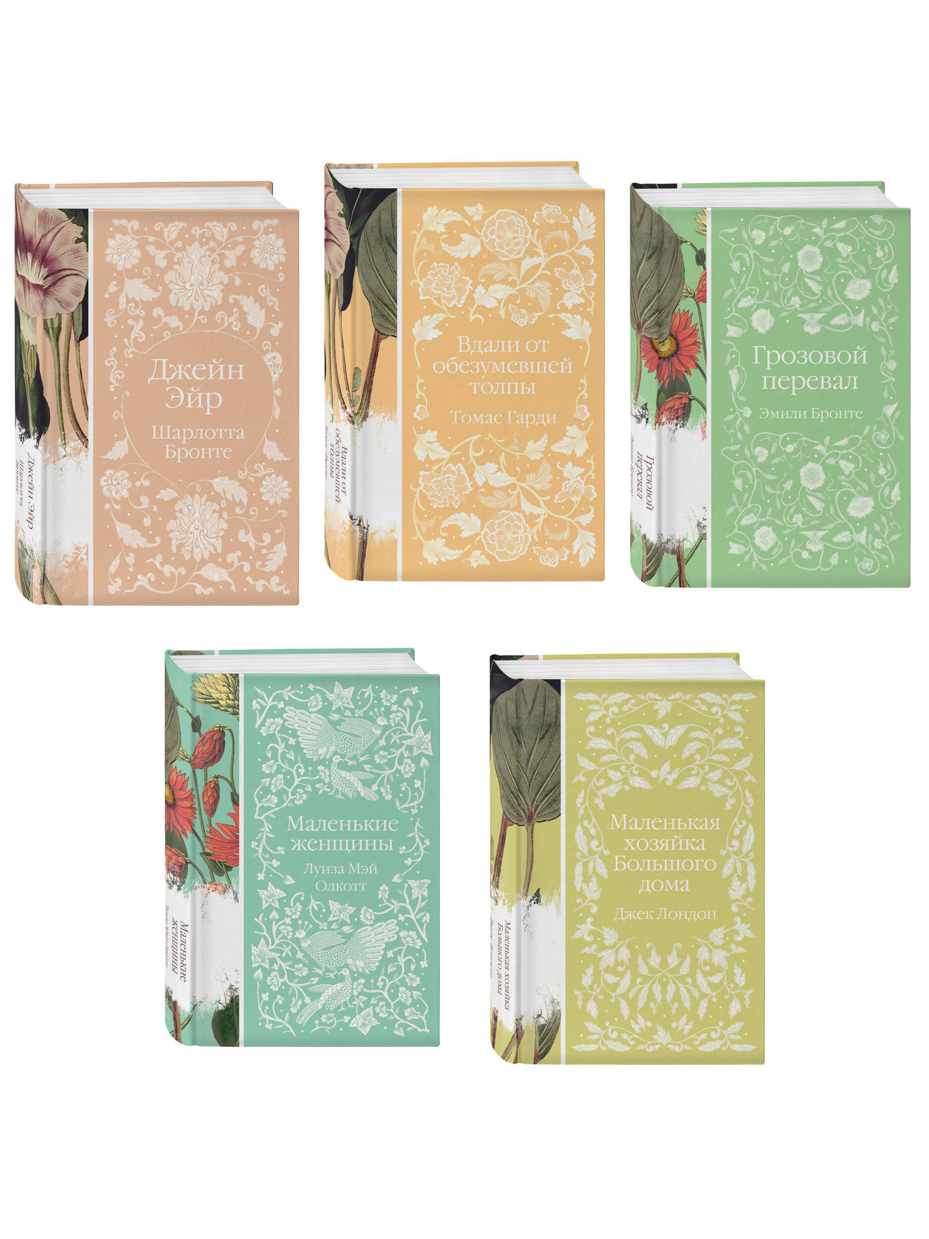 В комплект вошли «Джейн Эйр», «Вдали от обезумевшей толпы», «Маленькая хозяйка большого дома», «Грозовой перевал» и «Маленькие женщины» — пять классических женских романов, которые приятно читать и приятно дарить.
