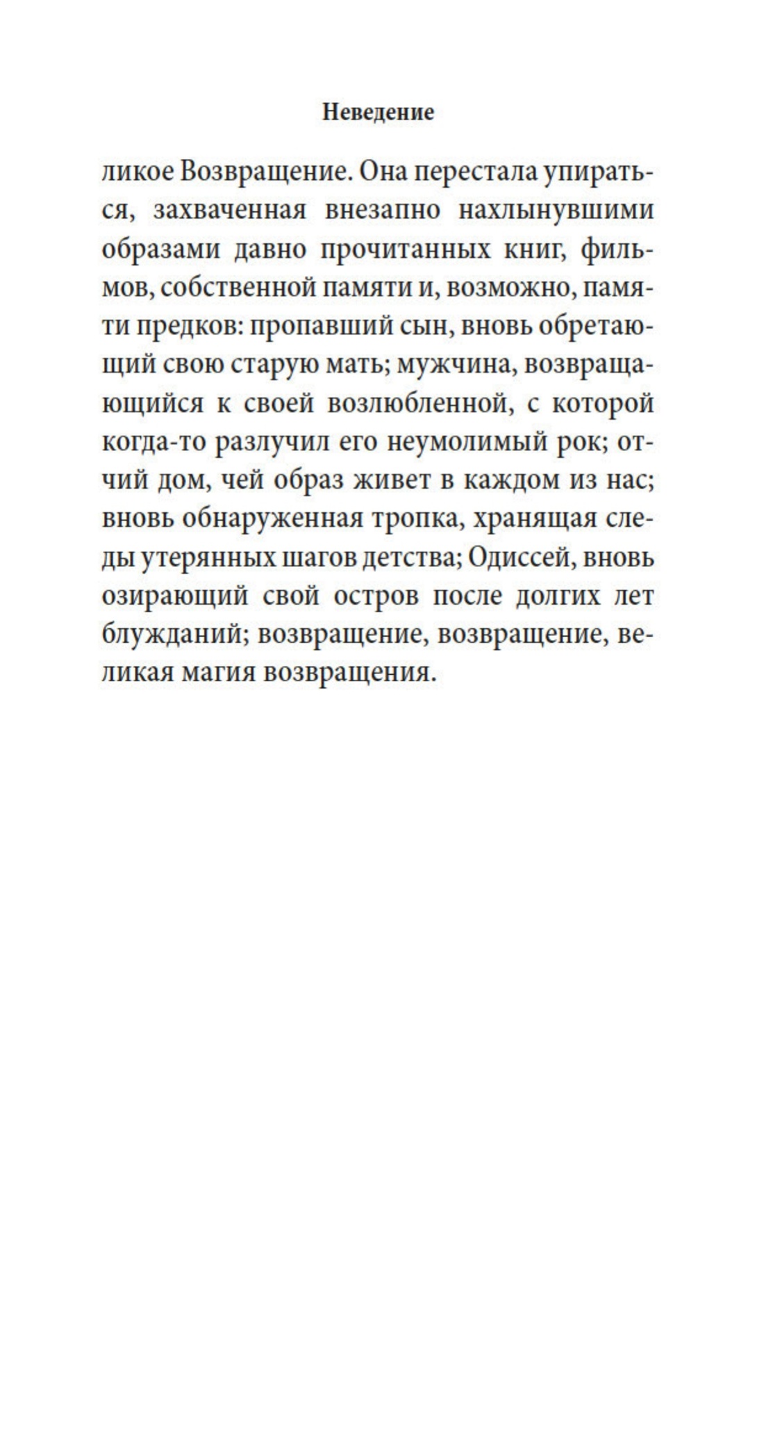 Возвращение — один из основных сюжетов мировой литературы, и всякая одиссея развивается предсказуемо... впрочем, не всегда. Герои романа одного из крупнейших писателей современности Милана Кундеры «Неведение» возвращаются в Чехию после эмиграции — после многих лет тягот, счастья, потерь, компромиссов, новых переживаний и воспоминаний, которые непостижимы и не интересны никому на родине. Как работает память? Из чего строятся надежды? Что такое подлинная честность? Кто возвращается к Пенелопе и знает ли она человека, который к ней вернулся? Те, кто уехал; те, кто повстречался им в пути; те, кто остался, — Кундера вглядывается в человеческие судьбы с беспримерной проницательностью и талантом к сочувственному пониманию.