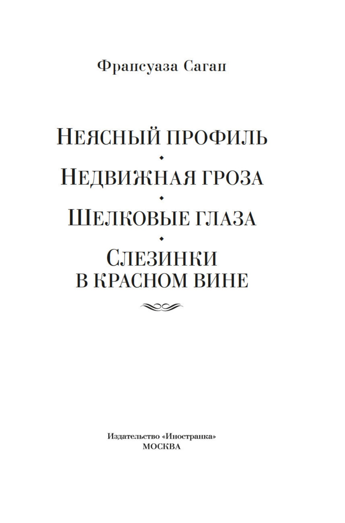 Брак оказывается ловушкой, любовь — желанием владеть, дружеская поддержка — стремлением к контролю в «Неясном профиле». Страстная и яростная любовная драма разворачивается в утонченной обстановке 1830-х, между балами, пикниками и чаепитиями в единственной у Саган исторической драме, романе «Недвижная гроза», отсылающем к традициям Стендаля. В «Шелковых глазах» и «Слезинках в красном вине» сюжеты калейдоскопически сменяют друг друга — эти элегантные истории роднят Саган с Мопассаном. Есть голоса, в которых звенит подлинная жизнь, сколько бы десятилетий ни прошло, и таков голос Франсуазы Саган.