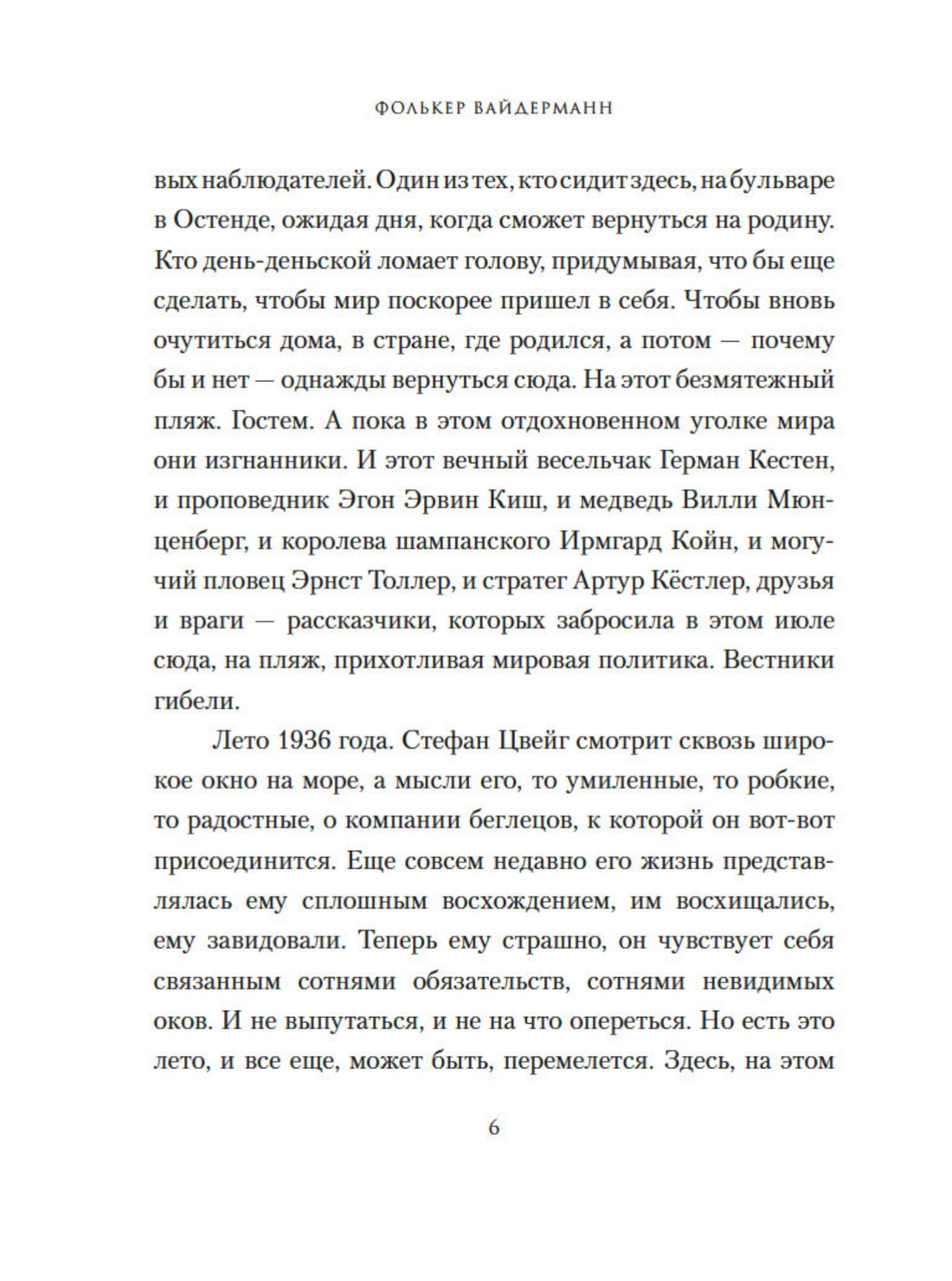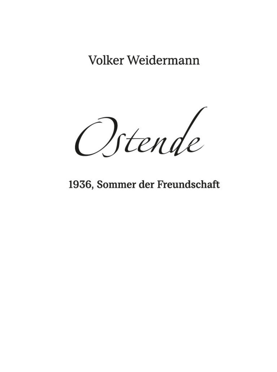 Биографический роман «Остенде. 1936 год: лето дружбы и печали» появился в 2014 году. Остенде – блистательный морской курорт, на котором в 1936 году собрались писатели, журналисты, издатели, поэты – Стефан Цвейг и Йозеф Рот, Артур Кестлер и Эрнст Толлер - все те, кому нет места в национал-социалистической Германии. Солнце, море, напитки. Это могло бы стать просто отдыхом с друзьями. Если бы не политическая ситуация, которая ухудшается с каждым днем, если бы их всех не преследовали, если бы их книги не были запрещены, если бы они не потеряли Родину. Поэты в бегах, писатели в изгнании. Фолькер Вайдерманн точно и проникновенно рассказывает историю того удивительного лета незадолго до Второй мировой войны, когда цвет немецкой творческой интеллигенции празднует жизнь (у большинства из них она скоро оборвется), как это могут делать только полностью отчаявшиеся люди.