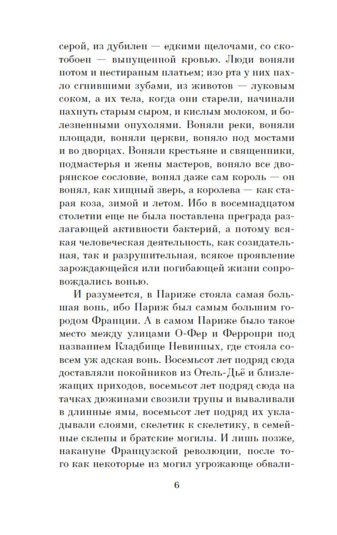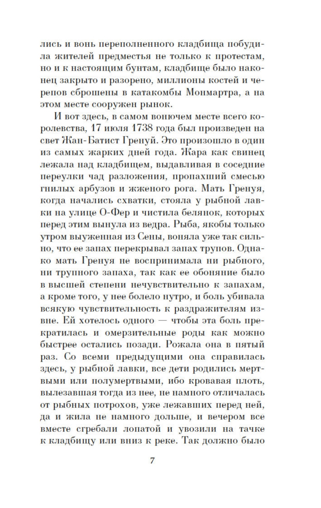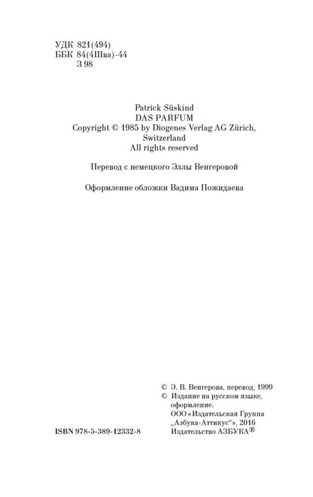 Блистательный и загадочный «Парфюмер» Патрика Зюскинда был впервые напечатан в Швейцарии в 1985 году. Сегодня он признан самым знаменитым романом, написанным на немецком языке со времен «На Западном фронте без перемен» Ремарка, издан общим тиражом более 12 миллионов экземпляров, переведен на 47 языков, включая латынь, и, наконец, экранизирован. Фильм, вышедший в мировой прокат в 2006 году, имел огромный успех, а его создатели получили шесть наград Германской киноакадемии. Сегодня победное шествие Жан-Батиста Гренуя — великолепного всепобеждающего монстра — продолжается. Несомненно, этот захватывающий романтический детектив, уже ставший классикой, еще долго будет будоражить, притягивать и интриговать читателей самых разных пристрастий и вкусов.