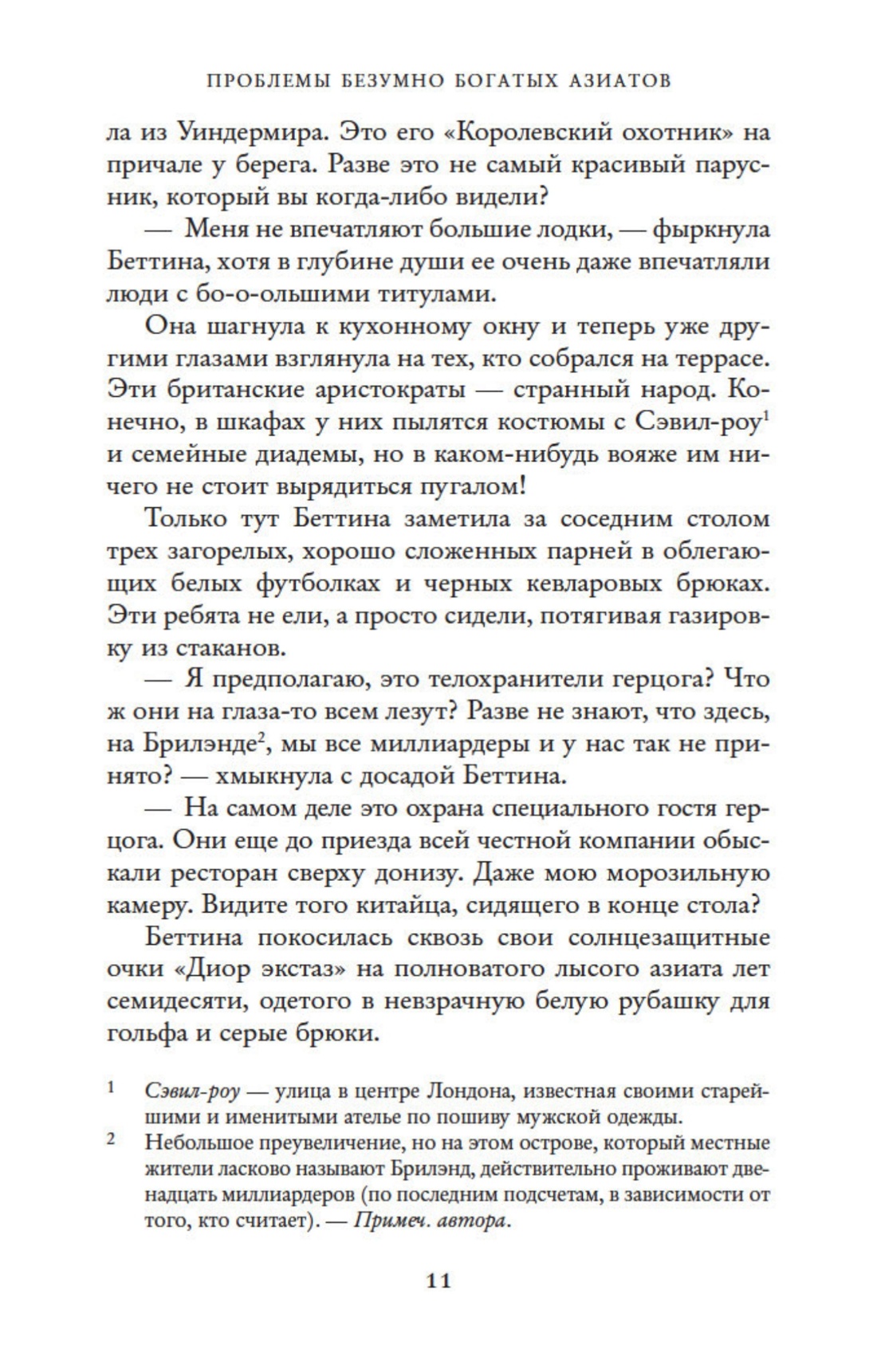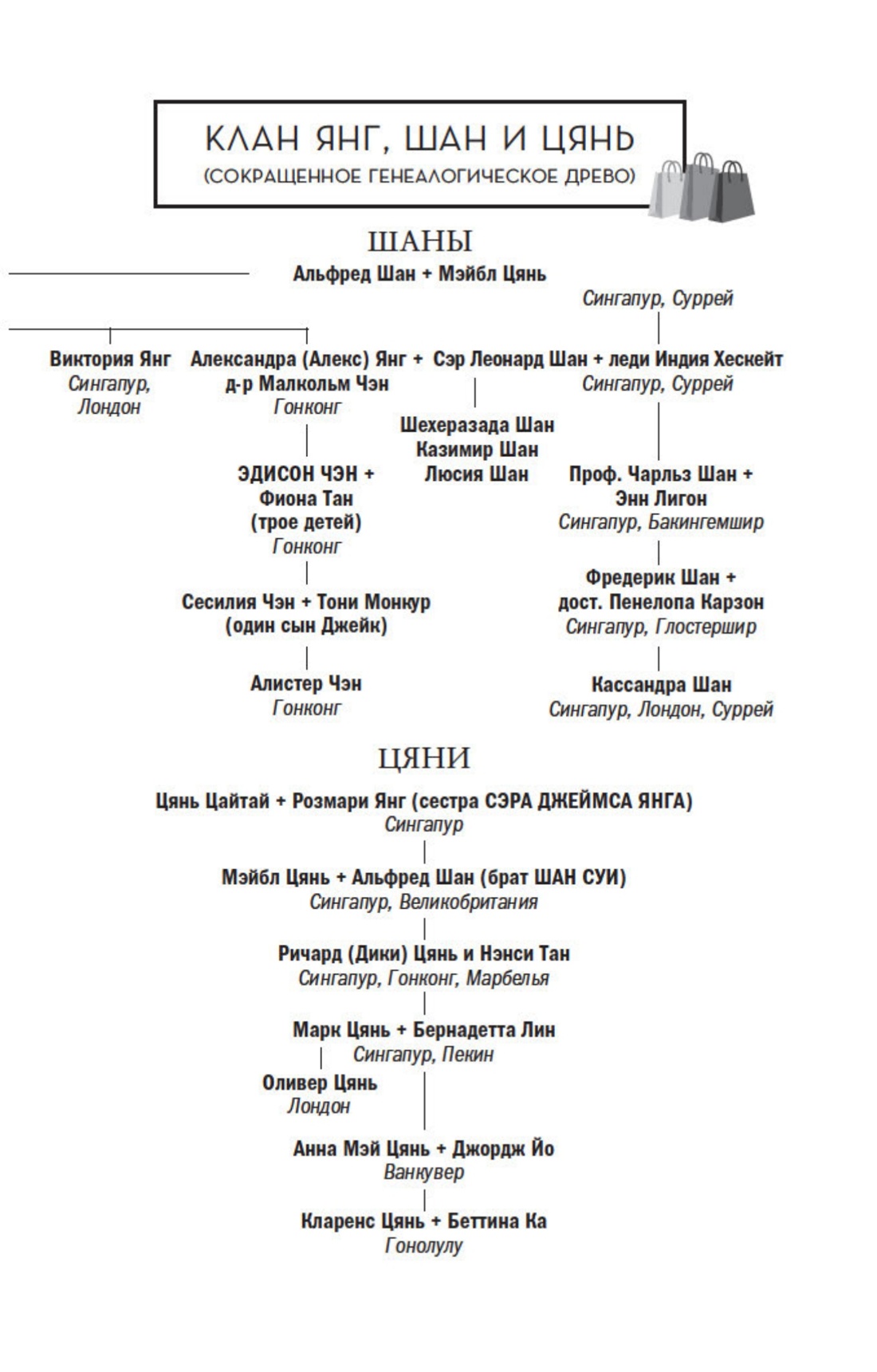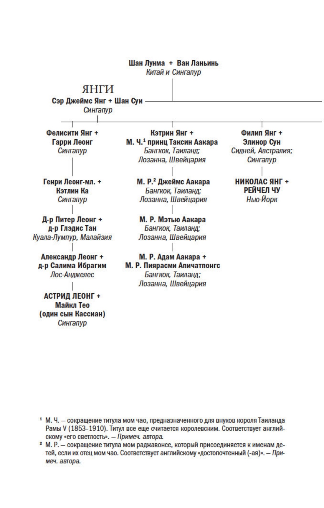 Умопомрачительное состояние и вправду может свести с ума! А знаете почему? Потому что у кого-то другого денег еще больше, чем у вас, и этот кто-то мимоходом лишит вас такой привилегии, как любимый столик в эксклюзивном ресторане или экстренный вызов личного — лучшего в мире! — врача. Но что удивительно — находятся люди, которых не волнуют подобные проблемы! Например, Ник Янг, потомок известного рода и наследник грандиозного имения в центре Сингапура. Чудак из-за женитьбы на своей избраннице отказался от богатства и навеки поссорился с любимой бабушкой, могущественной Шан Суи, которая мечтала оставить ему бесценное недвижимое имущество, но, по слухам, переписала завещание. И вот древняя Шан Суи лежит при смерти, а внука, приехавшего помириться с бабушкой перед ее кончиной, даже не пускают на порог. Вокруг лакомого куска роятся вероятные наследники и плетутся немыслимые интриги. Кому же достанется великолепное поместье, будоражащее умы самых богатых людей Азии?