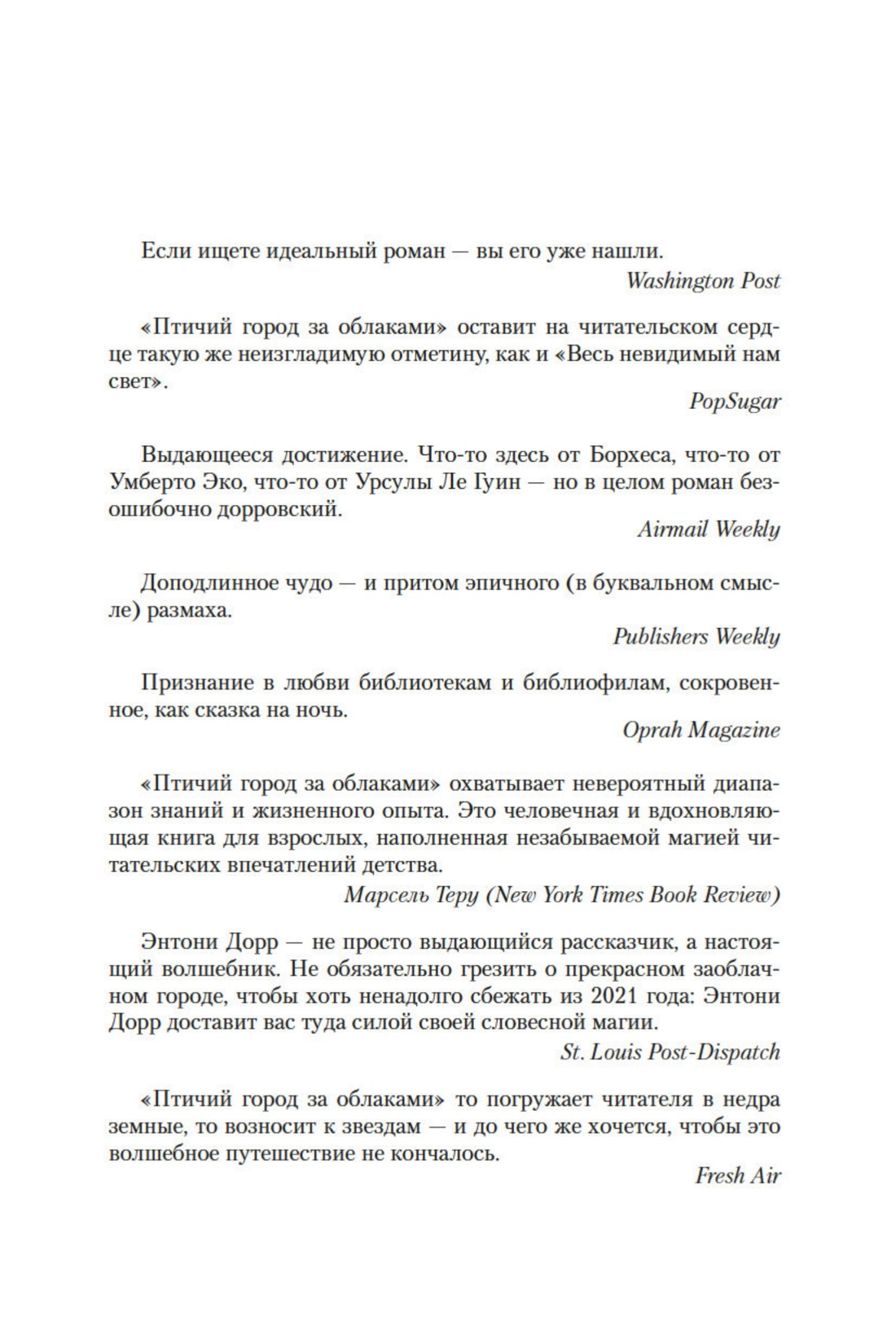 «„Птичий город за облаками“ охватывает невероятный диапазон знаний и жизненного опыта. Это человечная и вдохновляющая книга для взрослых, наполненная незабываемой магией читательских впечатлений детства» (New York Times Book Review).