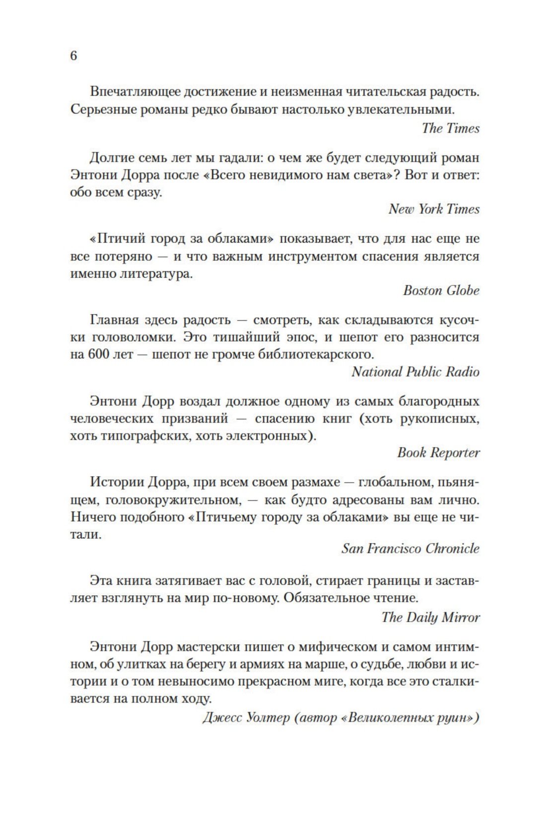 Впервые на русском — новейший роман Энтони Дорра, автора книги «Весь невидимый нам свет», удостоенной Пулицеровской премии; как и этот международный бестселлер, «Птичий город за облаками» включен в шорт-лист Национальной книжной премии США. Роман выстроен подобно матрешке (или «Облачному атласу» Дэвида Митчелла): здесь хитроумно перекрещиваются жизни и судьбы Анны и Омира, пребывающих по разные стороны стены в осажденном турками Константинополе 1453 года, а также пожилого энтузиаста древнегреческой литературы Зено и юного экотеррориста Сеймура в современном Айдахо, а также Констанции, которая летит к далекой экзопланете на корабле «Арго» под управлением всезнающей Сивиллы. Подобно Мари-Лоре и Вернеру в романе «Весь невидимый нам свет», все пятеро здесь — мечтатели и аутсайдеры, не теряющие надежды и посреди самого беспросветного, казалось бы, хаоса и отчаяния: «„Птичий город за облаками“ показывает, что для нас еще не все потеряно — и что важным инструментом спасения является именно литература» (Boston Globe) — например, мифическая история древнего грека Аитона, мечтающего обернуться птицей и улететь в сказочный заоблачный город…