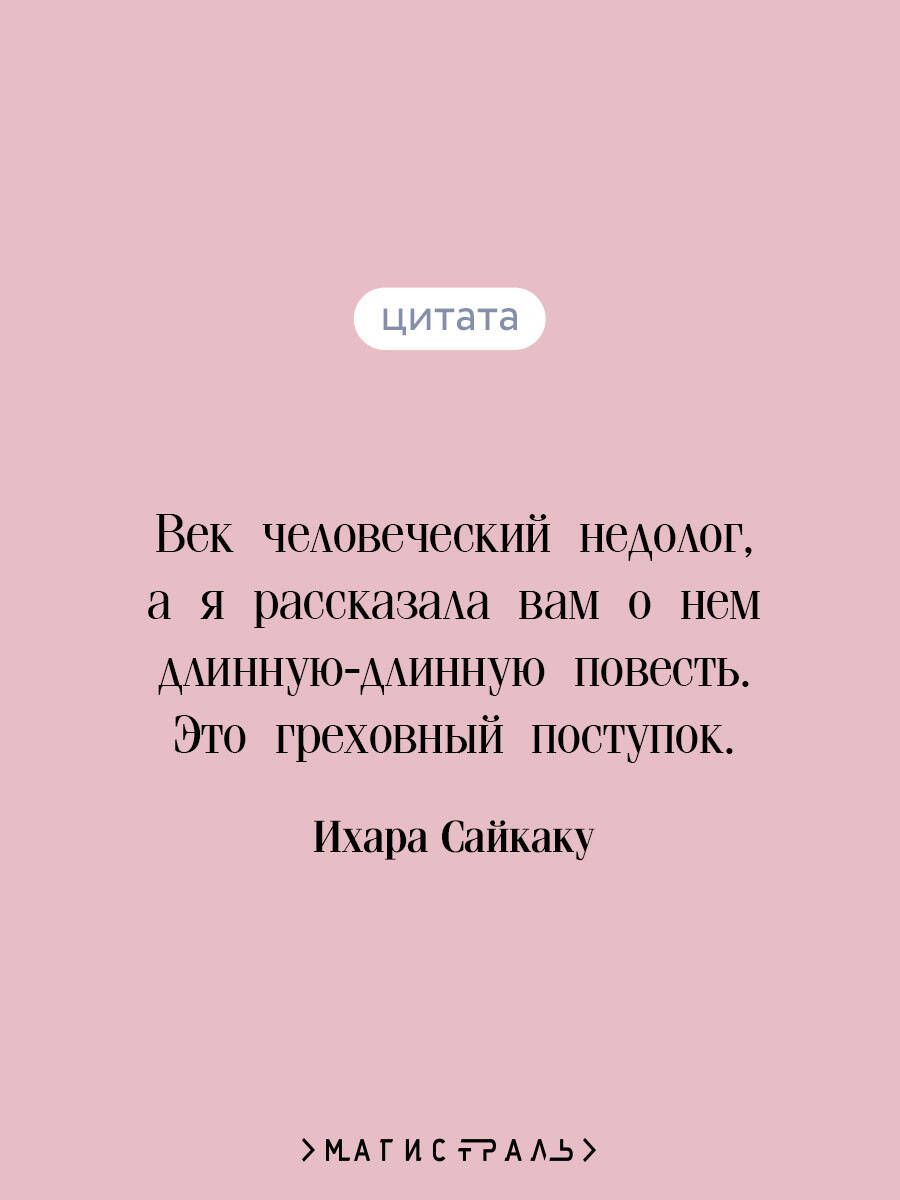 Японского поэта и прозаика Ихару Сайкаку еще при жизни признали классиком. За редкий талант импровизации его назвали "мастером двадцати тысяч строк". Стал родоначальником нового направления в прозе — укиё-дзоси (повести о бренном мире), но прославился косёку-моно (повести о любви). Сайкаку так ярко описал мир страсти и наслаждений и так полнокровно изобразил жизнь современной ему Японии со всем, что в ней есть низкого и высокого, что поднял жанр любовные новеллы до уровня настоящей литературы.