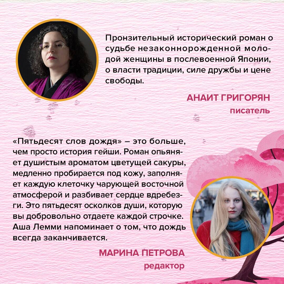 «Пронзительный исторический роман о судьбе незаконнорожденной молодой женщины в послевоенной Японии, о власти традиции, силе дружбы и цене свободы». – Анаит Григорян, автор романа «Осьминог»