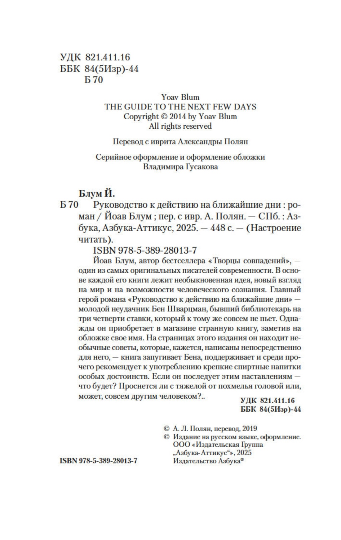 Йоав Блум, автор бестселлера «Творцы совпадений», — один из самых оригинальных писателей современности. В основе каждой его книги лежит необыкновенная идея, новый взгляд на мир и на возможности человеческого сознания. Главный герой романа «Руководство к действию на ближайшие дни» — молодой неудачник Бен Шварцман, бывший библиотекарь на три четверти ставки, который к тому же совсем не пьет. Однажды он приобретает в магазине странную книгу, заметив на обложке свое имя. На страницах этого издания он находит необычные советы, которые, кажется, написаны непосредственно для него, — книга запугивает Бена, поддерживает и среди прочего рекомендует к употреблению крепкие спиртные напитки особых достоинств. Если он последует этим наставлениям — что будет? Проснется ли с тяжелой от похмелья головой или, может, совсем другим человеком?..