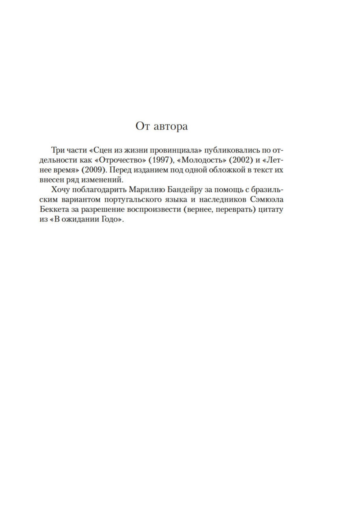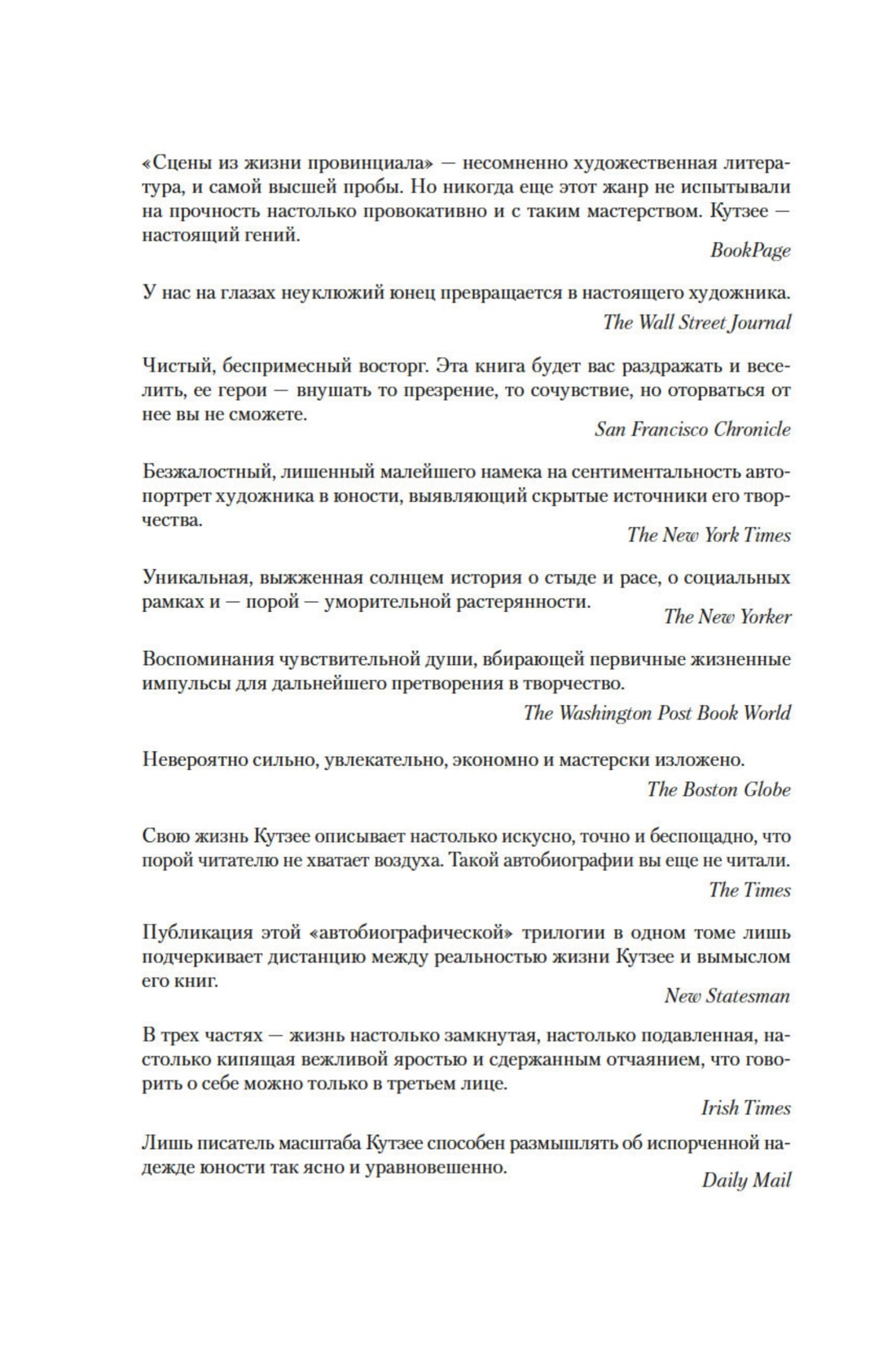 Джон Максвелл Кутзее родился в Южной Африке, работал в Англии и США, живет в Австралии. Дважды лауреат Букера и лауреат Нобелевской премии по литературе, он не явился ни на одну церемонию вручения, почти не дает интервью и живет, можно сказать, затворником. О своем творчестве он говорит редко, а о себе самом — практически никогда. Тем уникальнее «автобиографическая» трилогия «Сцены из жизни провинциала», полная эпизодов шокирующей откровенности, — «перед читателем складывается подробнейший, без прикрас, мозаичный портрет творца, стремящегося только к тому, чего достичь нелегко. Далеко не все факты совпадают с тем, что мы знаем о биографии реального Кутзее, но тем интереснее возникающий стереоэффект» (The Seattle Times). От детства в южноафриканской глубинке, через юность в кейптаунском университете и холодном Лондоне к «летнему времени» зрелости — мы видим Кутзее (или «Кутзее») так близко, как не видели никогда: «автопортрет бескомпромиссно исповедальный и в то же время замысловато зыбкий» (The New York Review of Books). Трилогия выходит в переводе Сергея Ильина (1948–2017) — знаменитого интерпретатора произведений Владимира Набокова и Джозефа Хеллера, Т. Х. Уайта и Мервина Пика, Стивена Фрая, Мишеля Фейбера и многих других современных классиков. Перевод был подготовлен еще в 2011 году, но публикуется впервые.