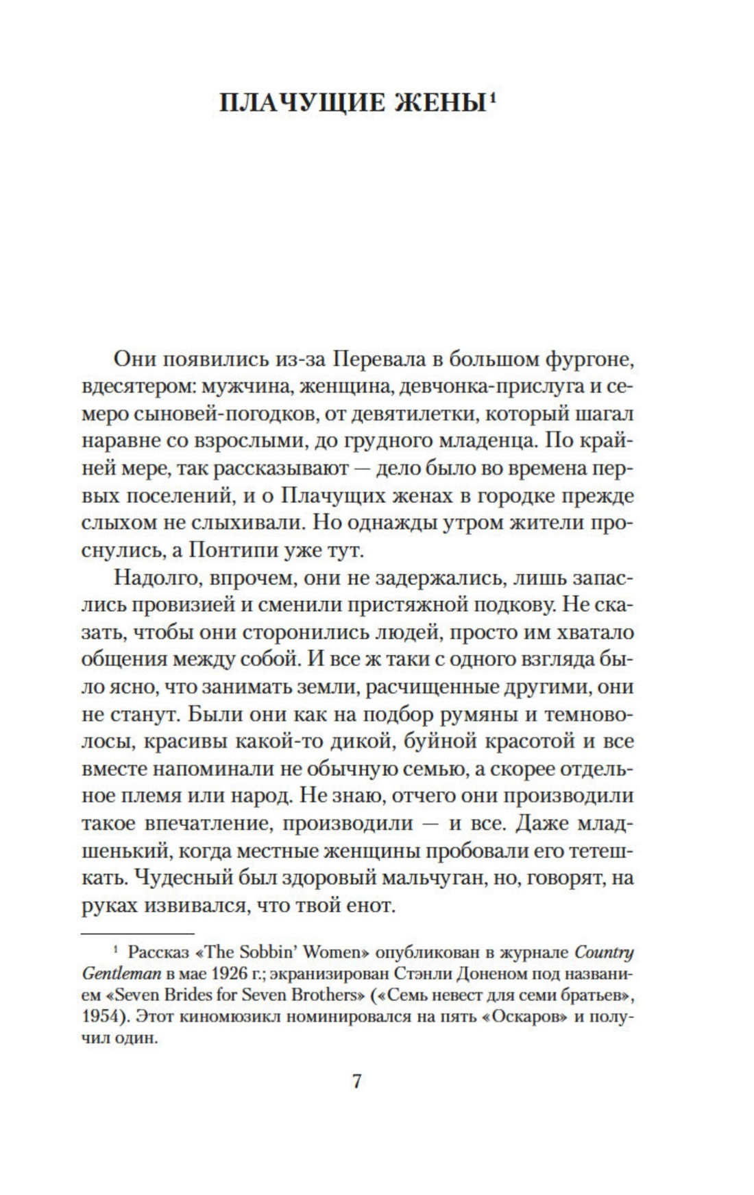 Стивен Винсент Бене — классик американской литературы, плоть от плоти того ярчайшего поколения, что дало нам Фицджеральда, Хемингуэя и Фолкнера. Как мастер парадоксально-иронической новеллы, он несомненно наследует О. Генри, часто использует исторические, фольклорные и фантастические сюжеты. Далекое или недавнее прошлое предстает у него ожившим царством фантазии. Здесь на американском фронтире разыгрываются сюжеты античной мифологии, доктор Мелхорн продолжает свою врачебную практику в преисподней, Вождь великой Державы отправляет в изгнание Про`клятый народ до последнего младенца, и последний римский легион покидает Британские острова, к ужасу колонистов... Рассказ «Плачущие жены», открывающий сборник, послужил основой для знаменитого киномюзикла Стэнли Донена «Семь невест для семи братьев», номинированного на пять «Оскаров» и получившего один. Все произведения публикуются на русском впервые (за исключением одного рассказа, представленного в новом переводе).