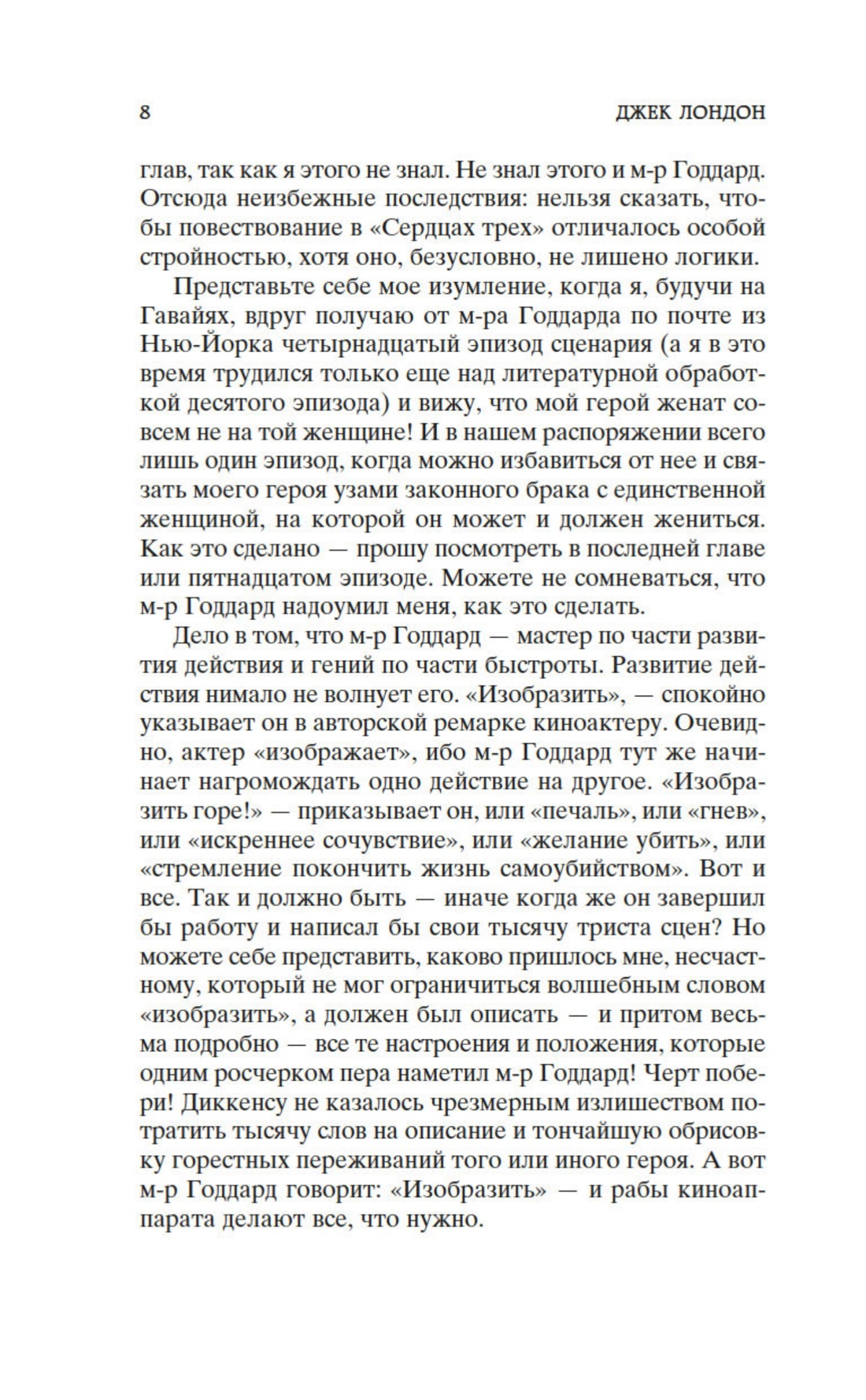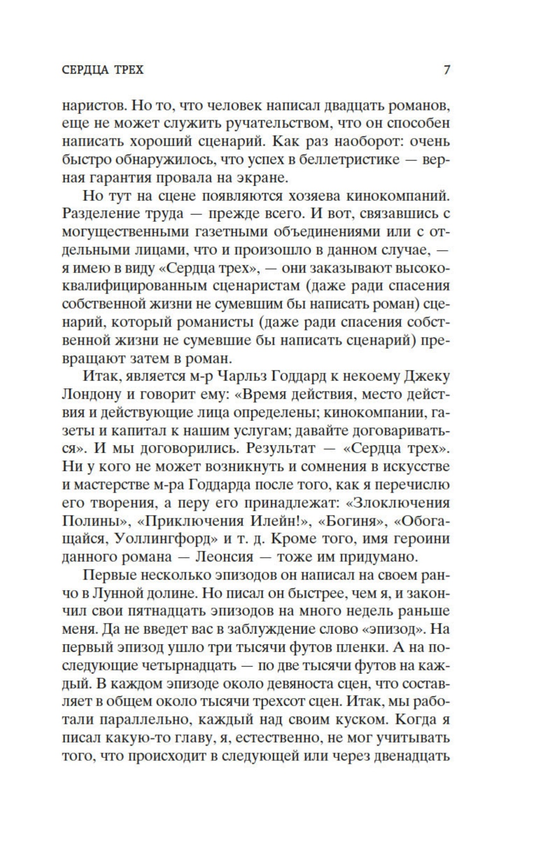 Приключенческий роман «Сердца трех», созданный в 1915 году на основе киносценария Чарльза Годдарда и опубликованный в 1919 году, американский писатель Джек Лондон считал началом «нового направления» в своем творчестве и предметом своей авторской гордости. Главный герой книги, Фрэнсис Морган — сын покойного миллионера и далекий потомок знаменитого пирата XVII века Генри Моргана — отправляется в Панаму на поиски пиратского клада и встречает там другого Генри Моргана — своего дальнего родственника, который вскоре становится его спутником в опасных приключениях и соперником в любви. Путешествие в Кордильеры к сокровищам индейцев племени майя, борьба с коварным Альваресом Торресом и жителями Долины Затерянных Душ, странствия по неведомым землям, стремительные погони, чудесные спасения, остродраматичные любовные коллизии сменяют друг друга с поистине кинематографической скоростью, делая «Сердца трех» в высшей степени увлекательным чтением.