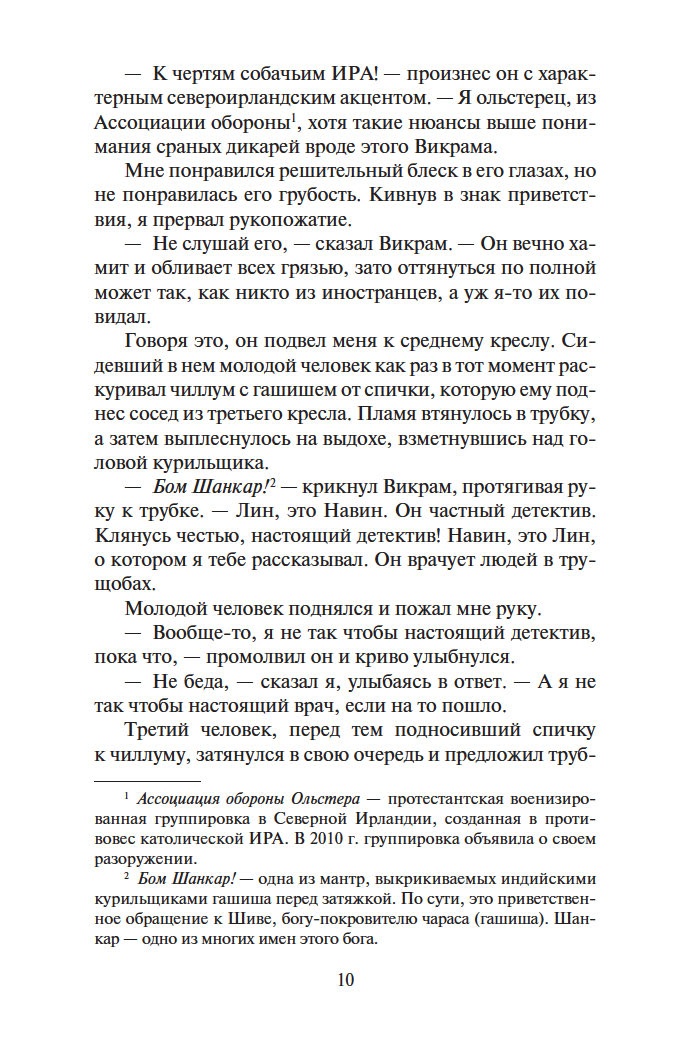 Итак, прошло два года с тех пор, как Лин потерял двух самых близких ему людей: Кадербхая — главаря мафии, погибшего в афганских горах, и Карлу — загадочную, вожделенную красавицу, вышедшую замуж за бомбейского медиамагната. Теперь Лину предстоит выполнить последнее поручение, данное ему Кадербхаем, завоевать доверие живущего на горе мудреца, сберечь голову в неудержимо разгорающемся конфликте новых главарей мафии, но главное — обрести любовь и веру.