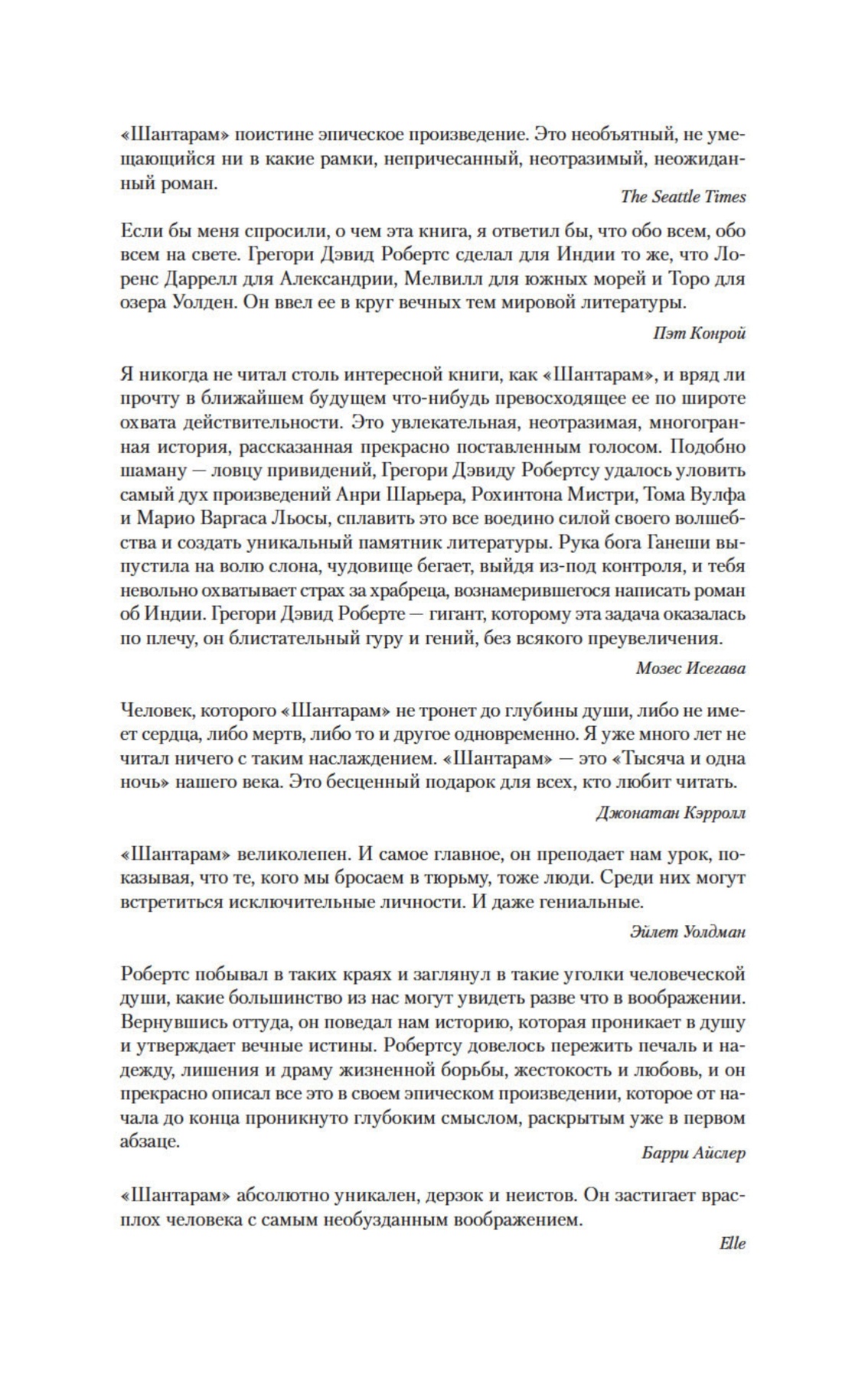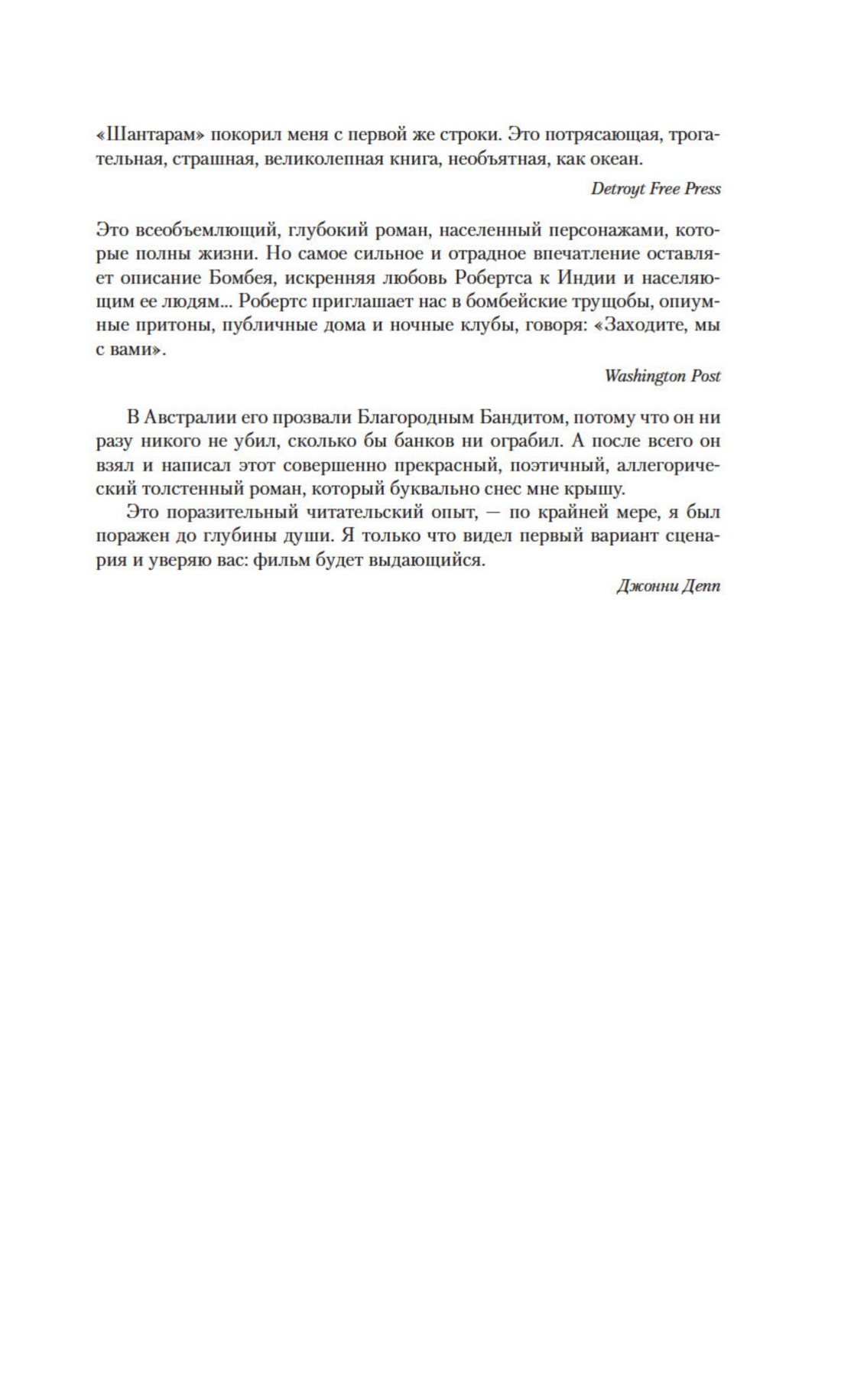 «Человек, которого «Шантарам» не тронет до глубины души, либо не имеет сердца, либо мертв, либо то и другое одновременно. Я уже много лет не читал ничего с таким наслаждением. «Шантарам» — «Тысяча и одна ночь» нашего века. Это бесценный подарок для всех, кто любит читать».