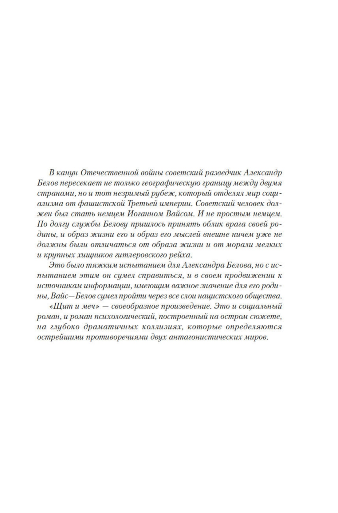 Роман известного советского писателя Вадима Кожевникова (1909–1984), лауреата Государственной премии СССР и РСФСР, — дань уважения смертельно опасной работе советской разведки в годы Второй мировой войны. Главный герой, Александр Белов, по долгу службы должен принять облик врага своей Родины и, ежеминутно рискуя жизнью, повести трудную борьбу в тылу врага. «Щит и меч» — это не только остросюжетная шпионская история, полная политических интриг и бесконечных испытаний ума и силы воли отдельных людей, это широкое, насыщенное драматическими коллизиями историческое полотно, раскрывающее перед читателем социальные и психологические корни самого трагического противостояния двадцатого века.