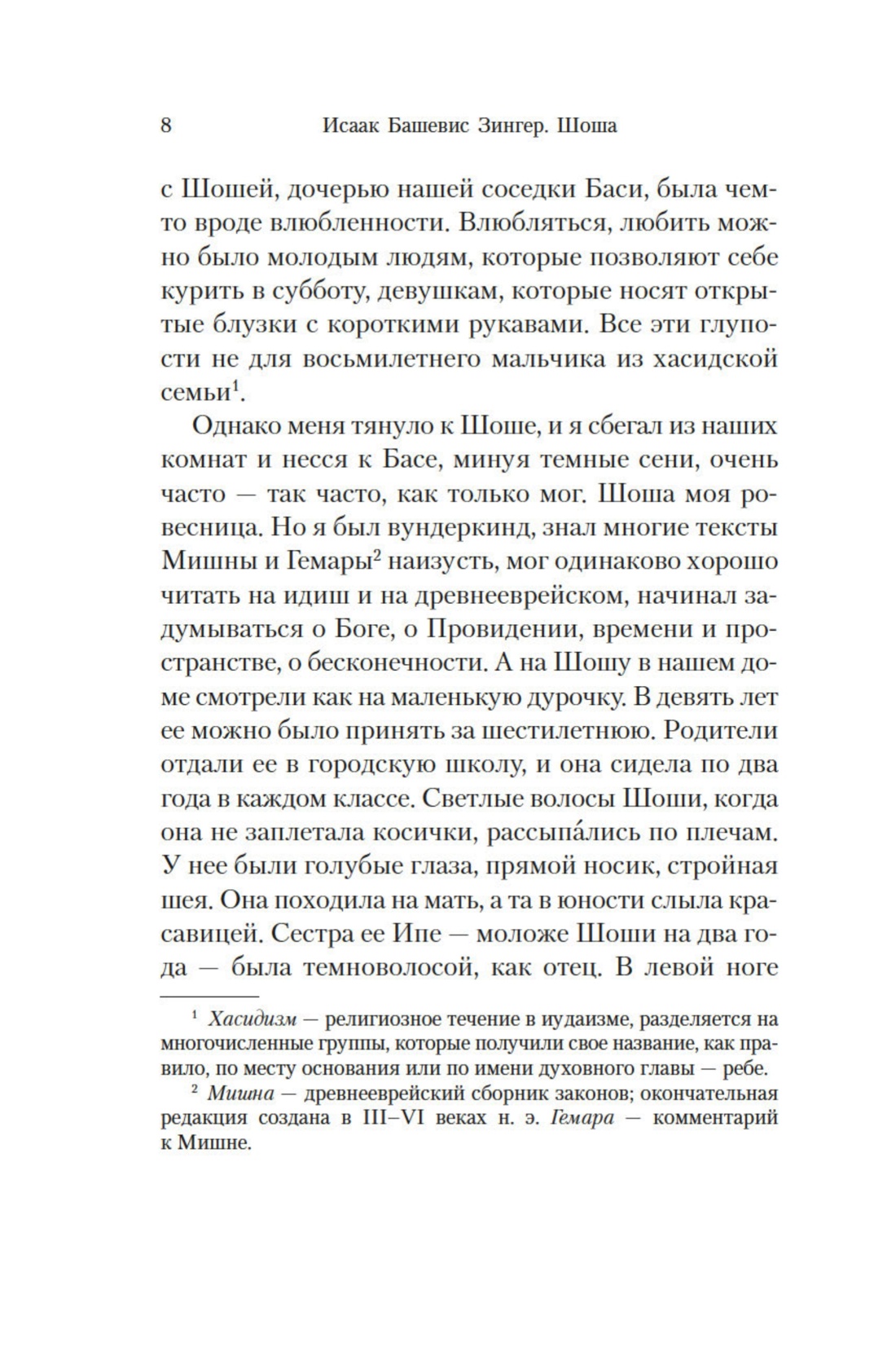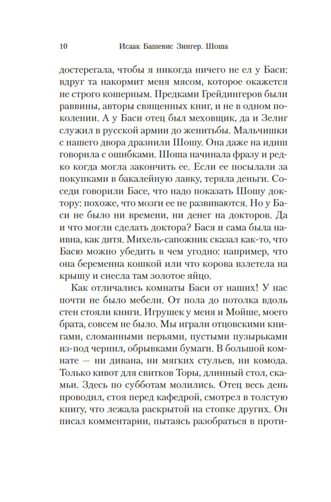Роман «Шоша» — самое известное произведение Исаака Башевиса Зингера (1902—1991), удивительная история любви и яркое свидетельство жизни довоенной Варшавы, стертой фашистами с лица земли. После публикации английской версии романа в 1978 году И. Б. Зингеру была присвоена Нобелевская премия за «эмоциональное искусство повествования». Первоначально текст выходил на идиш под названием «Экспедиции души», однако в процессе перевода на английский был значительно изменен и переработан автором, который в дальнейшем настаивал, чтобы именно по английской версии совершались переводы на другие языки. В настоящем издании роман «Шоша» представлен в классическом переводе с английского Нины Брумберг.
