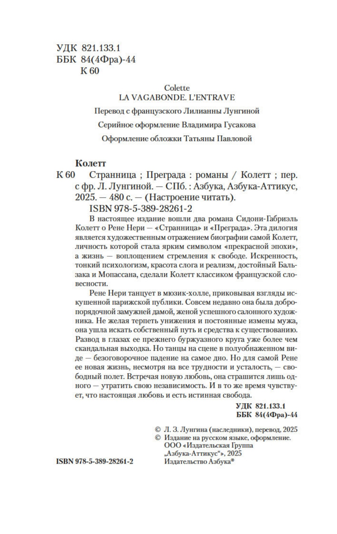 В настоящее издание вошли два романа Сидони-Габриэль Колетт о Рене Нери — «Странница» и «Преграда». Эта дилогия является художественным отражением биографии самой Колетт, личность которой стала ярким символом «прекрасной эпохи», а жизнь — воплощением стремления к свободе. Искренность, тонкий психологизм, красота слога и реализм, достойный Бальзака и Мопассана, сделали Колетт классиком французской словесности.