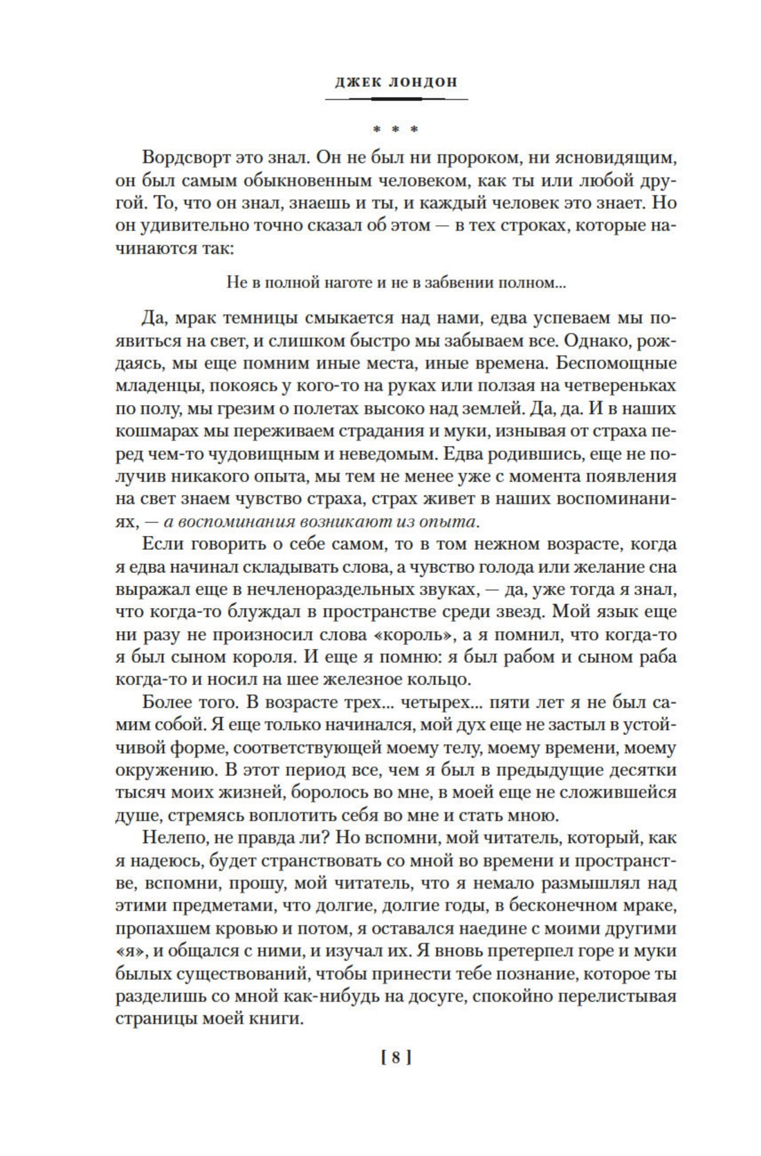 Моряк, золотоискатель, бродяга, социалист, военный корреспондент, чернорабочий, самый высокооплачиваемый писатель в США, — во всей американской литературе не найти более романтичной биографии, чем у Джека Лондона. Прожив всего сорок лет, он оставил более сорока книг, написанных в самых разных жанрах. В этом сборнике Джек Лондон не отступает от привычного для себя амплуа — автора произведений, в которых сильные и самоотверженные герои проходят через суровые жизненные испытания, — но вместе с тем предстает мечтателем и фантазером, блуждающим по вымышленным мирам возможного прошлого и будущего. Так, герой романа «Странник по звездам, или Смирительная рубашка» обретает поразительную способность раскрепощать подсознание и путешествовать по иным эпохам, заново проживая свои прошлые жизни; в романе «Железная пята» с нами говорит повествователь из далекого XXVII века, комментирующий записки девушки из века двадцатого; события романа «Алая чума» относятся к XXI веку, в нем речь идет о постигшей человечество катастрофе; герой повести «До Адама» из обрывков снов реконструирует жизнь своего далекого предка. Чередуя юмор и драматизм, Джек Лондон повествует о варварской изнанке новейшей эпохи, о первобытном хаосе страстей, таящемся под тонким покровом человеческой культуры, о «зове предков», различимом сквозь многие века мировой истории, об извечном круговороте времен.