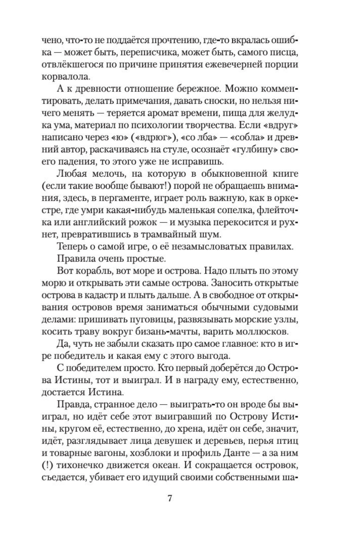 Это роман особый, роман-игра. Правила этой игры простые. Вот корабль, вот море и острова. Надо плыть по этому морю и открывать эти самые острова. Заносить открытые острова в кадастр и плыть дальше. А в свободное от открывания островов время заниматься обычными судовыми делами: пришивать пуговицы, развязывать морские узлы, косить траву вокруг бизань-мачты, варить моллюсков… Победитель в этой игре тот, кто первым доберется до Острова Истины. И в награду ему, естественно, достается Истина. Желаете быть участником? Тогда пожалуйте на борт.