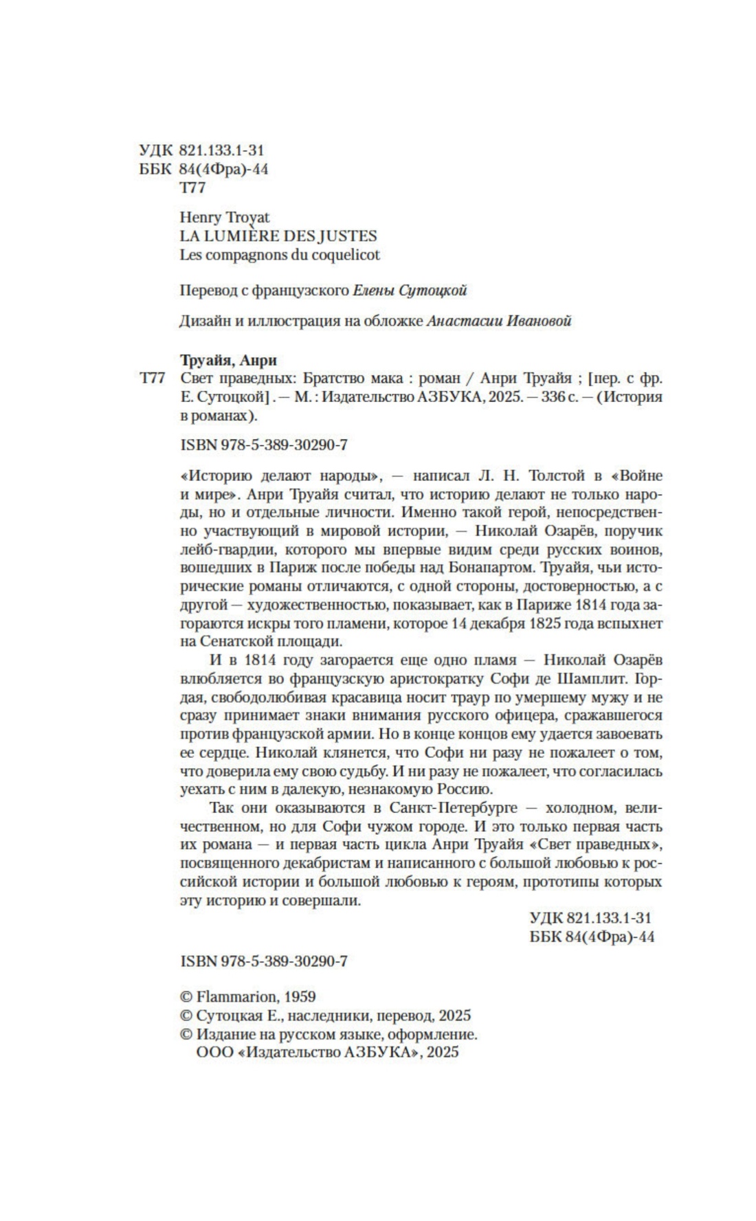 Так они оказываются в Санкт-Петербурге — холодном, величественном, но для Софи чужом городе. И это только первая часть их романа — и первая часть цикла Анри Труайя, чей цикл «Свет праведных», посвященный декабристам написан с большой любовью к российской истории и большой любовью к героям, прототипы которых и совершали эту историю.
