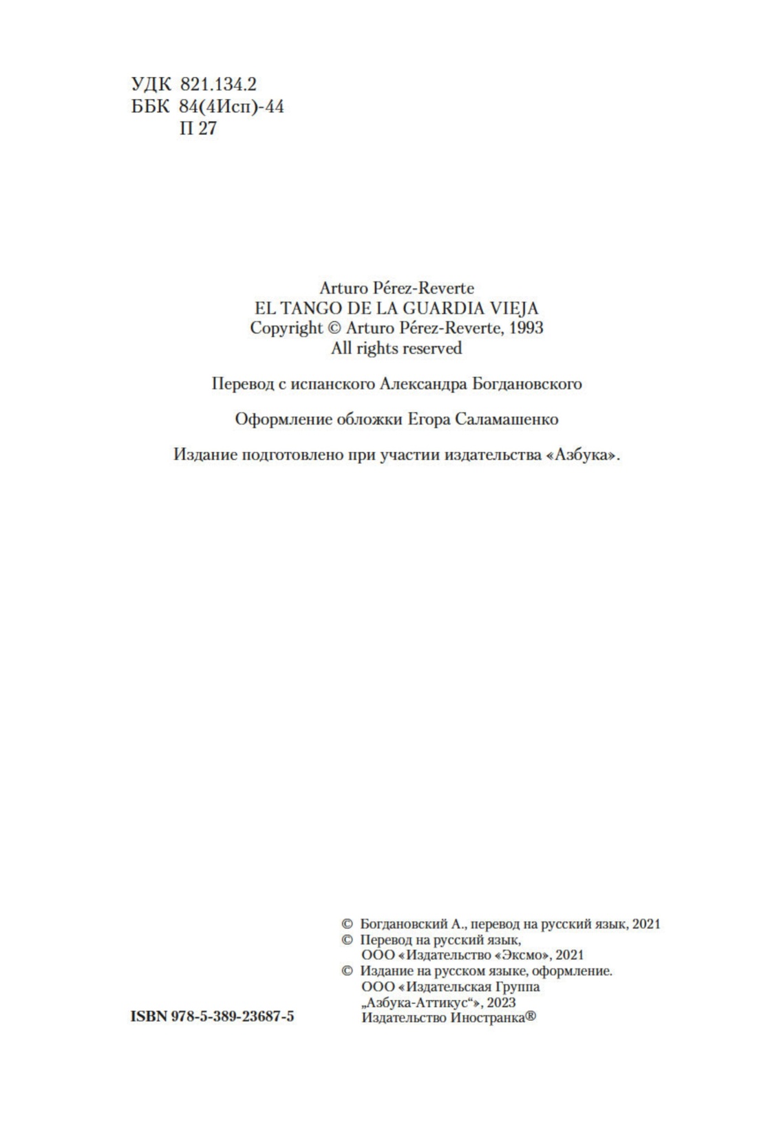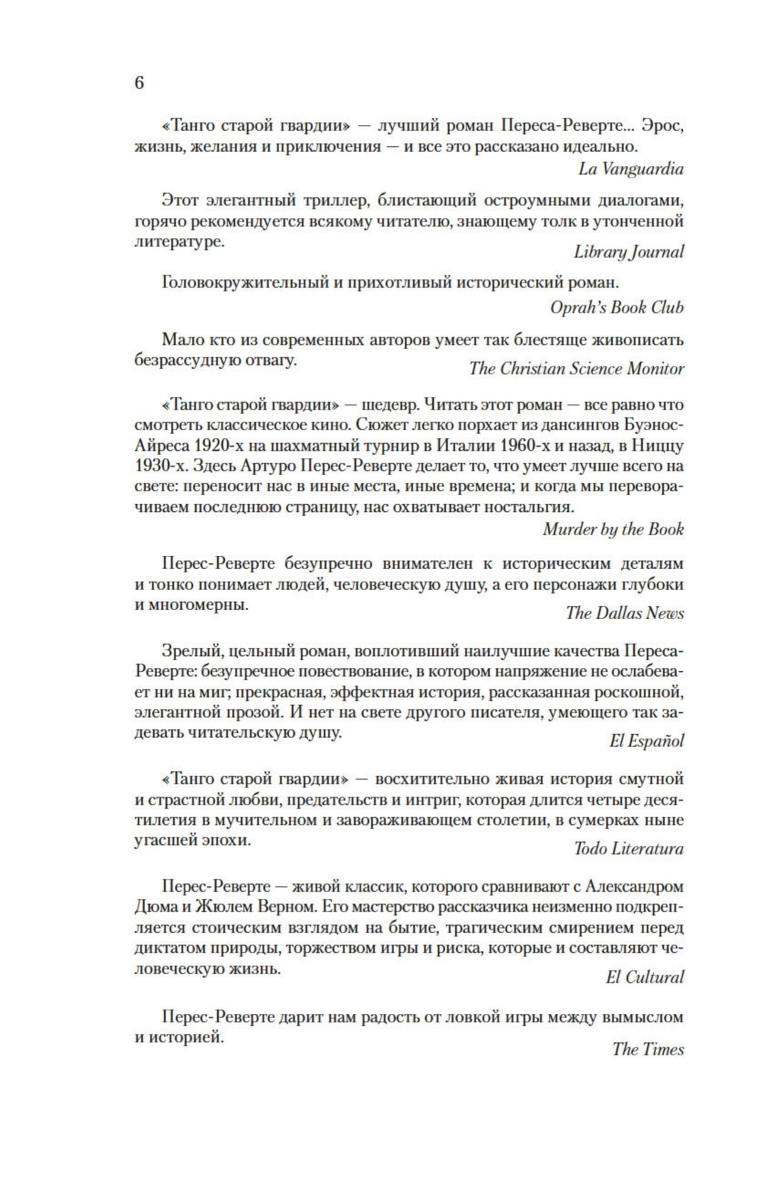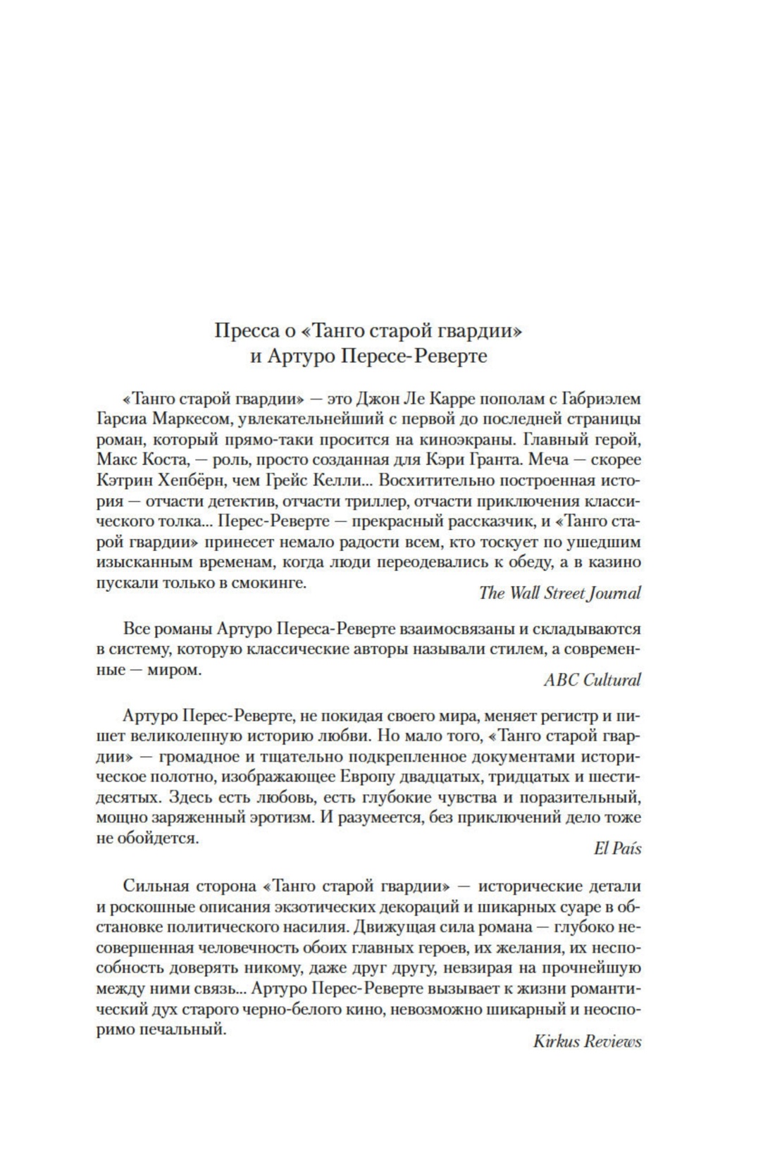 Артуро Перес-Реверте — бывший военный журналист, прославленный автор блестящих исторических, военных, приключенческих романов, переведенных на сорок языков, создатель цикла о капитане Диего Алатристе, обладатель престижнейших литературных наград. Его «Танго старой гвардии» — черно-белое кино о подлинной страсти танго, которое звучит в тебе до конца твоих дней, о ностальгии по ушедшим временам, когда жизнь была полна приключений, непредсказуема и со всем, что приплывало тебе в руки, ты расставался легко, потому что был молод и ничего не боялся, и о старости, которая полна сожалений, однако ничуть не способна изменить ни прожженного мошенника, ни настоящего рыцаря.