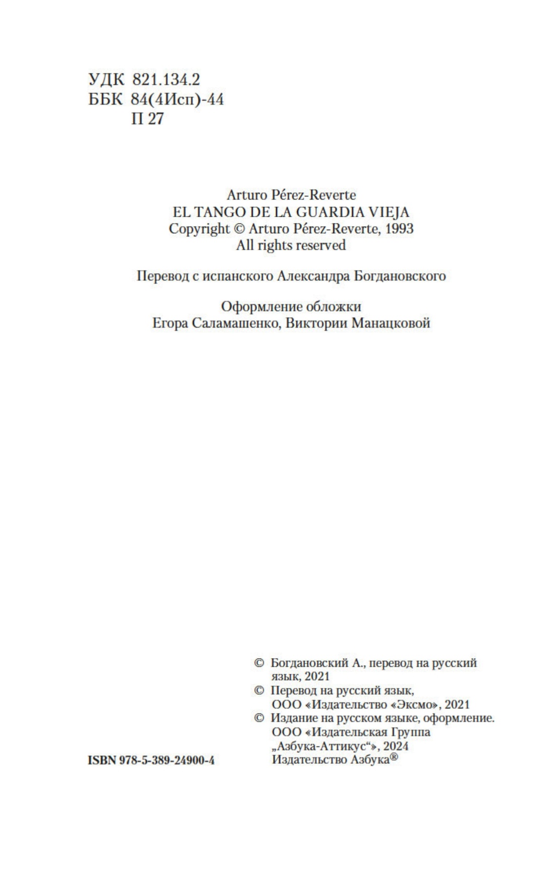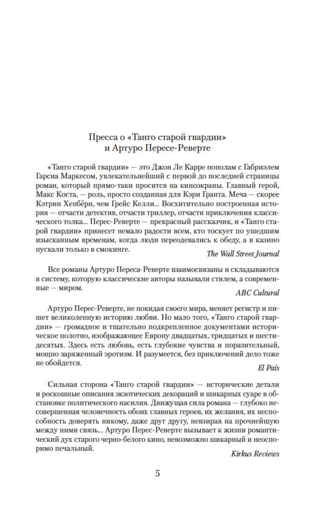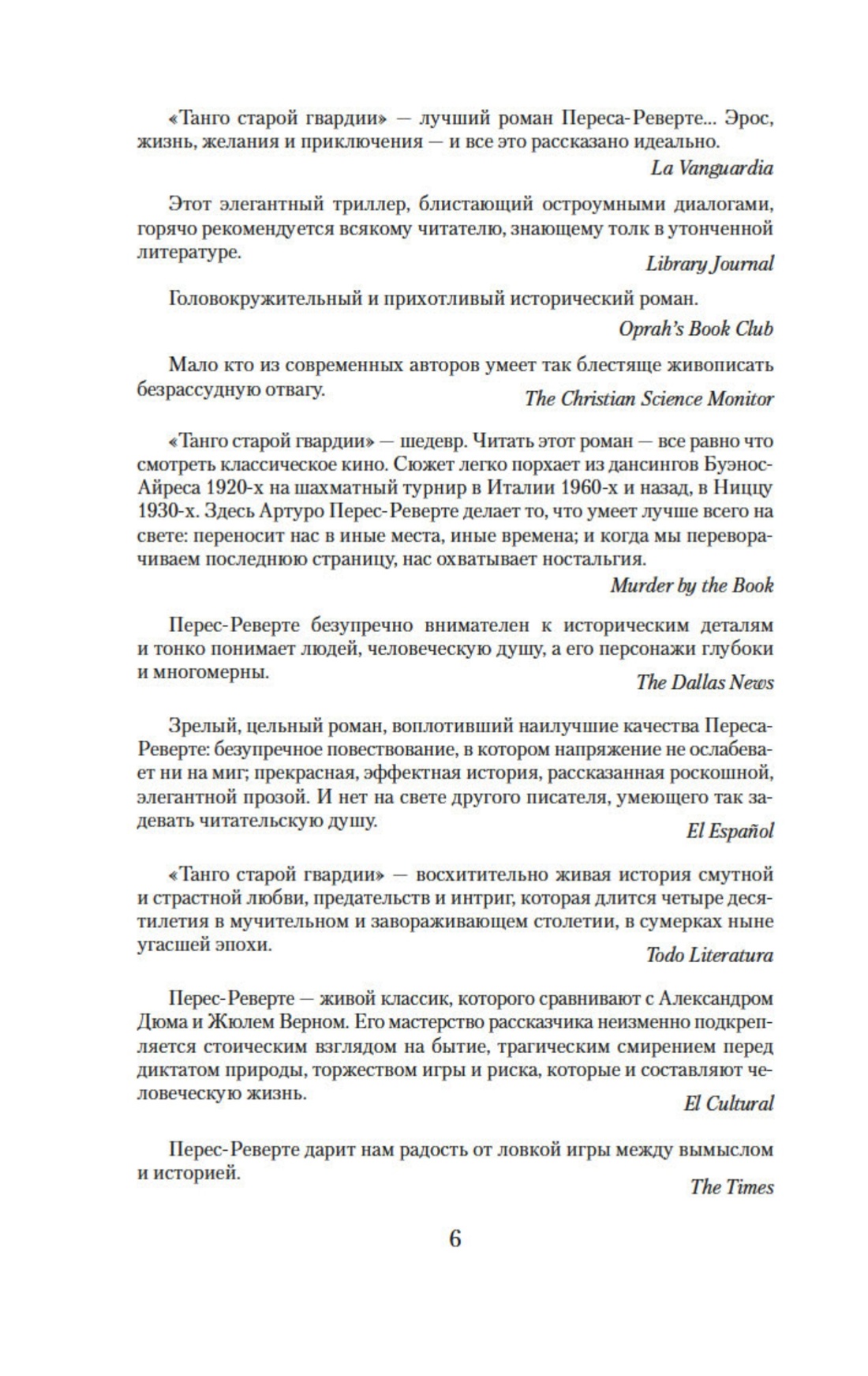 Артуро Перес-Реверте — бывший военный журналист, прославленный автор блестящих исторических, военных, приключенческих романов, переведенных на сорок языков, создатель цикла о капитане Диего Алатристе, обладатель престижнейших литературных наград. Его «Танго старой гвардии» — черно-белое кино о подлинной страсти танго, которое звучит в тебе до конца твоих дней, о ностальгии по ушедшим временам, когда жизнь была полна приключений, непредсказуема и со всем, что приплывало тебе в руки, ты расставался легко, потому что был молод и ничего не боялся, и о старости, которая полна сожалений, однако ничуть не способна изменить ни прожженного мошенника, ни настоящего рыцаря.