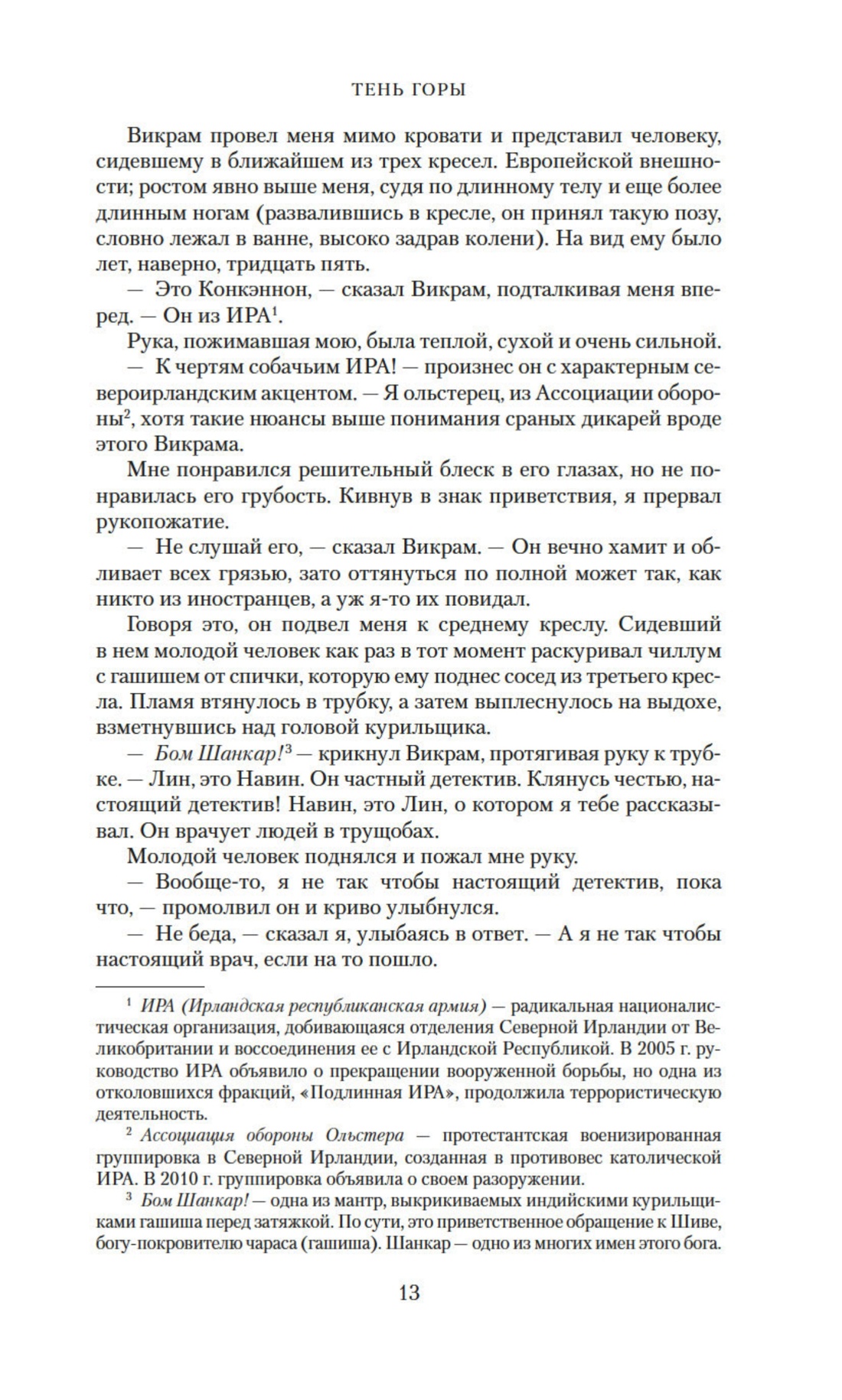 Итак, прошло два года с тех пор, как Лин потерял двух самых близких ему людей: Кадербхая — главаря мафии, погибшего в афганских горах, и Карлу — загадочную, вожделенную красавицу, вышедшую замуж за бомбейского медиамагната. Теперь Лину предстоит выполнить последнее поручение, данное ему Кадербхаем, завоевать доверие живущего на горе мудреца, сберечь голову в неудержимо разгорающемся конфликте новых главарей мафии, но главное — обрести любовь и веру.