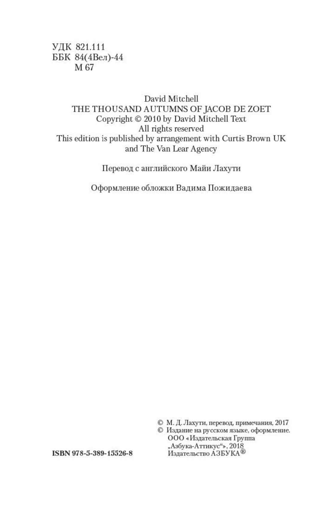 В новом переводе — великолепный роман современного классика Дэвида Митчелла, дважды финалиста Букеровской премии, автора таких интеллектуальных бестселлеров, как «Сон №9», «Облачный атлас» (недавно экранизированный Томом Тыквером и братьями Вачовски), «Голодный дом» и другие. «Признанный новатор, открывший новые пути в литературе, выпустил очаровательно старомодный роман в классическом духе — о любви и самопожертвовании, о столкновении цивилизаций, о безжалостных врагах, которые не успокоятся, пока не уничтожат ваш род до седьмого колена» (Washington Post). Итак, молодой клерк Якоб де Зут прибывает на крошечный островок Дэдзима под боком у огромной феодальной Японии. Среди хитроумных купцов, коварных переводчиков и дорогих куртизанок он должен за пять лет заработать состояние, достаточное, чтобы просить руки оставшейся в Роттердаме возлюбленной — однако на Дэдзиме его вниманием завладевают молодая японская акушерка Орито и зловещий настоятель далекого горного монастыря Эномото-сэнсэй…