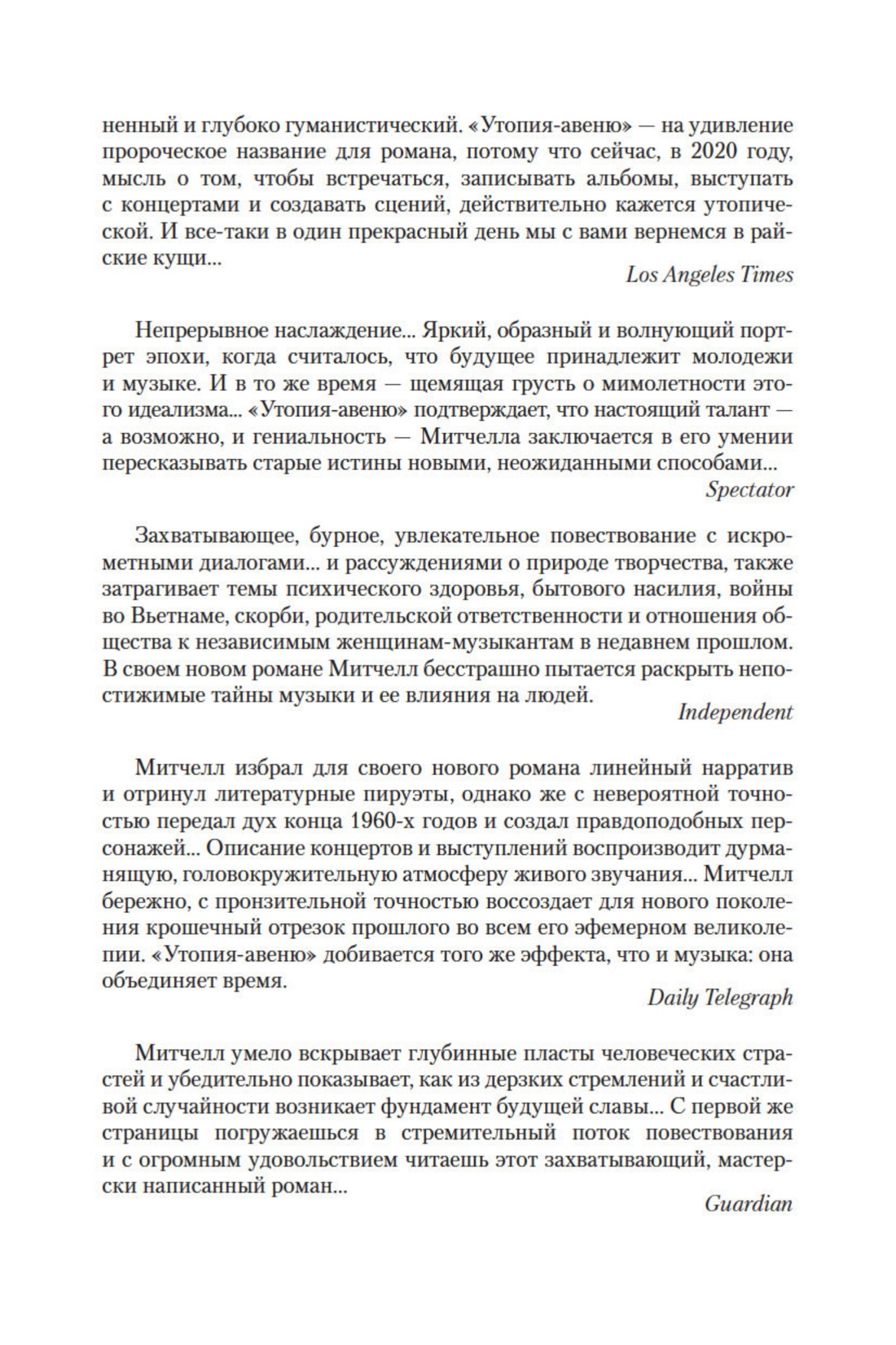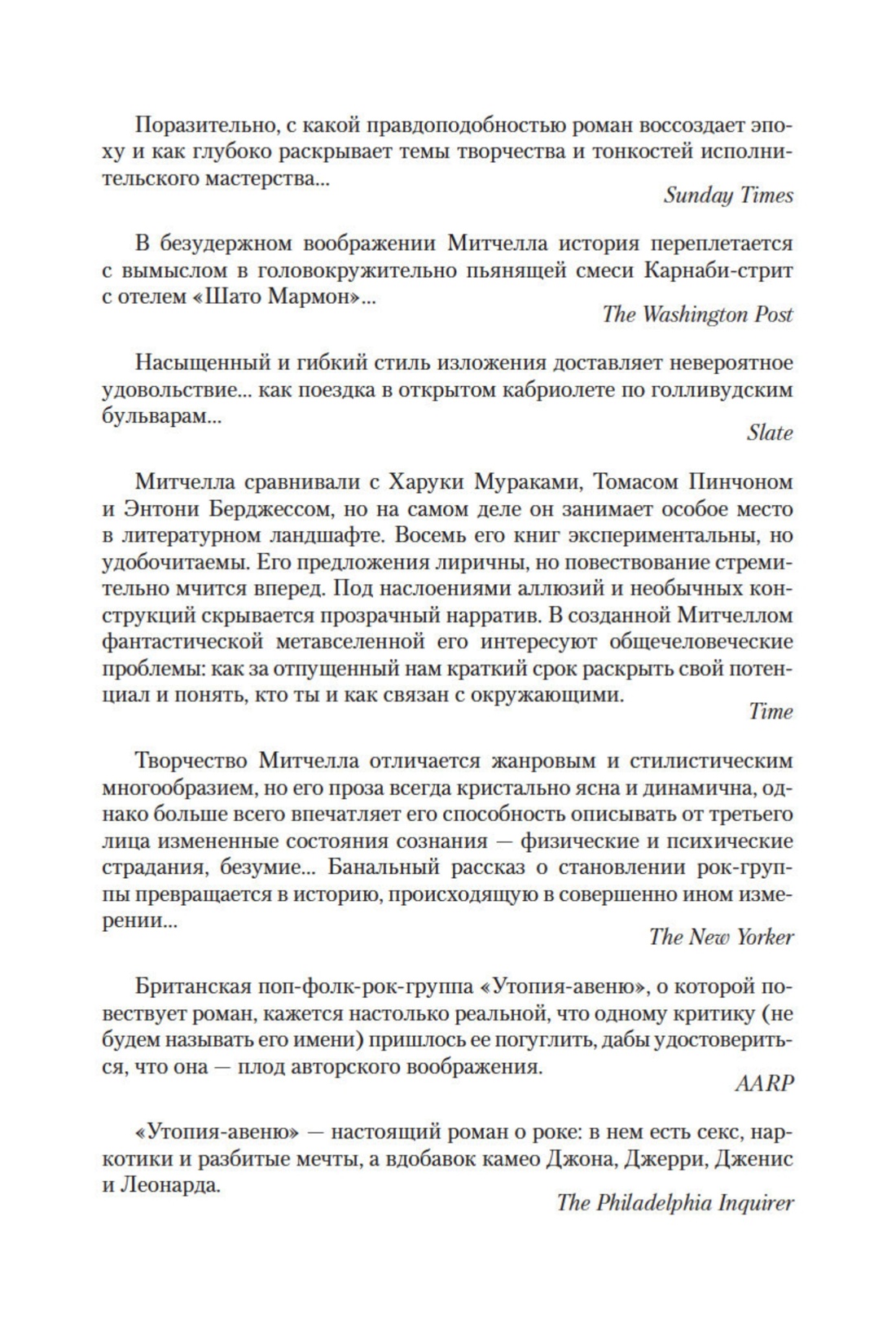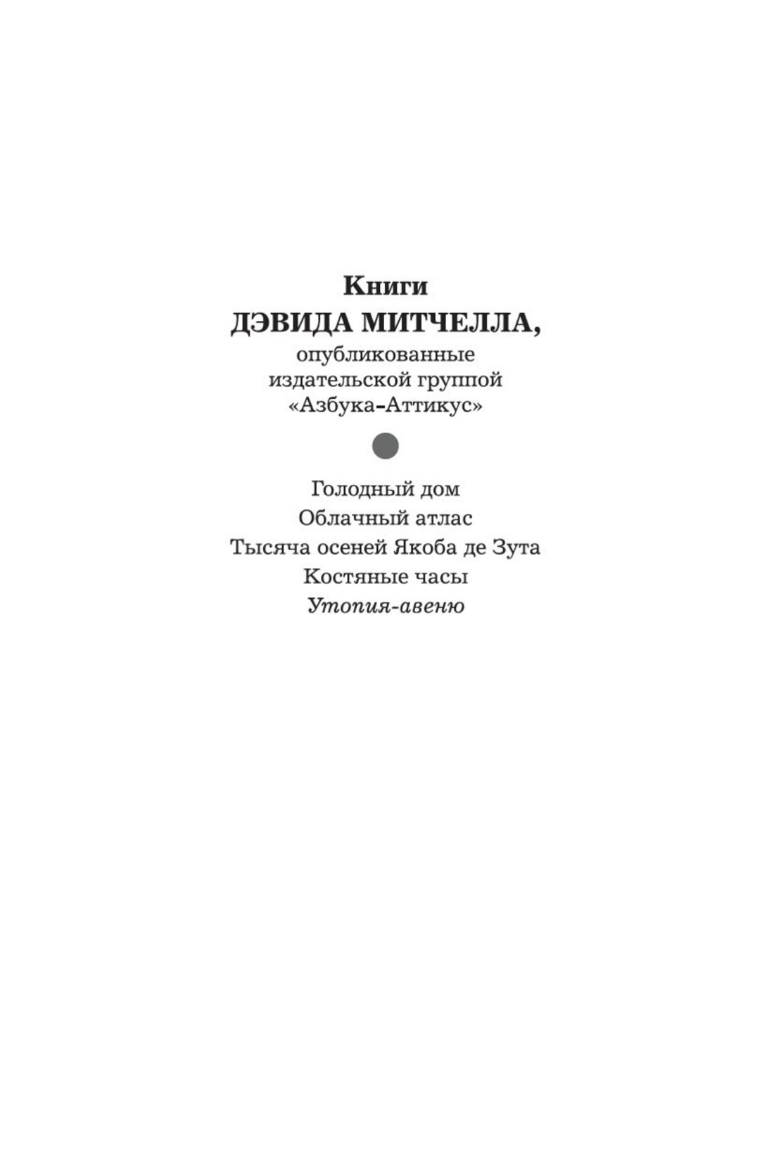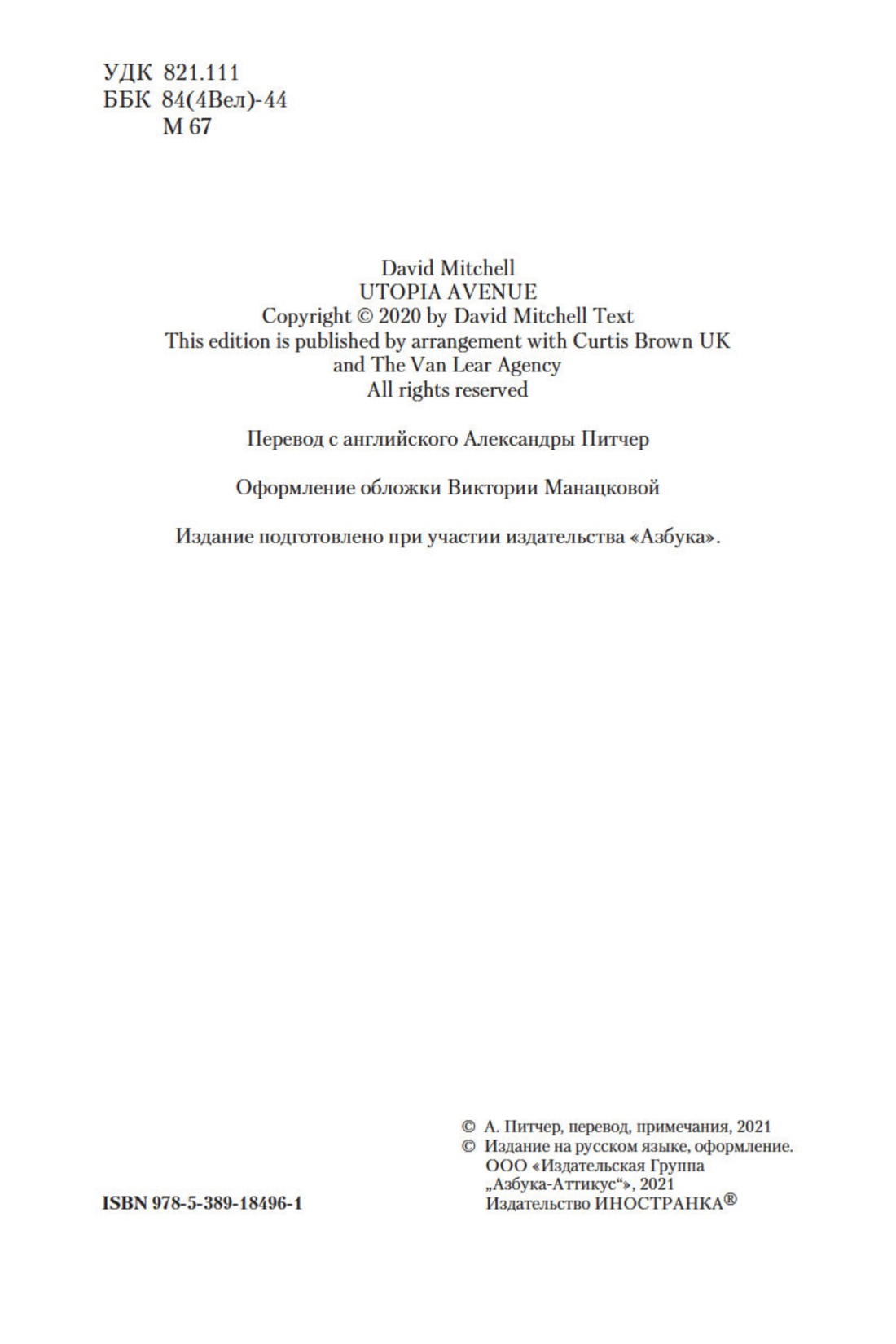 Впервые на русском — новейший роман современного классика Дэвида Митчелла, дважды финалиста Букеровской премии, автора таких интеллектуальных бестселлеров, как «Сон №9», «Облачный атлас» (недавно экранизированный Томом Тыквером и братьями Вачовски), «Голодный дом» и другие. И хотя «Утопия-авеню» как будто ограничена во времени и пространстве — «свингующий Лондон», легендарный отель «Челси» в Нью-Йорке, Сан-Франциско на исходе «лета любви», — Митчелл снова выстраивает «грандиозный проект, великолепно исполненный и глубоко гуманистический, устанавливая связи между Японией эпохи Эдо и далеким апокалиптическим будущим» (Los Angeles Times). Перед нами «яркий, образный и волнующий портрет эпохи, когда считалось, что будущее принадлежит молодежи и музыке. И в то же время — щемящая грусть о мимолетности этого идеализма» (Spectator). Казалось бы, лишь случай или продюсерский произвол свел вместе блюзового басиста Дина Мосса, изгнанного из группы «Броненосец Потемкин», гитариста-виртуоза Джаспера де Зута, из головы которого рвется на свободу злой дух, известный ему с детства как Тук-Тук, пианистку Эльф Холлоуэй из фолк-дуэта «Флетчер и Холлоуэй» и джазового барабанщика Гриффа Гриффина — но за свою короткую историю «Утопия-авеню» оставила неизгладимый след в памяти и сердцах целого поколения…