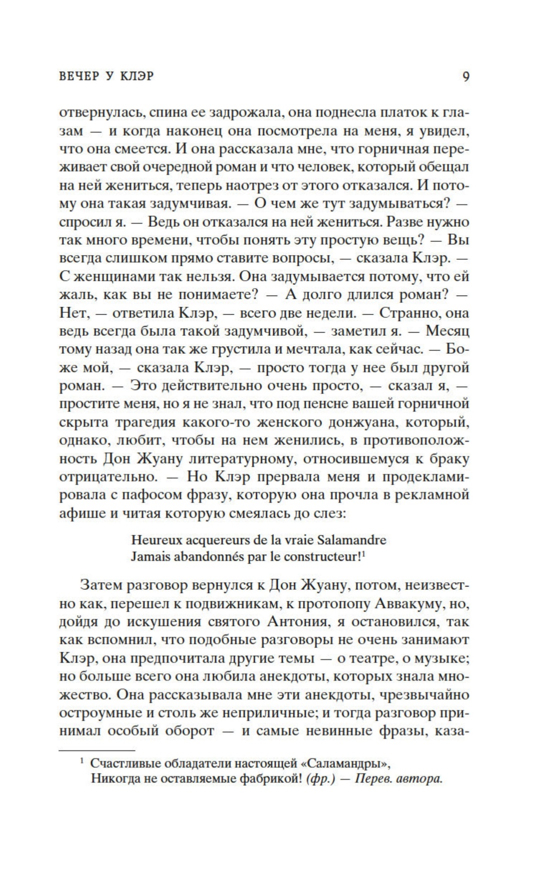 «Вечер у Клэр» (1929), первый роман Газданова, принес молодому автору известность, открыв перед ним двери ведущих литературных журналов. По силе дарования современники ставили Газданова в один ряд с Владимиром Набоковым, а в числе его «предшественников» называли Марселя Пруста и Ивана Бунина, восхищаясь тонкой поэтичностью и музыкальностью его прозы, свежестью и силой языка. Однако на родине писателя роман был опубликован лишь после смерти автора, в 1990 году. Помимо романа «Вечер у Клэр», в настоящее издание включены рассказы Гайто Газданова, написанные в 1930-е годы, а также роман «Призрак Александра Вольфа» (1947).