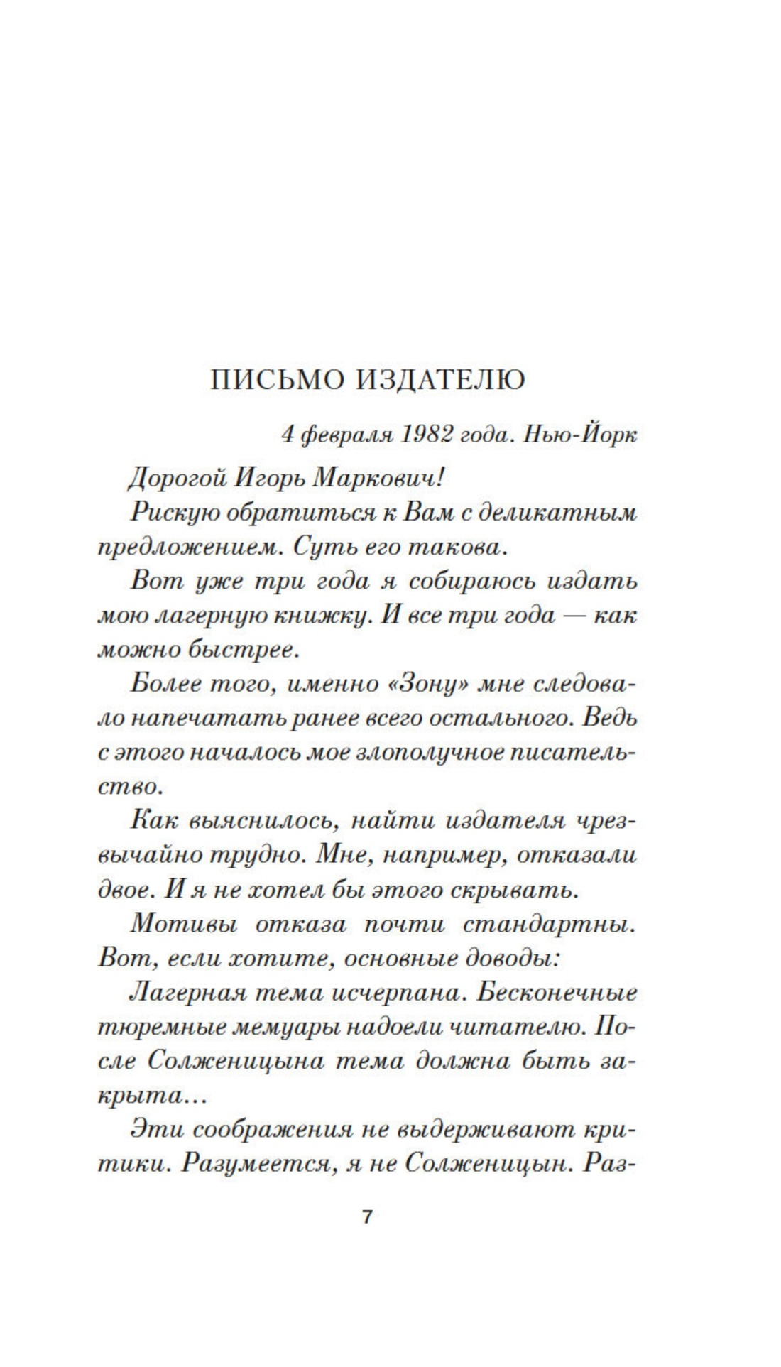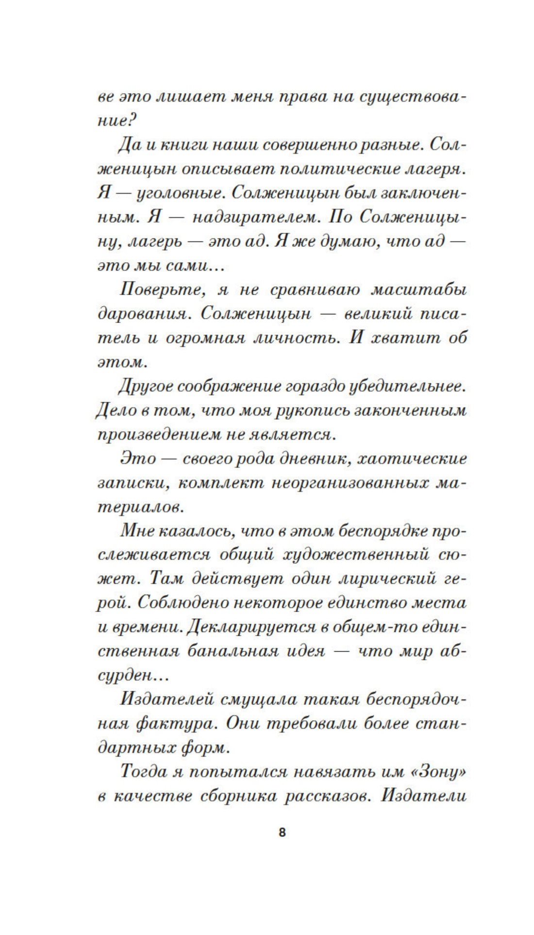 Также в книгу вошла «Зона» — повесть в четырнадцати эпизодах из жизни зеков и их надзирателей, истории сосуществования людей за колючей проволокой, рассказанные просто и с отрезвляющим юмором, за которым совершенно ясно можно расслышать: «Ад — это мы сами».