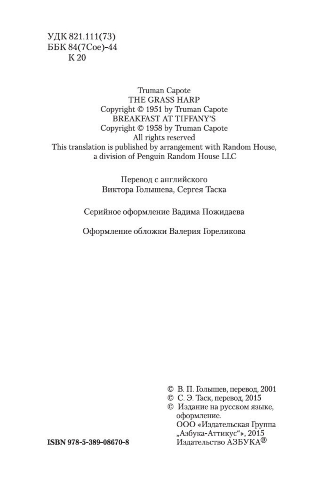 Трумен Капоте, автор таких бестселлеров, как «Хладнокровное убийство», «Летний круиз», «Другие голоса, другие комнаты» и «Музыка для хамелеонов», входит в число крупнейших американских прозаиков ХХ века. Вниманию читателя предлагаются две его классические повести: лирические «Голоса травы», публикующиеся в новом переводе, а также «Завтрак у Тиффани» — самое знаменитое произведение Капоте, прославленное в 1961 году экранизацией с Одри Хепберн в главной роли, сыгравшей главную героиню повести Холли Голайтли, одну из самых ярких и необычных женщин американской литературы. Эксцентричную, полную жизни Холли влечет к себе мир богатых людей, сверкающий яркими огнями бриллиантовых колье. Руководствуясь в своих поступках лишь голосом сердца, сочетая детскую наивность с чарующим обаянием настоящей женщины, она воплощает в себе саму сущность Нью-Йорка — города, в котором мечты лежат на расстоянии вытянутой руки, отгороженные блестящими стеклами пленяющих взгляды витрин.