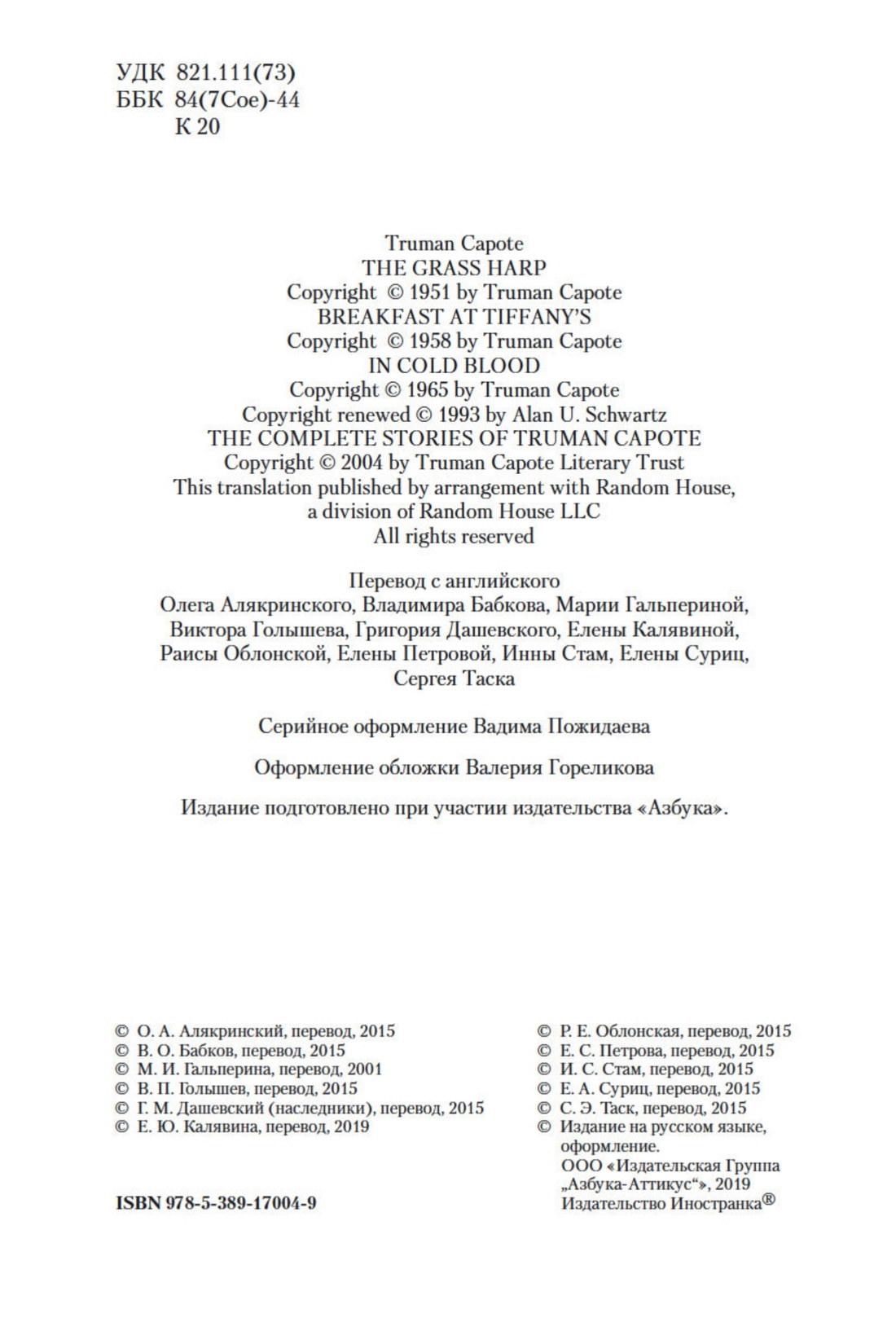 «Трумен Капоте — стилист высочайшего класса… надежда современной литературы», — писал Сомерсет Моэм. А Норман Мейлер говорил: «Трумен Капоте — лучший писатель нашего поколения, — и добавлял: — В “Завтраке у Тиффани” я не изменил бы ни слова, этой книге суждено стать классикой». В данный том входят и «Завтрак у Тиффани» (самое знаменитое произведение Капоте, прославленное в 1961 году экранизацией с Одри Хепберн в главной роли), и лирическая повесть «Голоса травы», и монументальный роман «Хладнокровное убийство», основанный на истории реального преступления и породивший новый жанр «романа-репортажа», и полное собрание рассказов этого выдающегося мастера американской литературы XX века.