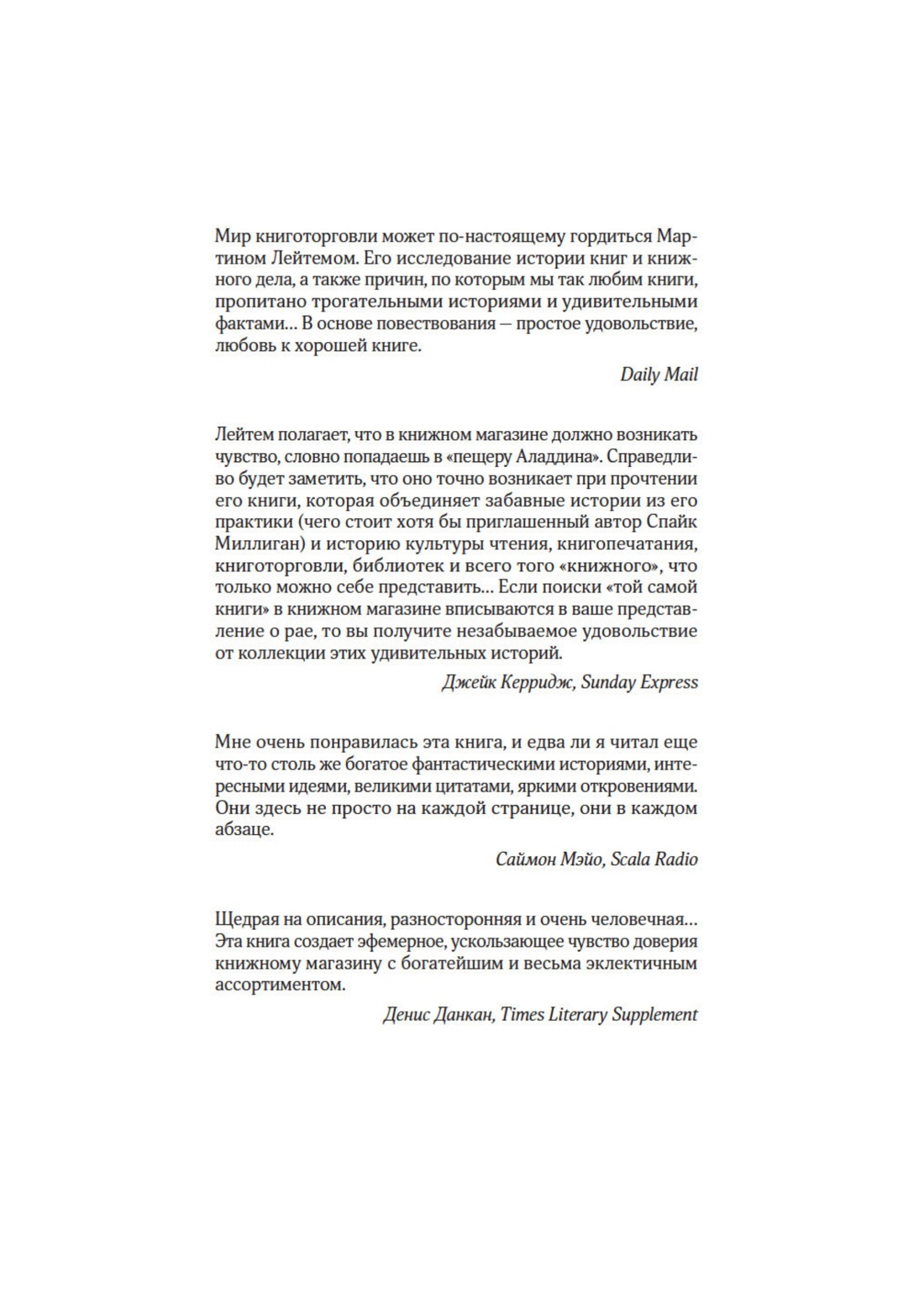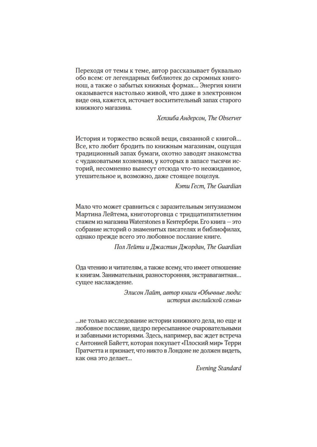 В созвездии британских книготорговцев — не только торгующих книгами, но и пишущих, от шотландца Шона Байтелла с его знаменитым The Bookshop до потомственного книготорговца Сэмюэла Джонсона, рассказавшего историю старейшей лондонской сети Foyles — загорается еще одна звезда: Мартин Лейтем, управляющий магазином сети книжного гиганта Waterstones в Кентербери, посвятивший любимому делу бо лее 35 лет. Его рассказ — это сплав истории книжной культуры и мемуаров книготорговца. Историк по образованию, он пишет как об эмоциональном и психологическом опыте читателей, посетителей библиотек и покупателей в книжных магазинах, так и о краеугольных камнях взаимодействия людей с книгами в разные эпохи (от времен Гутенберга до нашей цифровой эпохи) и на фоне разных исторических событий, включая Реформацию, революцию во Франции и Вторую мировую войну. Познакомьтесь с портретом «человека читающего» в изложении Лейтема, насыщенном именами и цитатами, приглашающими к чтению и размышлению заглавиями, интересными фактами и ситуациями, а также важными обобщениями.