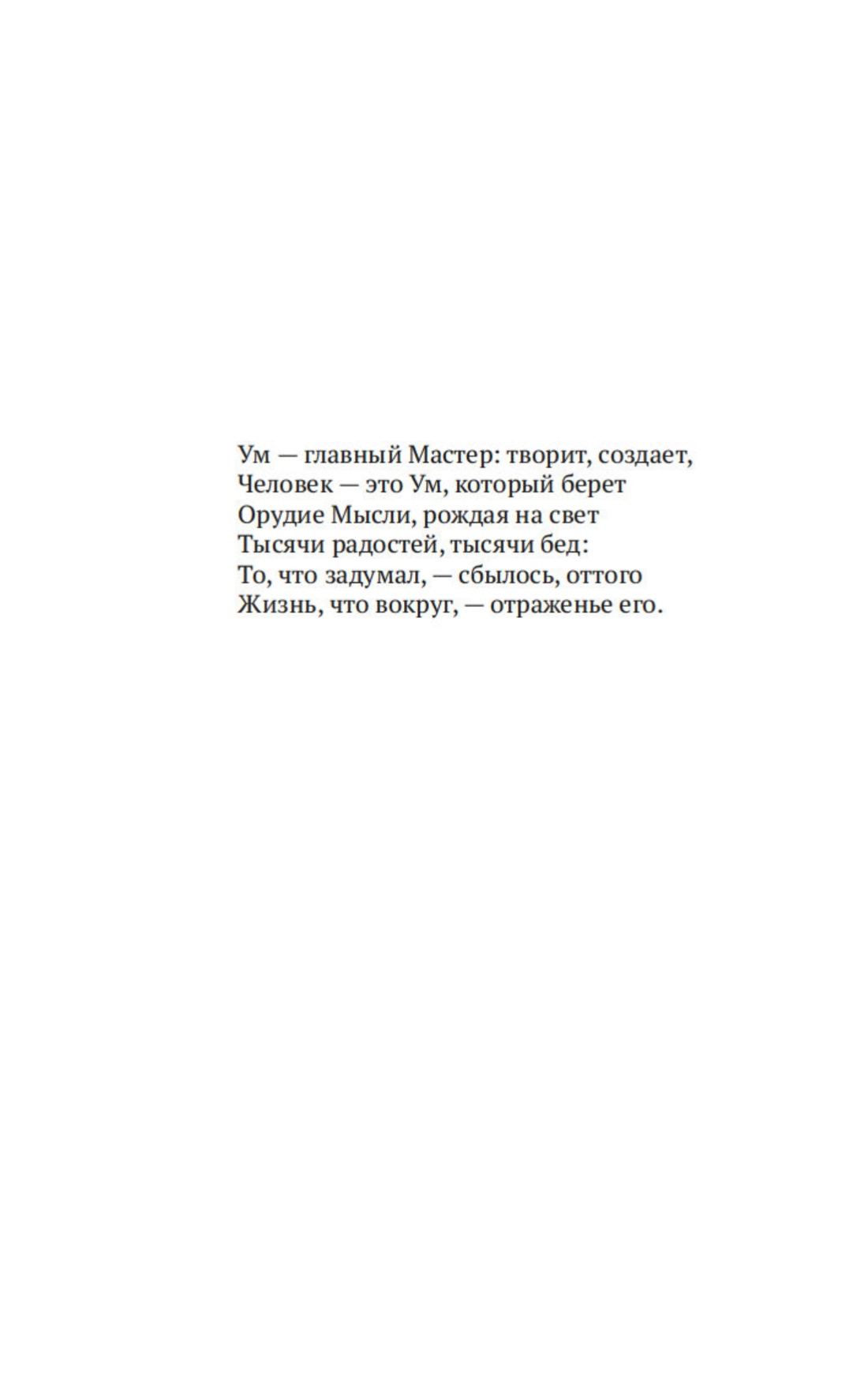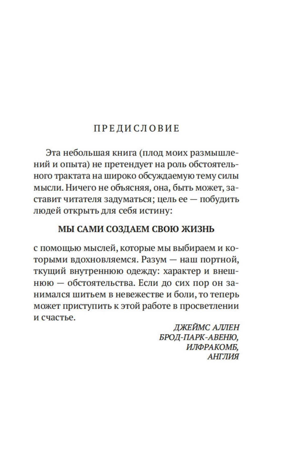 Джеймс Аллен (1864–1912) — известный британский философ и поэт, один из зачинателей жанра «мотивационной литературы». Его работа «Как мыслит человек», опубликованная в 1903 году, до сих пор остается одним из самых цитируемых текстов в мире и привлекает внимание всех любителей книг по саморазвитию. Как управлять своей жизнью? Как достичь процветания и завоевать симпатию и доверие окружающих? Как избежать страданий и неудач? На эти и другие вопросы Джеймс Аллен дает вполне определенные, очень практичные ответы, нисколько не устаревшие за прошедший век.