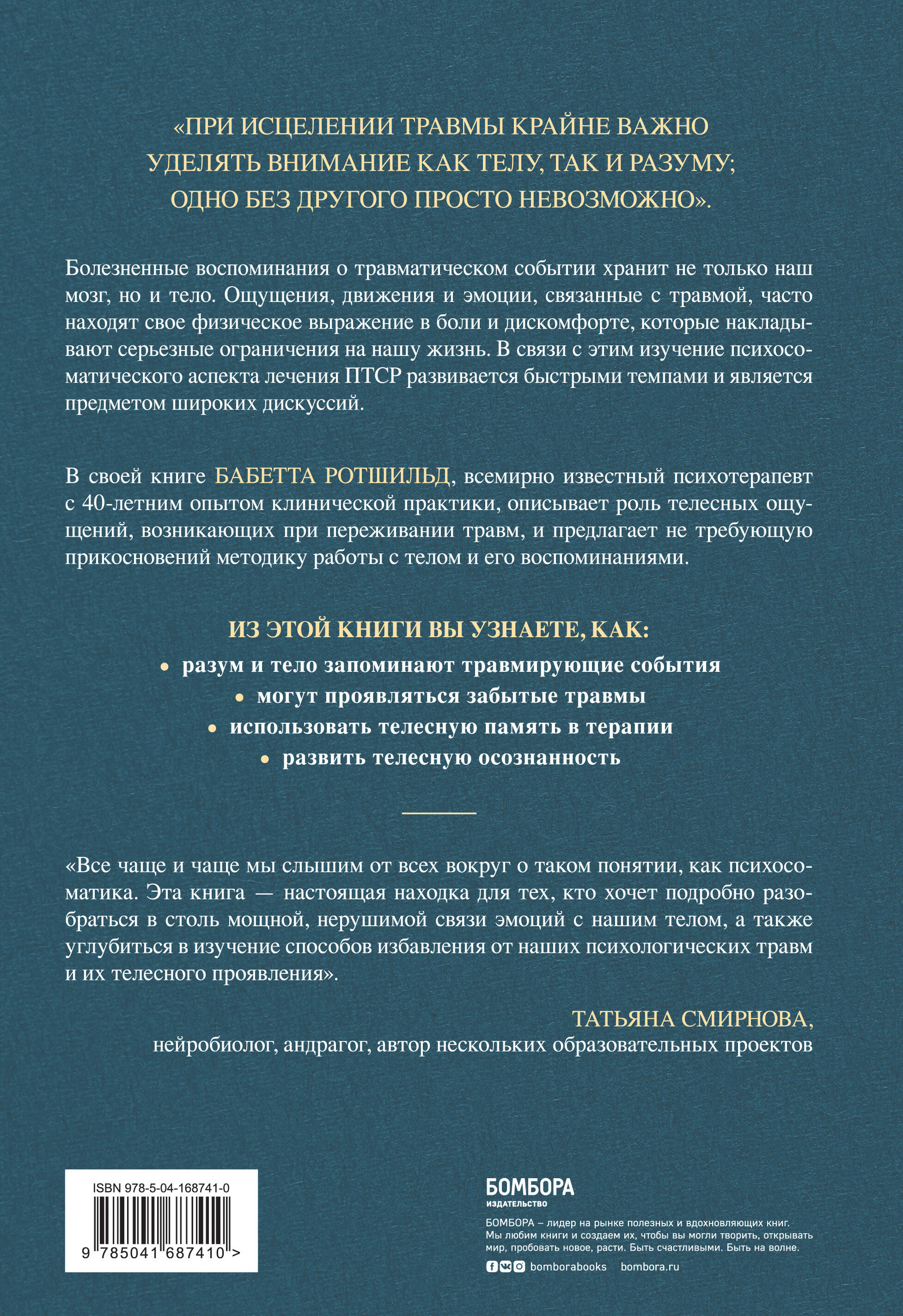 В своей книге Бабетта Ротшильд, всемирно известный психотерапевт с 40-летним опытом клинической практики, описывает роль телесных ощущений и реакций, которые возникают после пережитых травм и стресса. Соединив в терапии вербальный и телесно-ориентированный подходы, клиницист предлагает не требующую прикосновений методику работы с телом и его воспоминаниями для лечения посттравматического стрессового расстройства.