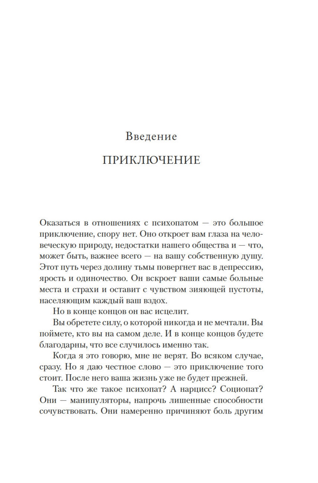 «Что же такое психопат? А нарцисс? Социопат? Они — манипуляторы, напрочь лишенные способности сочувствовать. Они намеренно причиняют боль другим людям и при этом не ощущают никакой вины и не считают себя ответственными. Между тремя этими типами есть некоторая разница, но главное — то, что их отношения с другими людьми развиваются по абсолютно предсказуемому циклу: "идеализировать — обесценить — выкинуть на помойку”.