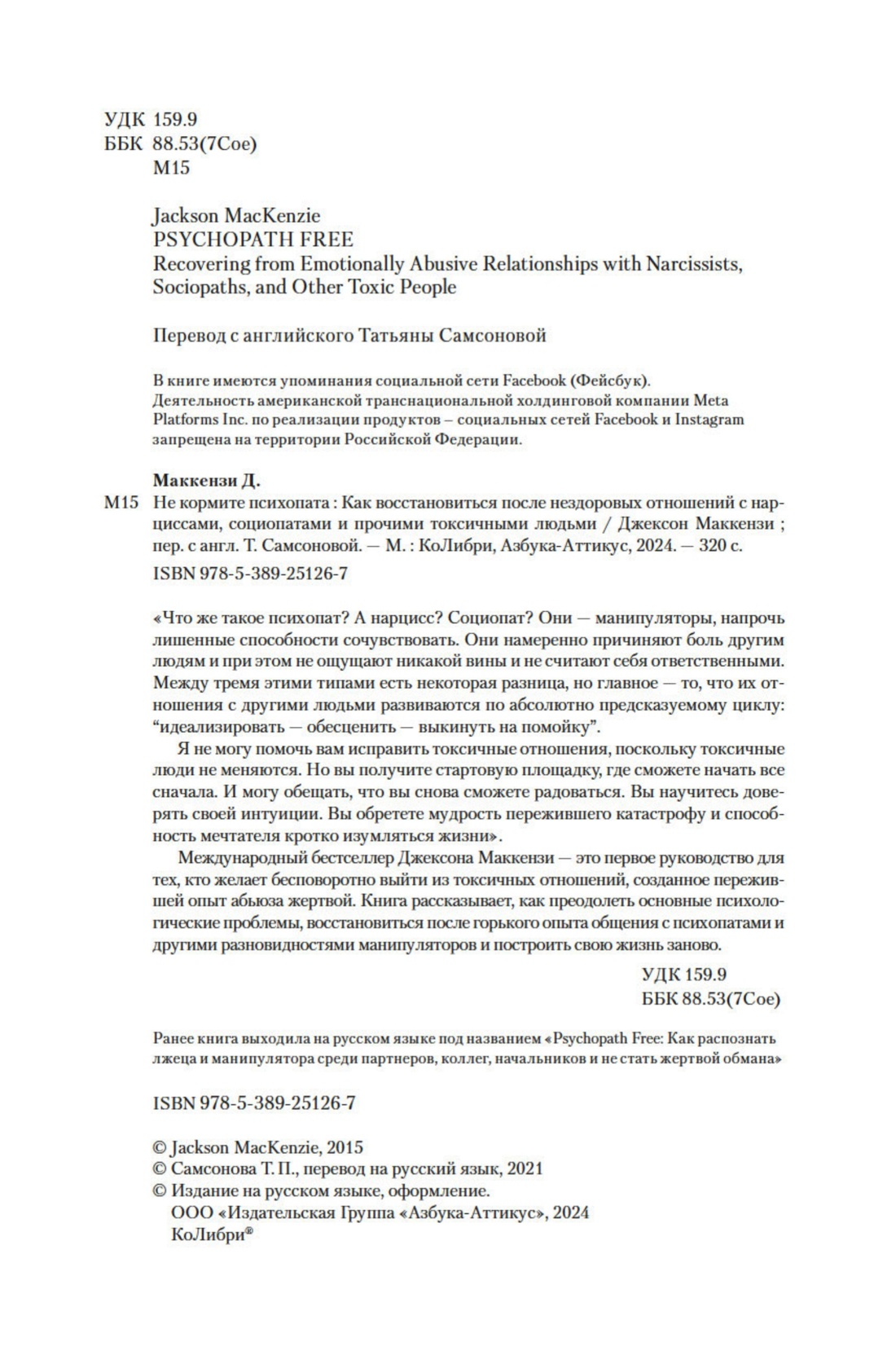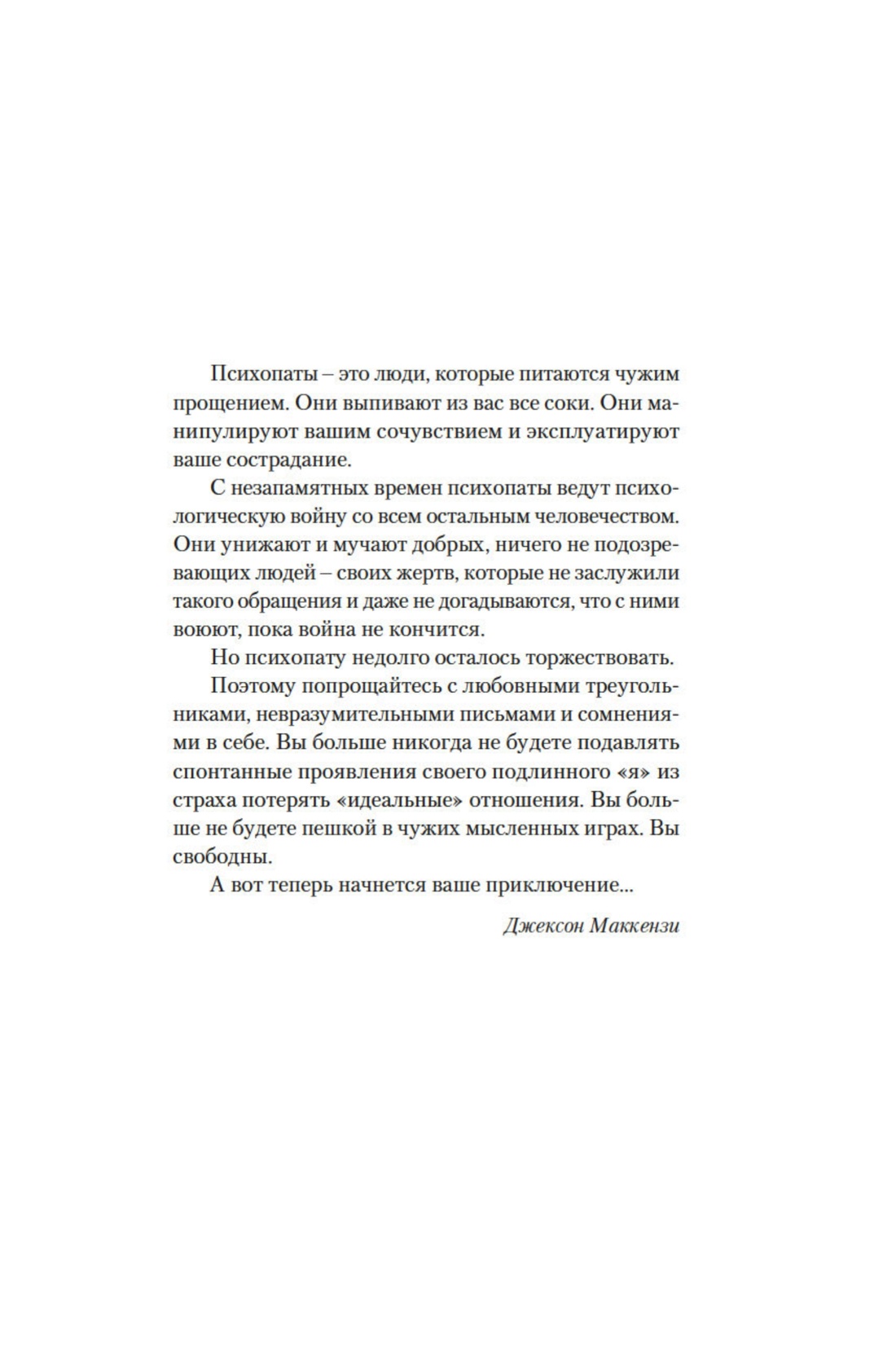 Международный бестселлер Джексона Маккензи — это первое руководство для тех, кто желает бесповоротно выйти из токсичных отношений, созданное пережившей опыт абьюза жертвой. Книга рассказывает, как преодолеть основные психологические проблемы, восстановиться после горького опыта общения с психопатами и другими разновидностями манипуляторов и построить свою жизнь заново.