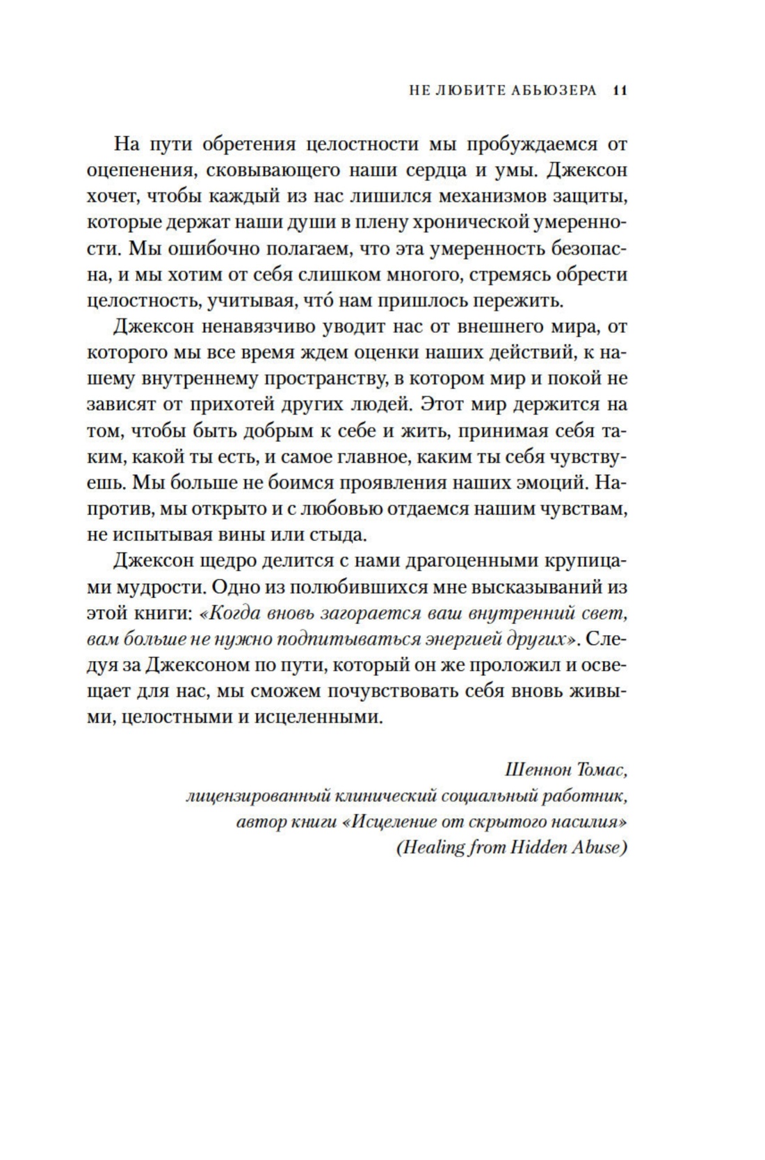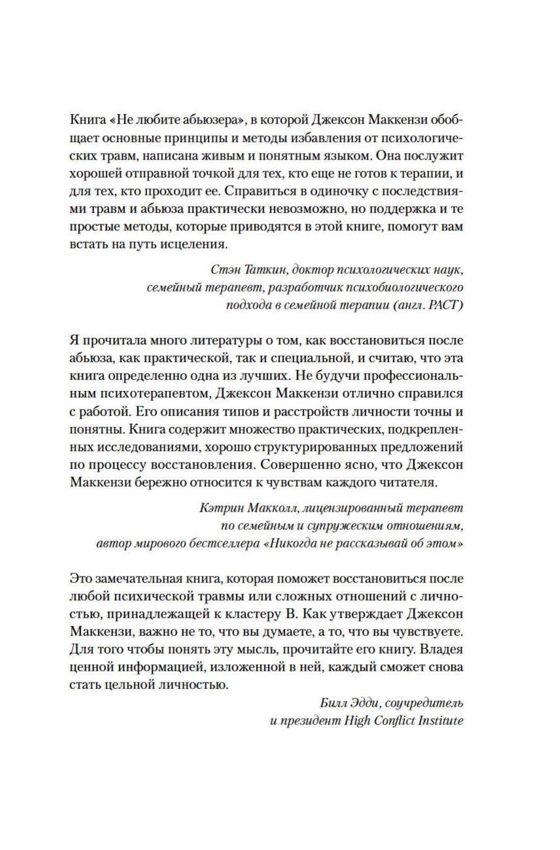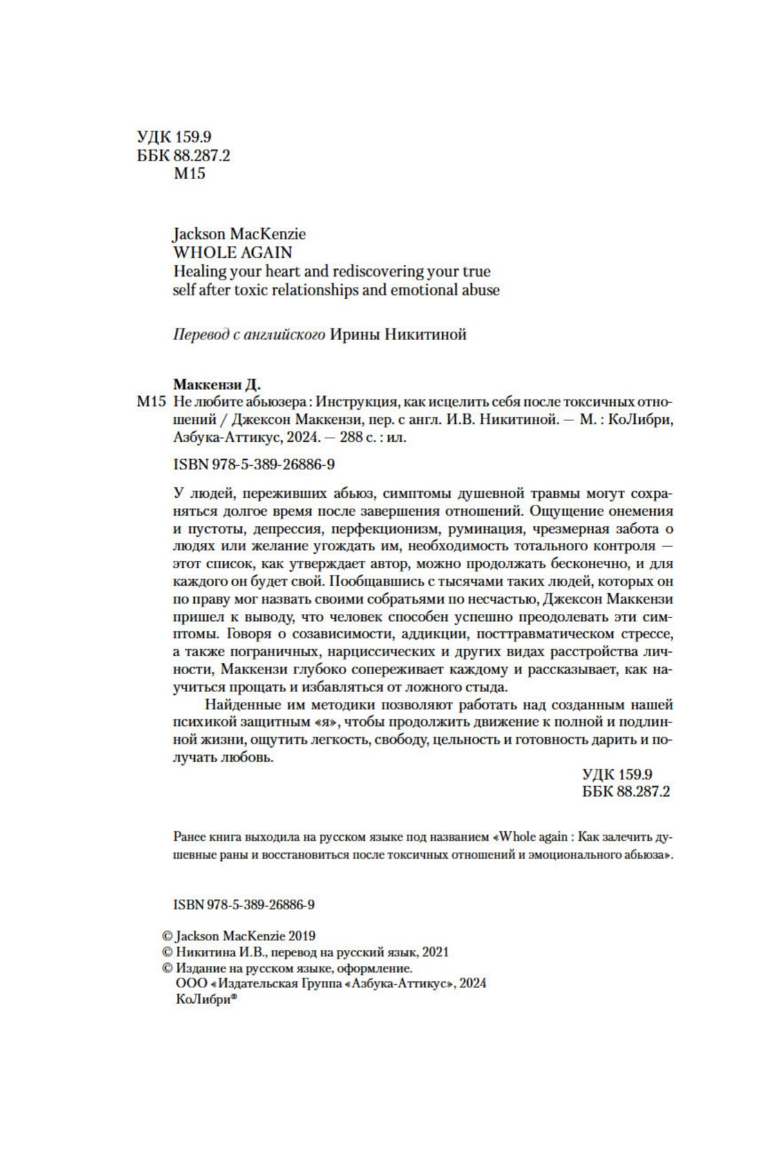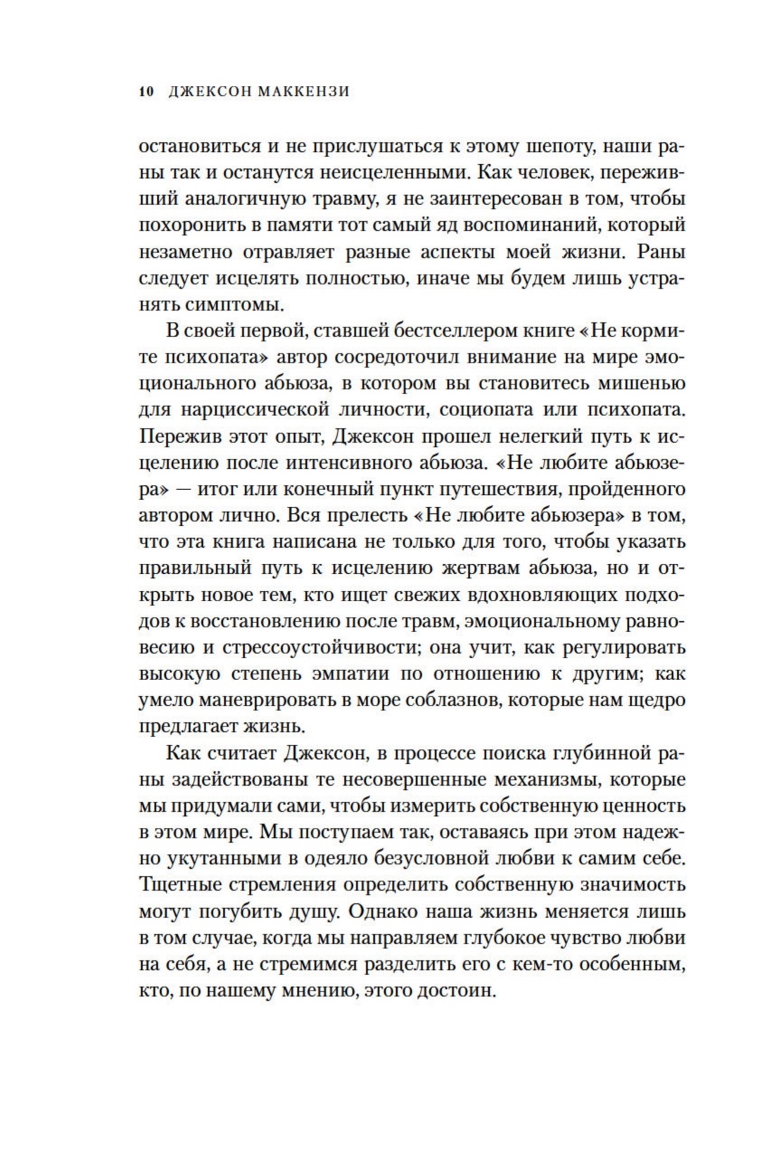 У людей, переживших абьюз, симптомы душевной травмы могут сохраняться долгое время после завершения отношений. Ощущение онемения и пустоты, депрессия, перфекционизм, руминация, чрезмерная забота о людях или желание угождать им, необходимость тотального контроля — этот список, как утверждает автор, можно продолжать бесконечно, и для каждого он будет свой. Пообщавшись с тысячами таких людей, которых он по праву мог назвать своими собратьями по несчастью, Джексон Маккензи пришел к выводу, что человек способен успешно преодолевать эти симптомы. Говоря о созависимости, аддикции, посттравматическом стрессе, а также пограничных, нарциссических и других видах расстройства личности, Маккензи глубоко сопереживает каждому и рассказывает, как научиться прощать и избавляться от ложного стыда.