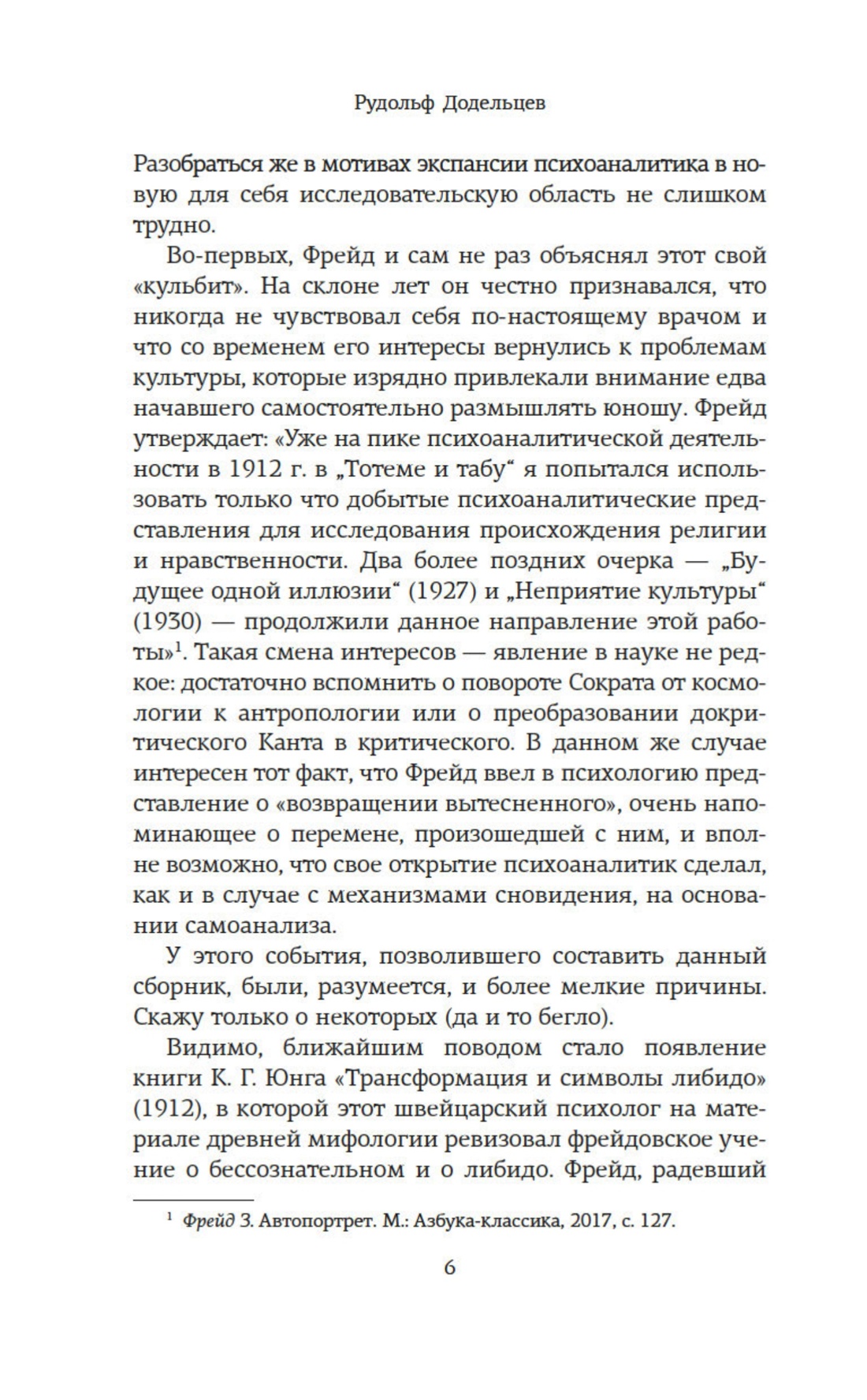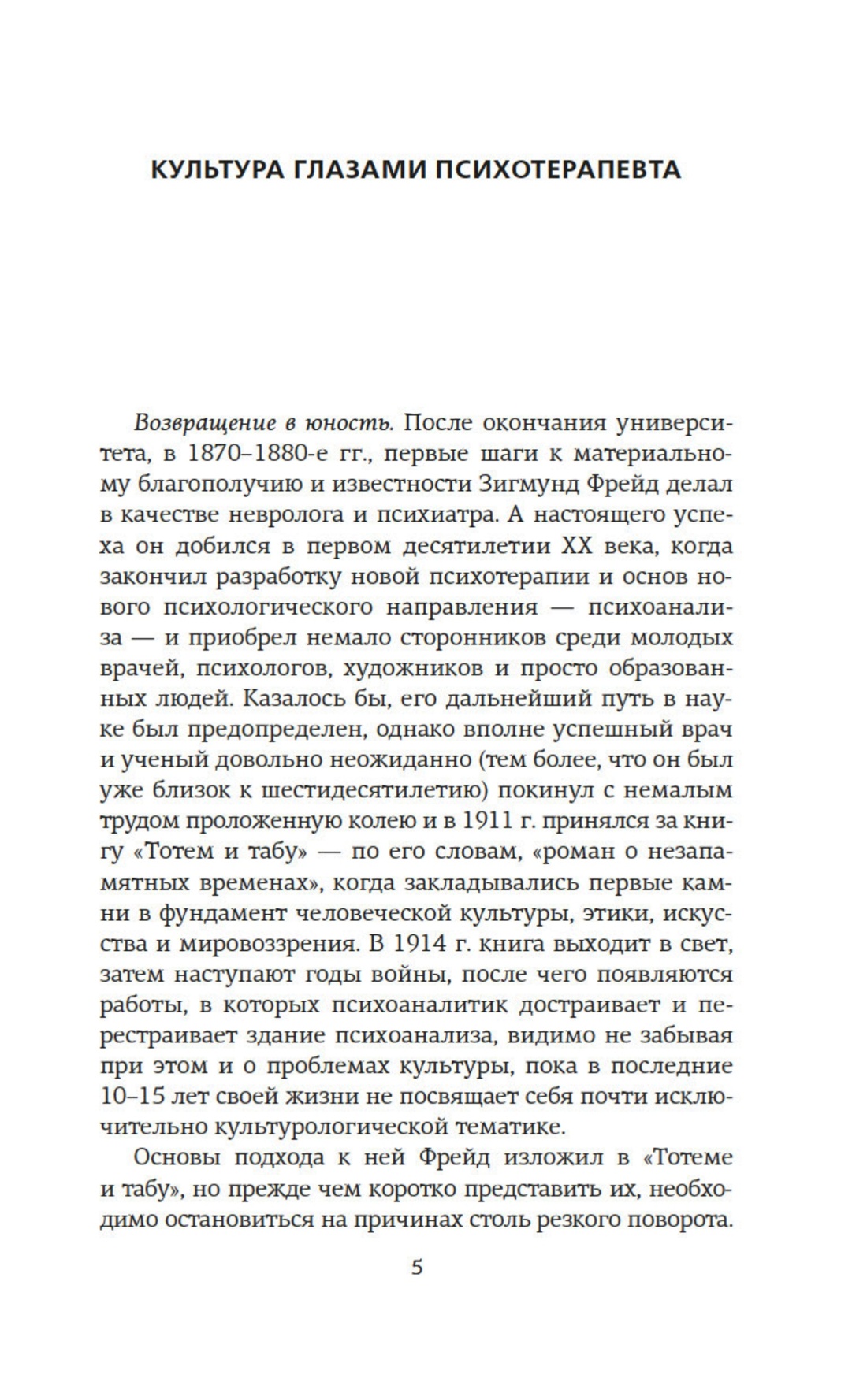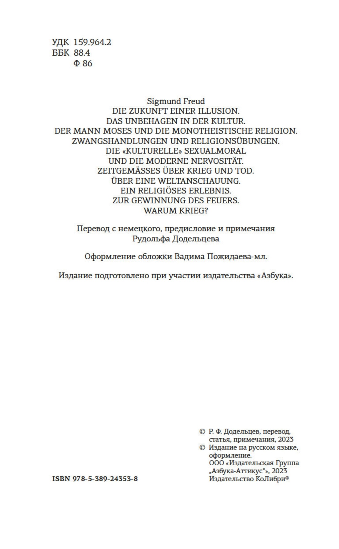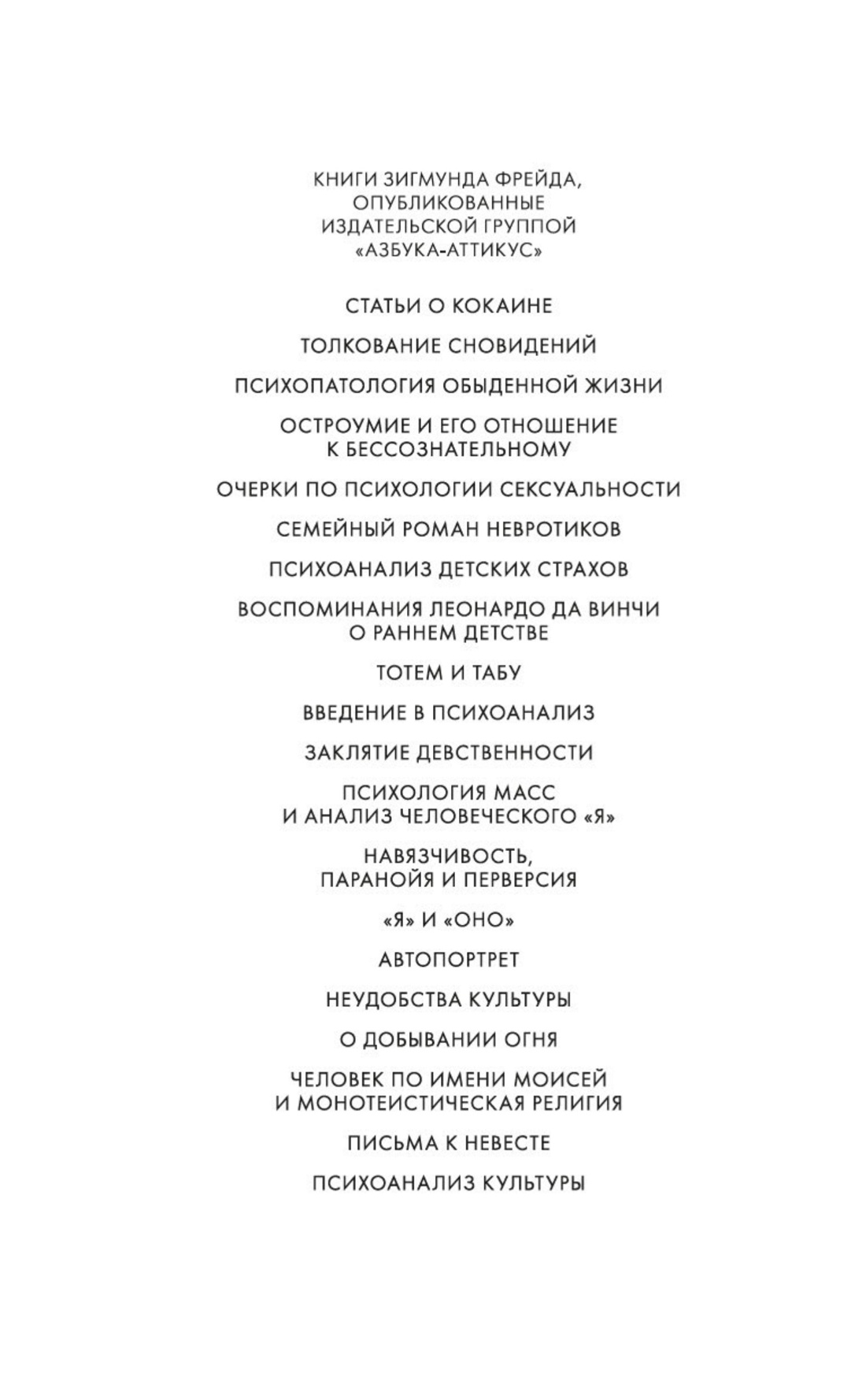 С развитием психоанализа Зигмунд Фрейд все чаще обращался к культурологии, применяя психоаналитический подход к проблемам культуры и человеческой психологии в ее контексте. В настоящий сборник вошли основные работы Фрейда по психологии культуры — помимо прочего, труд «Будущее одной иллюзии», посвященный судьбе религии в современном мире; программный трактат «Неприятие культуры», где Фрейд рассуждает о неизбывном конфликте человека с цивилизацией, которая принуждает любого члена общества к труду и подавлению естественных влечений — сексуальных и деструктивных; «Человек по имени Моисей и монотеизм» — плод многолетнего интереса Фрейда к личности и мифу пророка Моисея как центральной фигуры еврейской и христианской мифологии; открытое письмо Альберту Эйнштейну о природе войны; и другие работы, посвященные динамическим отношениям культуры и ее носителей.