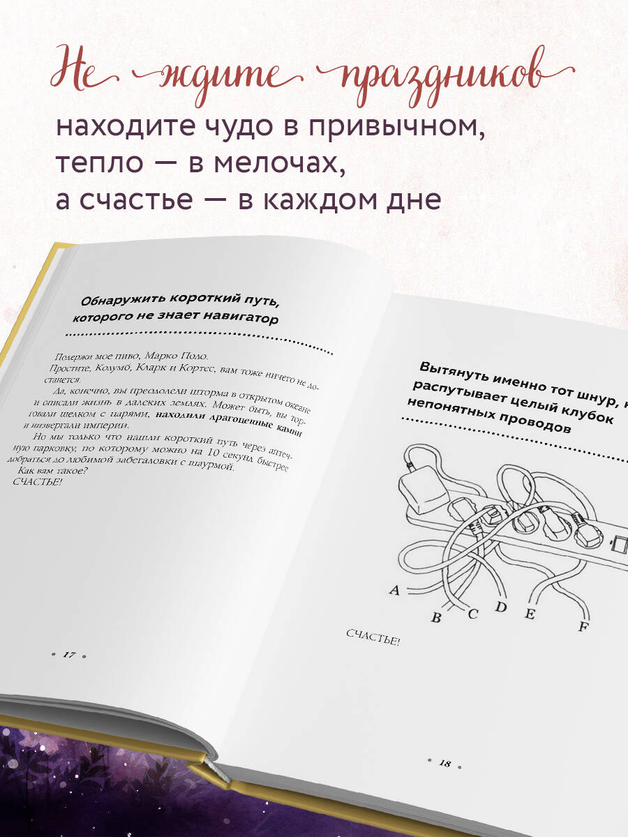 В книге вы найдете пространства для заметок. Следуя призыву автора, мы предлагаем вам стать соавторами этой книги и дополнить ее своими зарисовками о счастье. Менять фокус, видеть прекрасное в привычном, удивляться — вот оно