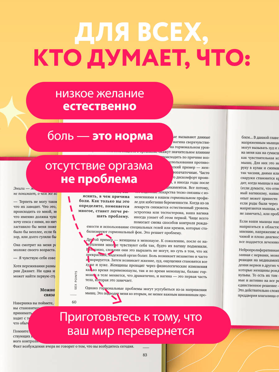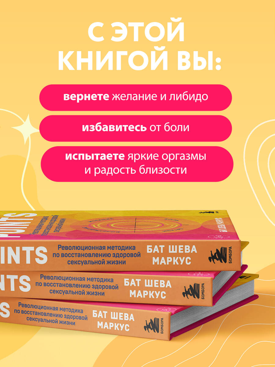 «Эта книга говорит: ты не одинока в своих проблемах, и тебе доступен классный секс, если ты готова взять свою сексуальную жизнь под контроль. Доктор Бат Шева предлагает простую систему, которая позволит каждой женщине разложить проблемы в интимной жизни по полочкам и начать наслаждаться сексом вне зависимости от возраста, физиологических изменений и наличия партнера. “Sex points” вдохновляет на изменения и дает в руки все инструменты для них». — Екатерина Манькова, автор Telegram-канала и книги «Катины секреты»