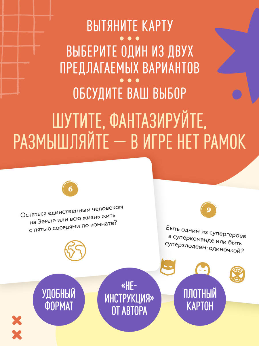 На каждой карточке веселый, неожиданный или серьезный вопрос с двумя вариантами ответа. Выберите один из них, и вскоре вас увлечет захватывающая дискуссия! Вопросы ставят участников перед моральным выбором или переносят в необычные ситуации, где нужно быстро сориентироваться и принять решение. Игра поможет понять интересы каждого участника, развивает эмоциональный интеллект и критическое мышление. Она подталкивает подростков и родителей к откровенности и теплому, дружескому общению. Правил нет — каждый может проявить фантазию и придумать свои условия.