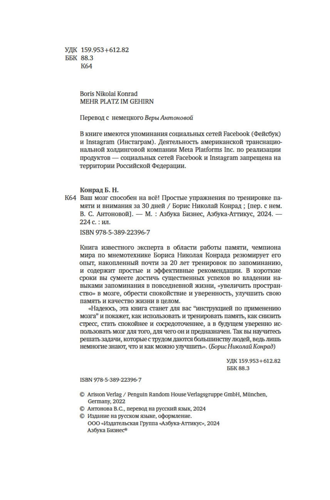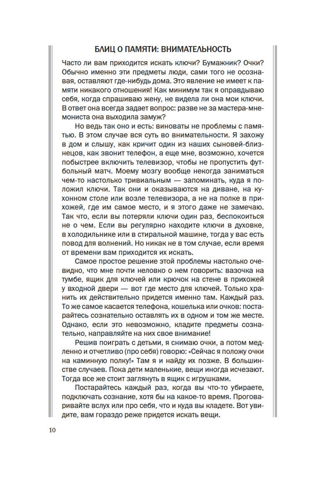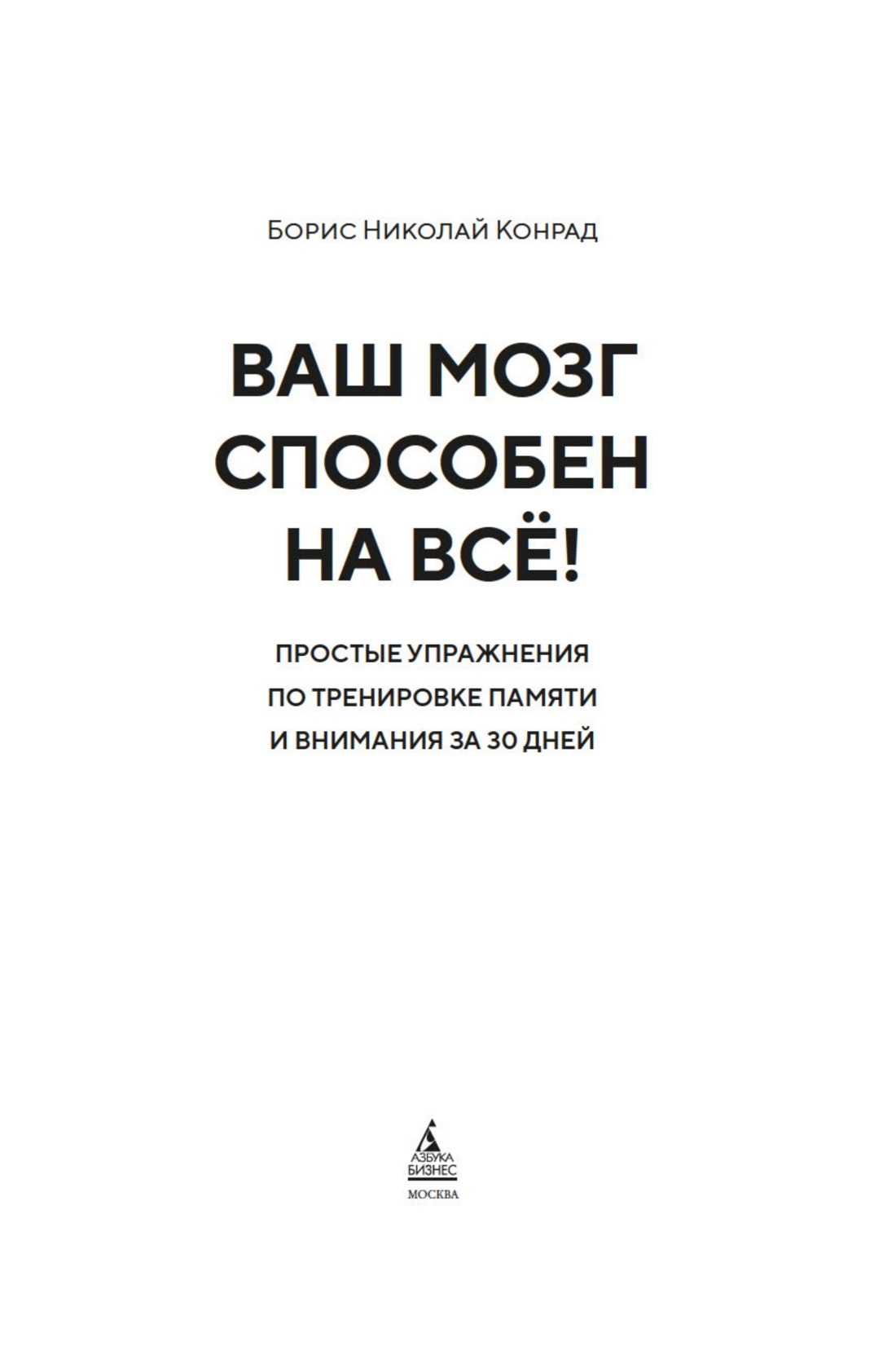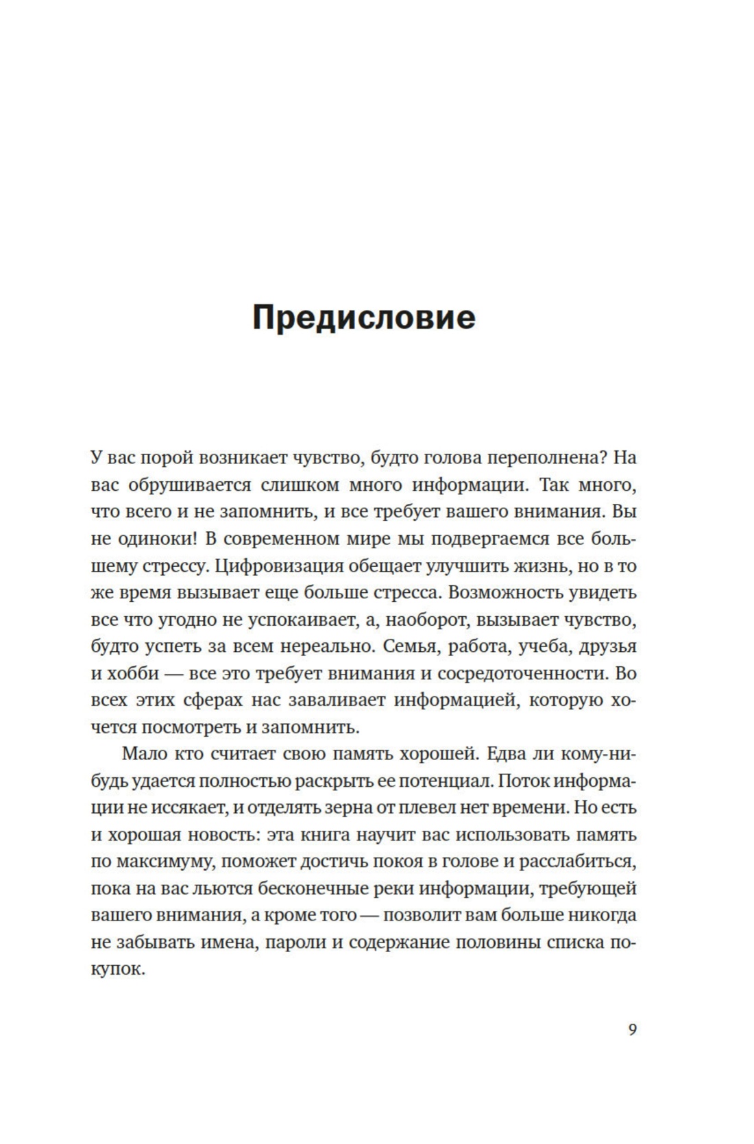 Книга известного эксперта в области работы памяти, чемпиона мира по мнемотехнике Бориса Николая Конрада резюмирует его опыт, накопленный почти за 20 лет тренировок по запоминанию, и содержит простые и эффективные рекомендации. В короткие сроки вы сумеете достичь существенных успехов во владении на выками запоминания в повседневной жизни, «увеличить простран ство» в мозге, обрести спокойствие и уверенность, улучшить свою память и качество жизни в целом. «Надеюсь, эта книга станет для вас “инструкцией по применению мозга” и покажет, как использовать и тренировать память, как снизить стресс, стать спокойнее и сосредоточеннее, а в будущем уверенно ис пользовать мозг для того, для чего он и предназначен. Так вы научитесь решать задачи, которые с трудом даются большинству людей, ведь лишь немногие знают, что и как можно улучшить». (Борис Николай Конрад)
